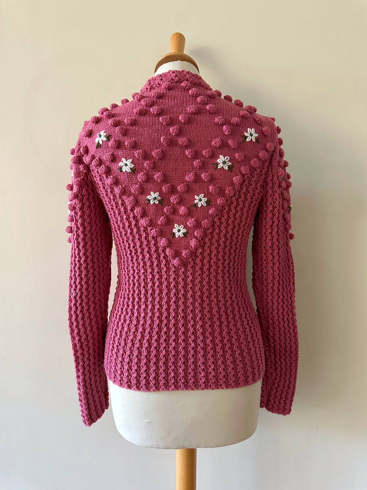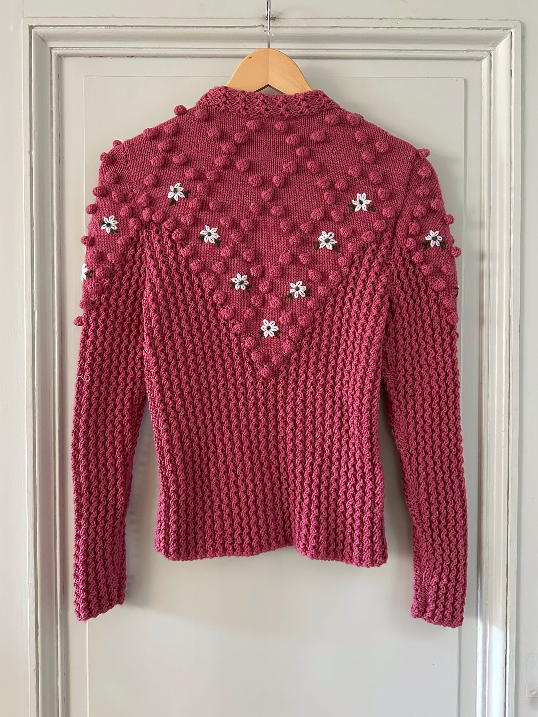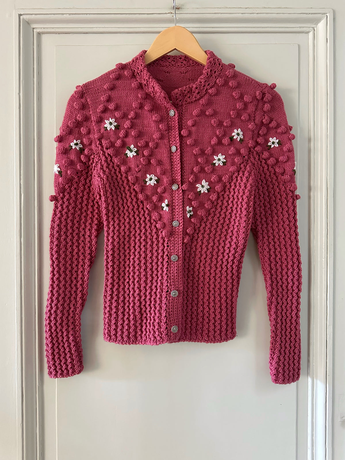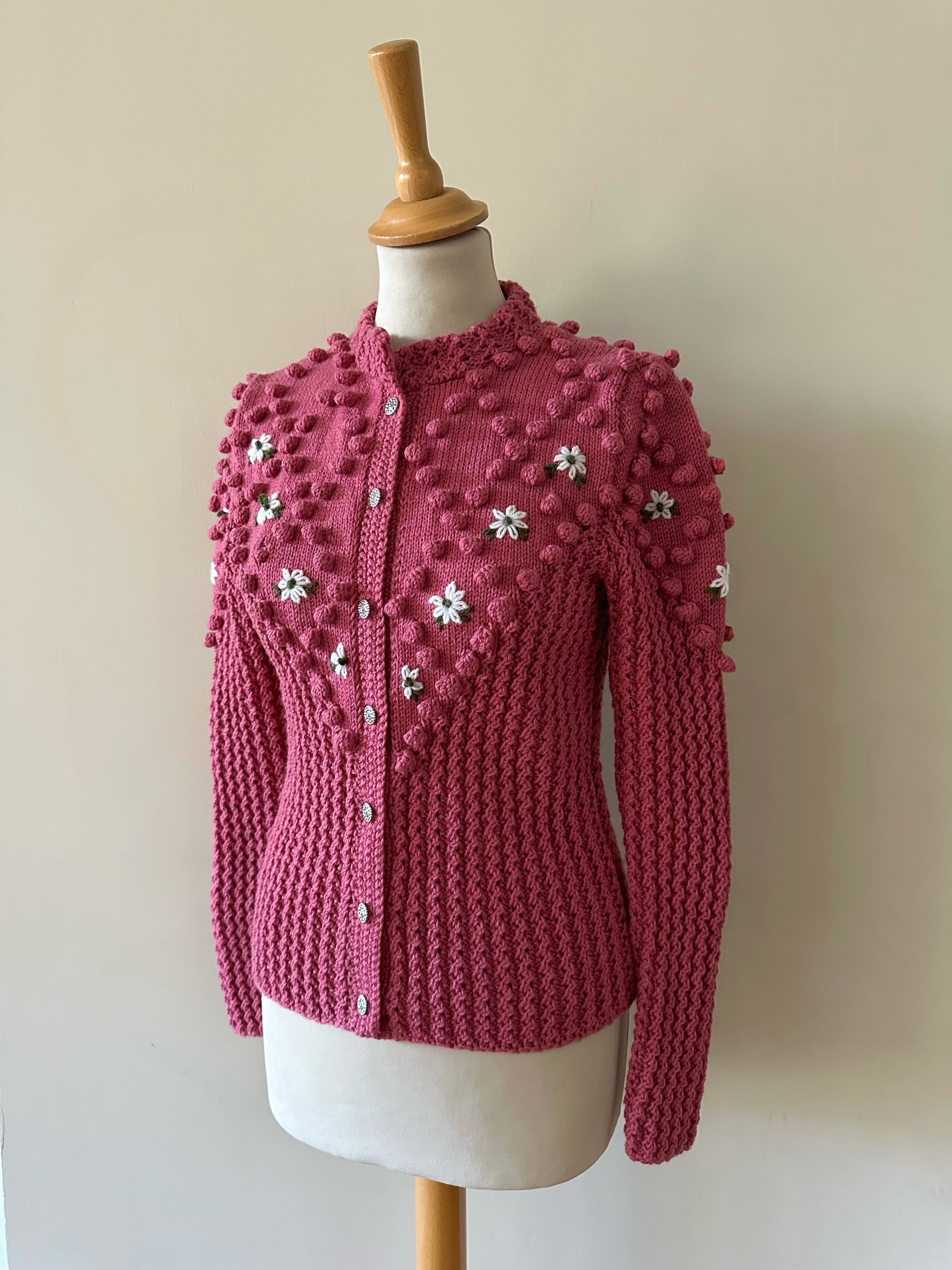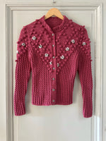 Prix unitaire parCardigan Autrichien, en laine mélangée bois de rose, maille pompons brodés, brodé de fleurs blanches et vertes, manches ballons, boutons bijoux argentés, tricoté main en Autriche, taille 36 porté ici sur un mannequin T36. Longueur dos 55cm Aisselles 44cm.