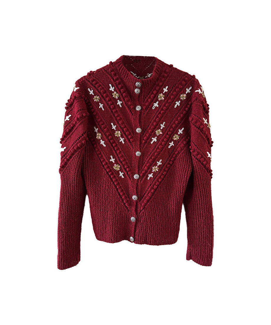 Prix unitaire parCardigan autrichien en laine mélangée rouge bordeaux, maille ajourée et pompons brodés, fleurs brodées roses pastel, vert olive et bleues ciel. Boutons bijoux argentés fleuris, tricoté mains en Autriche. Taille 38 porté ici sur un mannequin T36 et sur une personne T40. Aisselles 48cm Longueur 58cm.