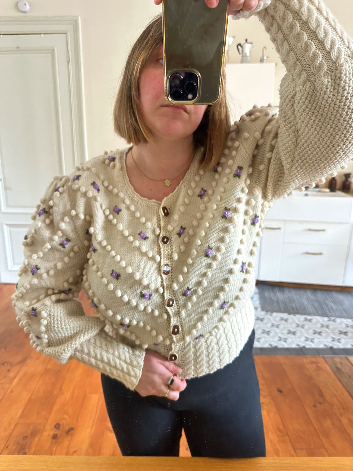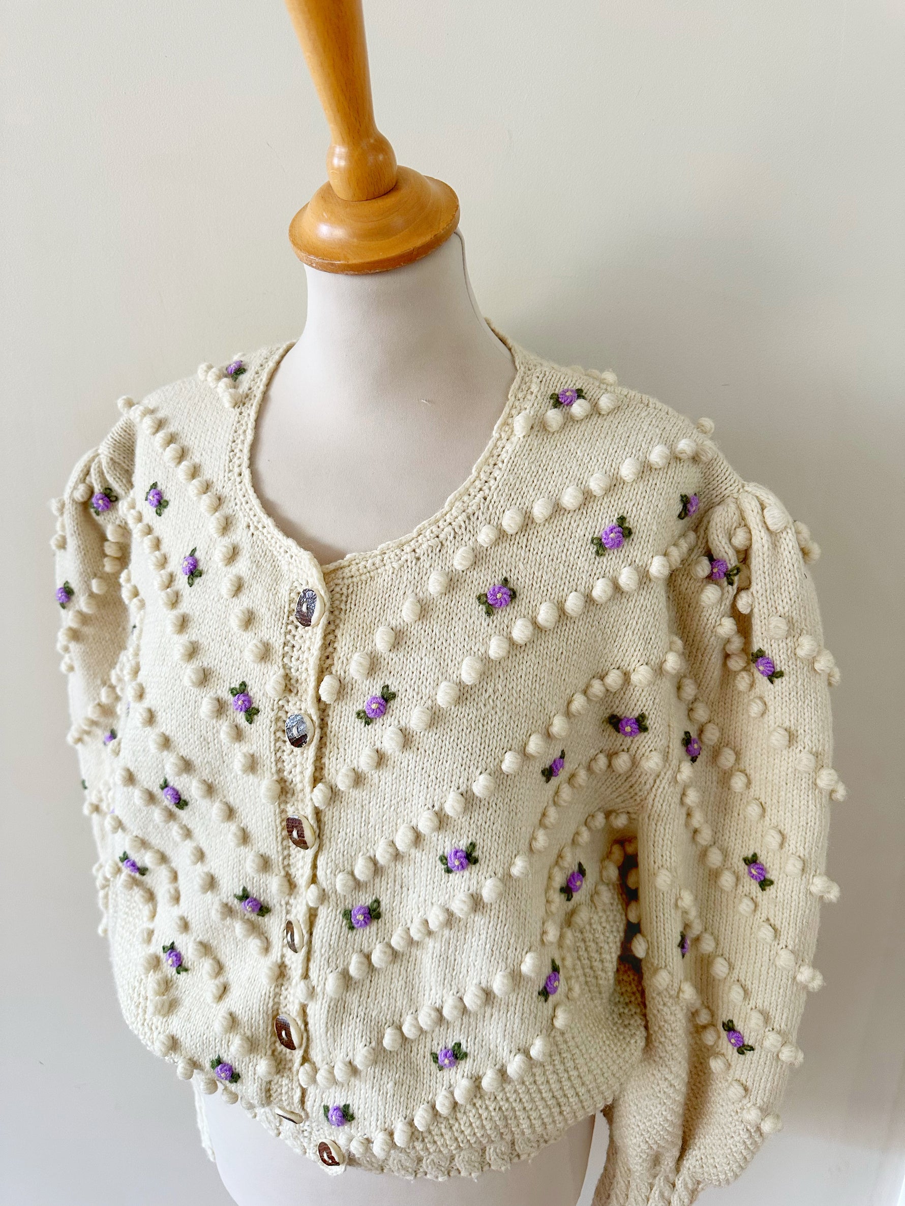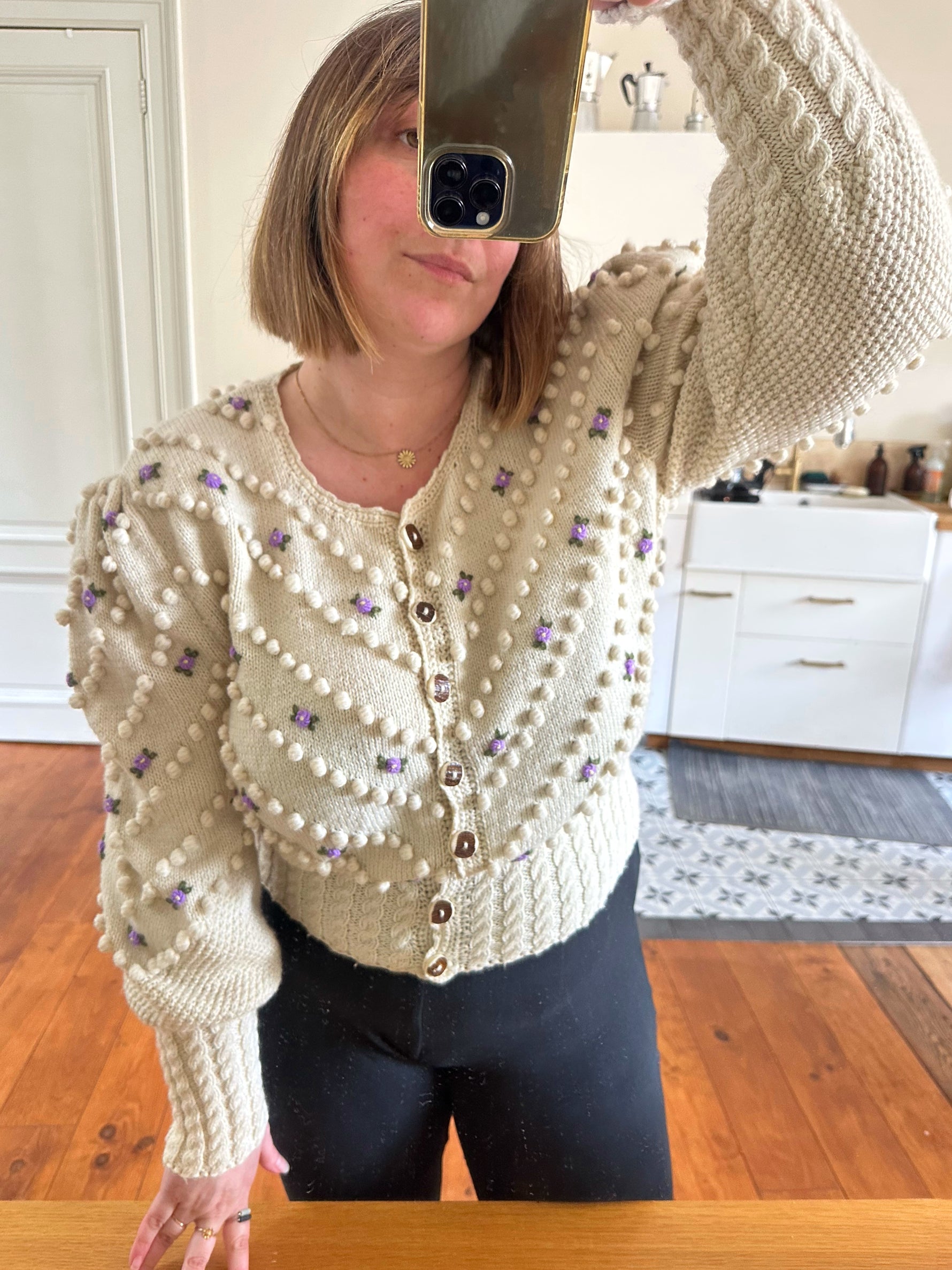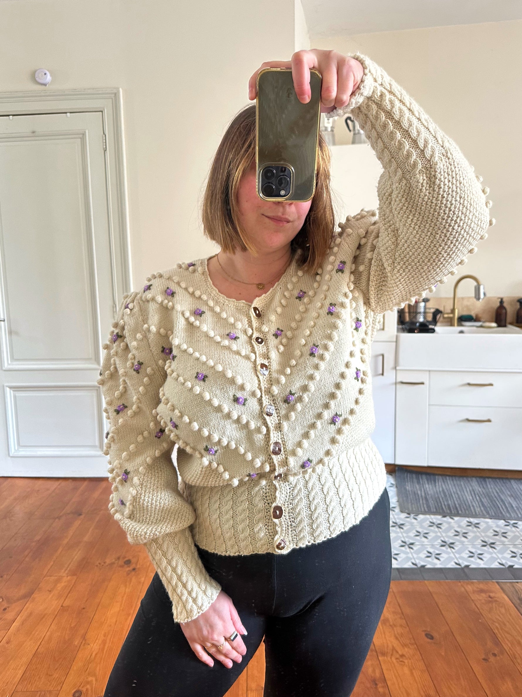 Prix unitaire parCardigan Autrichien en laine écrue, maille pompons popcorn pompons et brodé de fleurs lilas et vertes, bordure en crochet, boutons en corne, fabriqué en Autriche. Convient aux tailles 38 et 40 porté ici sur une personne T40 et sur un mannequin T36. Aisselles 48cm Longueur 56cm.