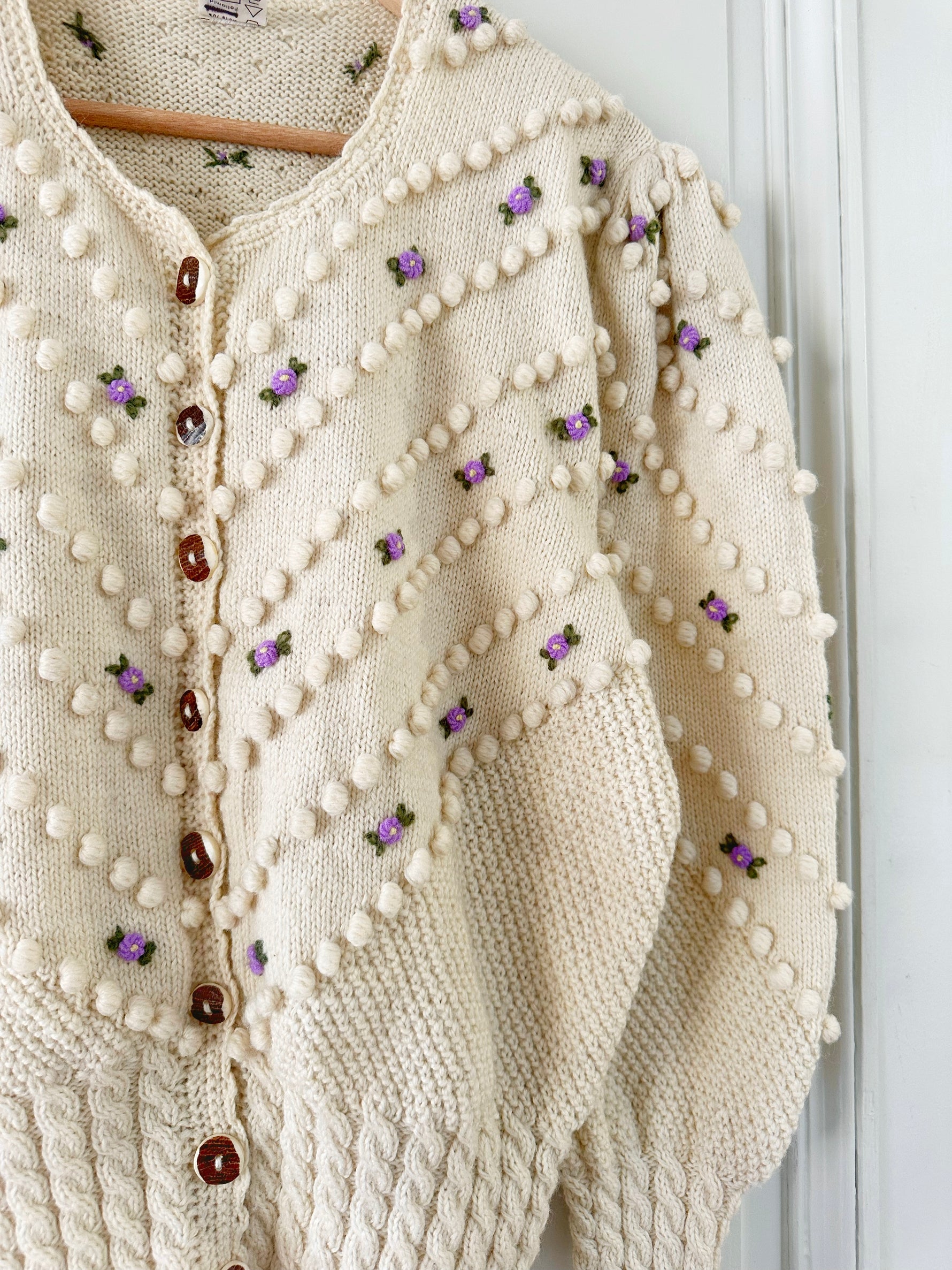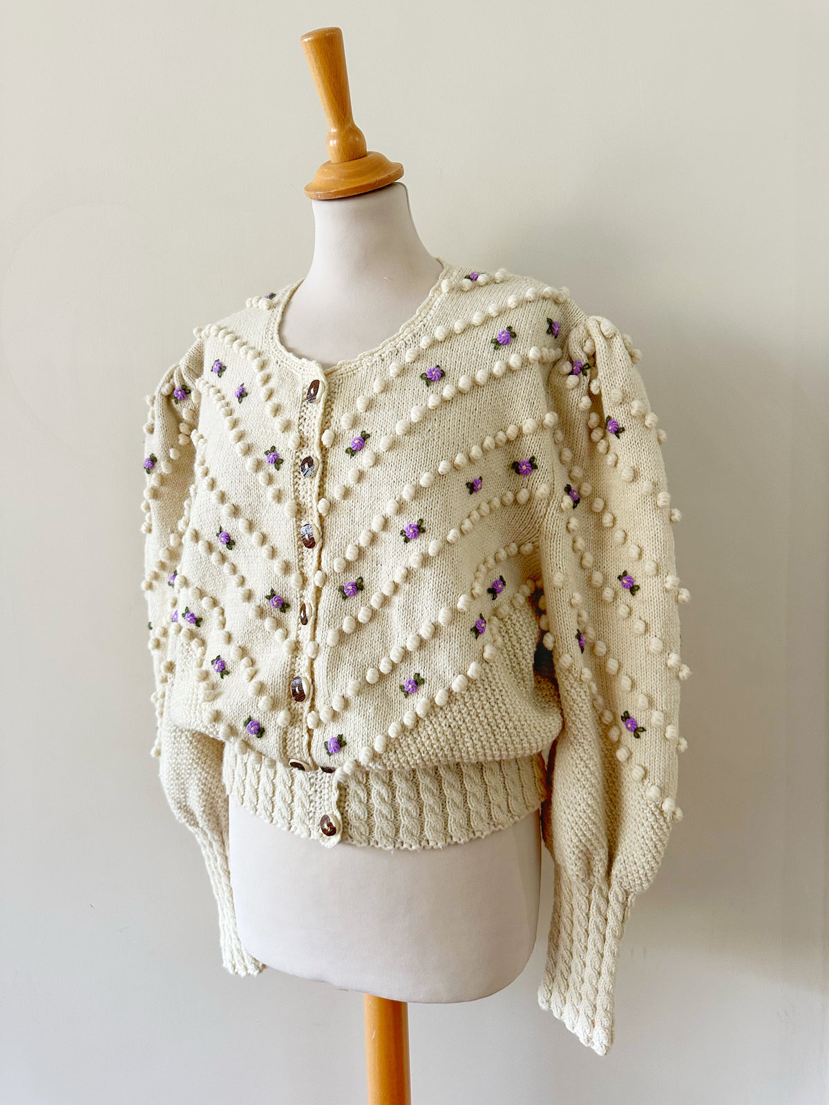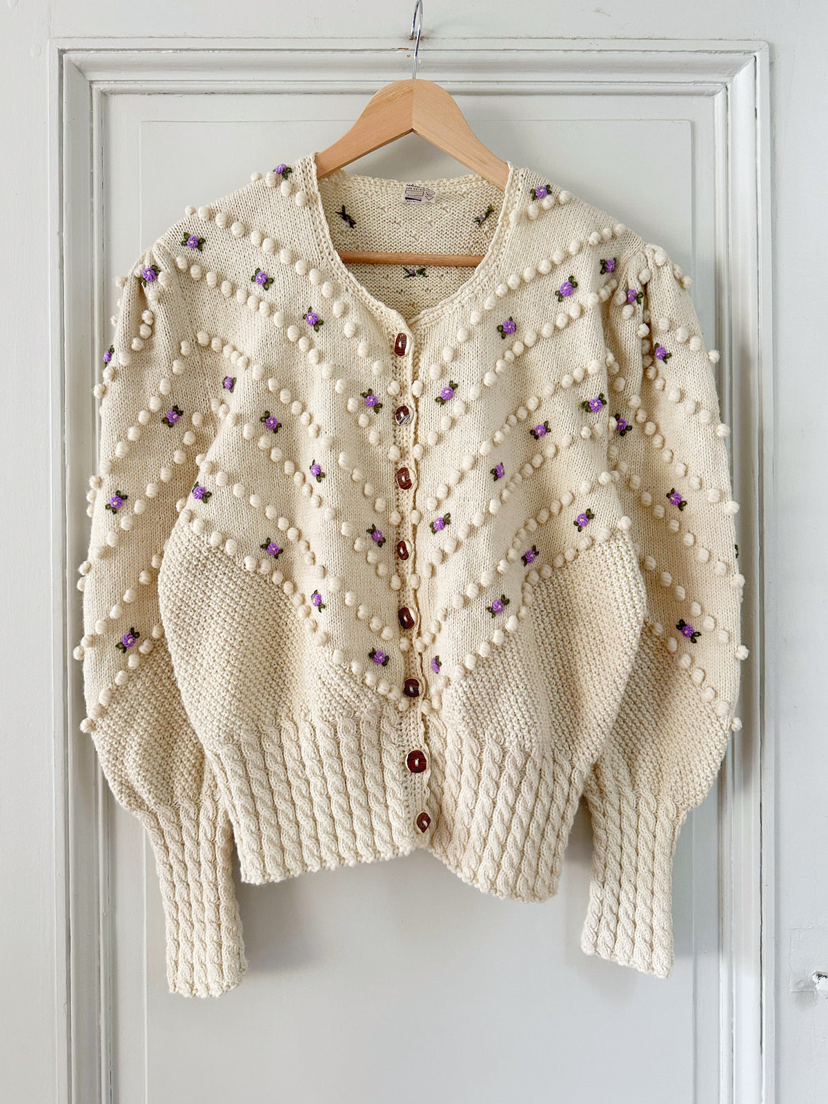 Prix unitaire parCardigan Autrichien en laine écrue, maille pompons popcorn pompons et brodé de fleurs lilas et vertes, bordure en crochet, boutons en corne, fabriqué en Autriche. Convient aux tailles 38 et 40 porté ici sur une personne T40 et sur un mannequin T36. Aisselles 48cm Longueur 56cm.