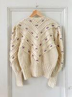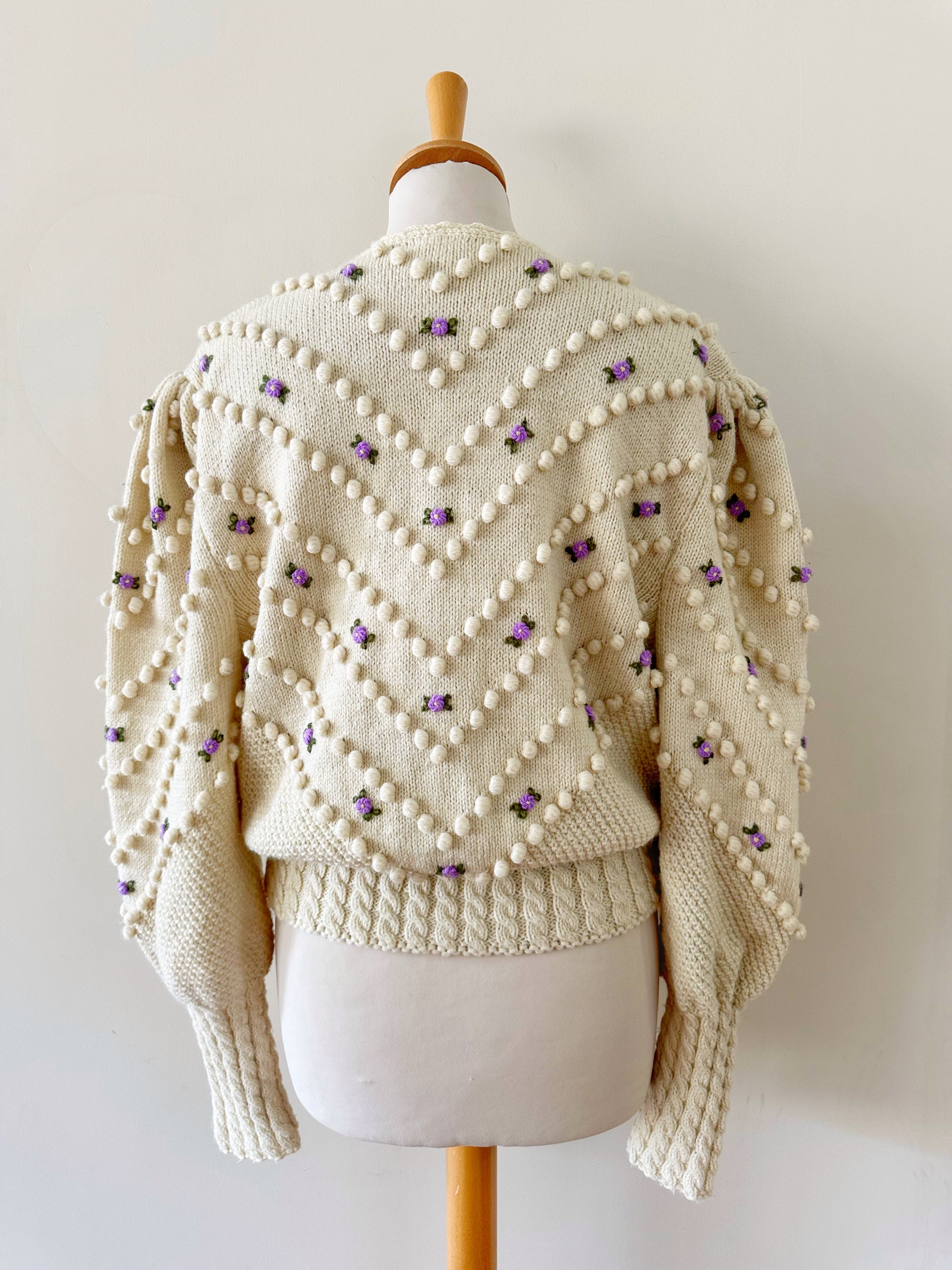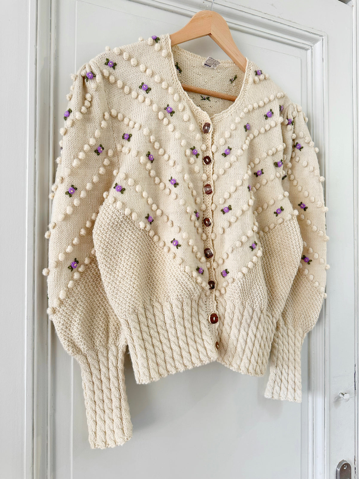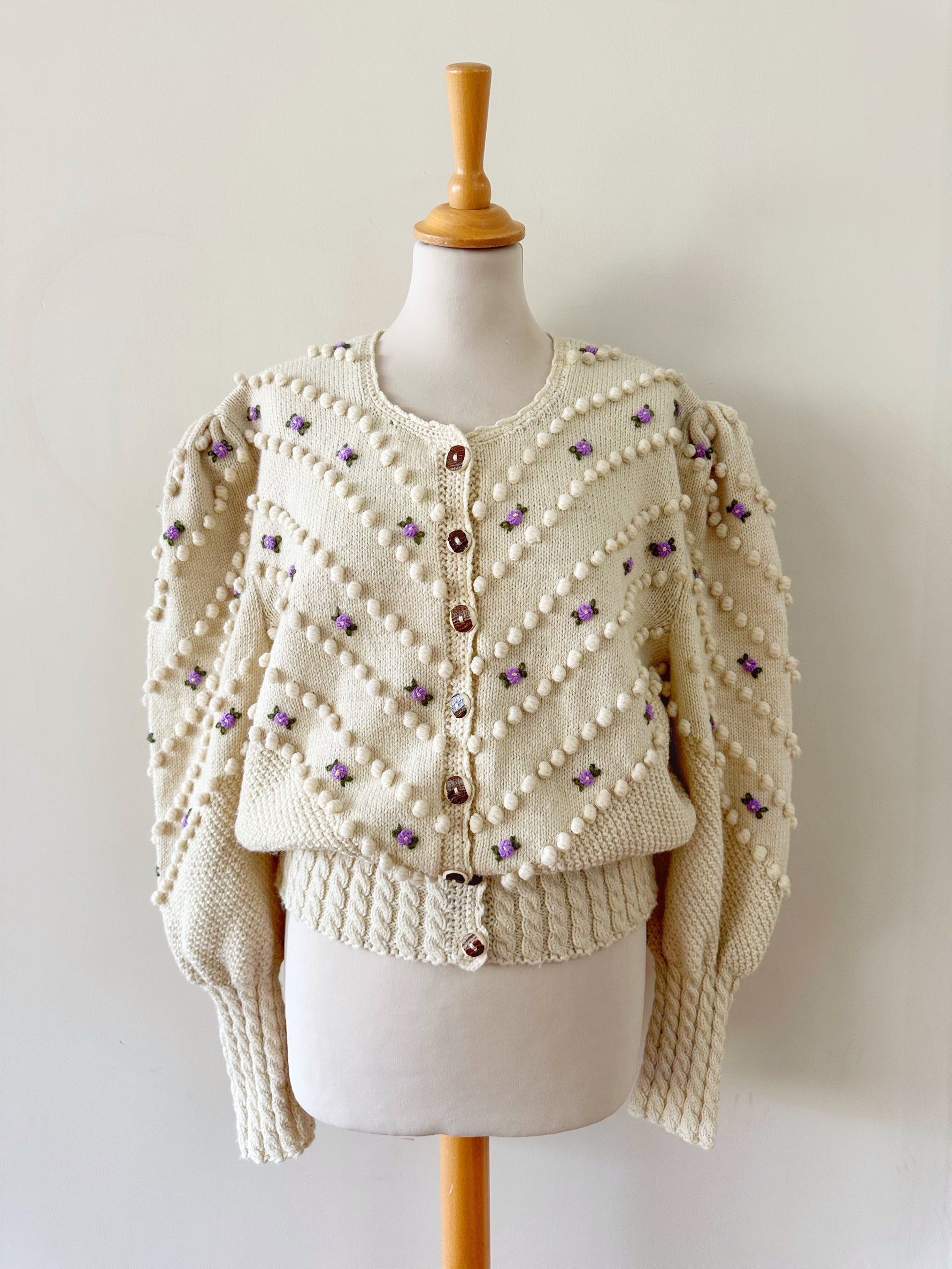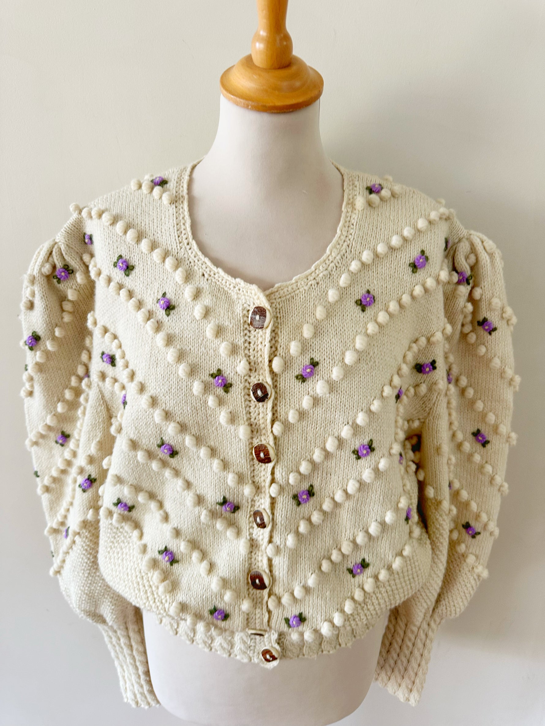 Prix unitaire parCardigan Autrichien en laine écrue, maille pompons popcorn pompons et brodé de fleurs lilas et vertes, bordure en crochet, boutons en corne, fabriqué en Autriche. Convient aux tailles 38 et 40 porté ici sur une personne T40 et sur un mannequin T36. Aisselles 48cm Longueur 56cm.
