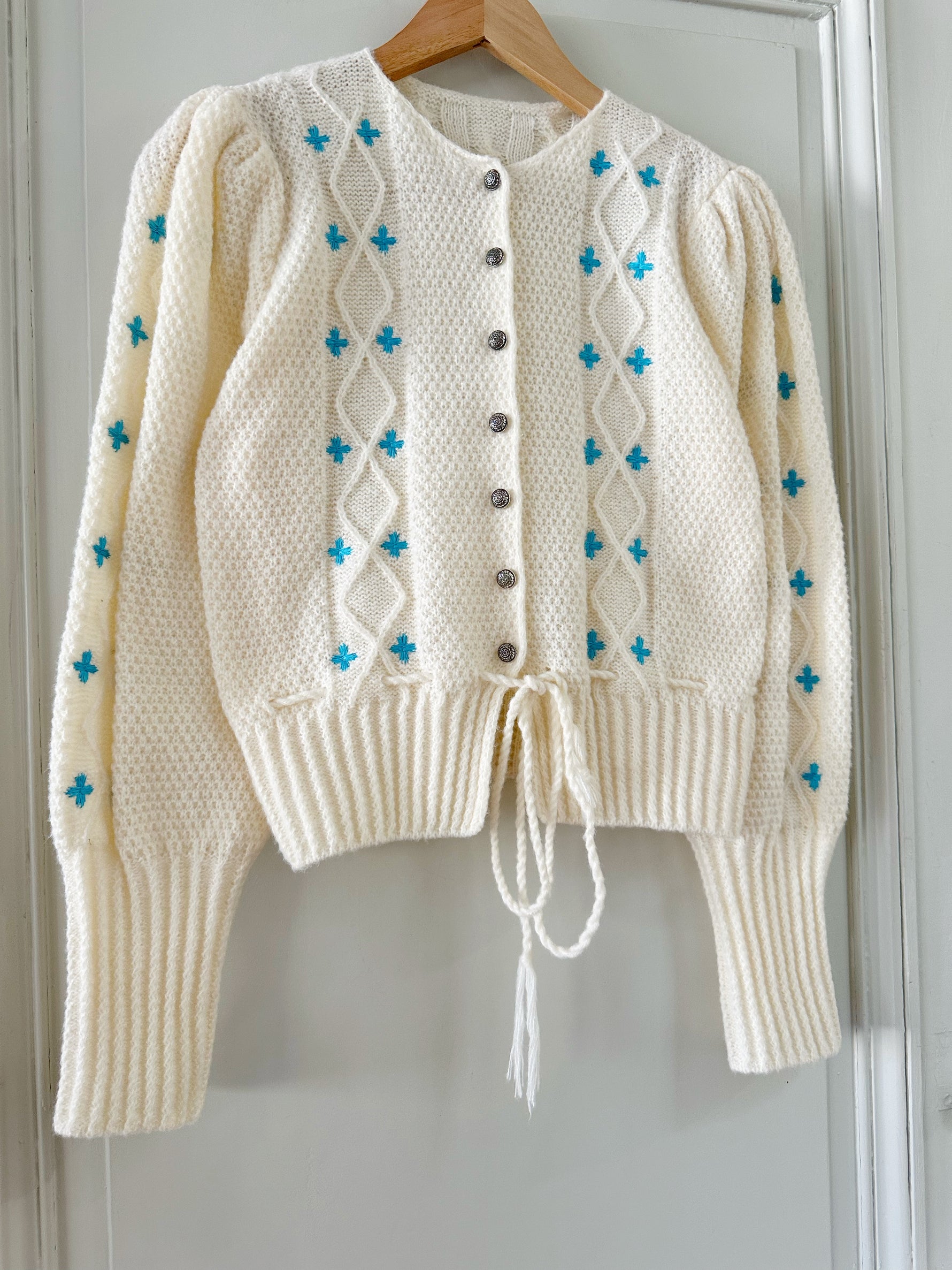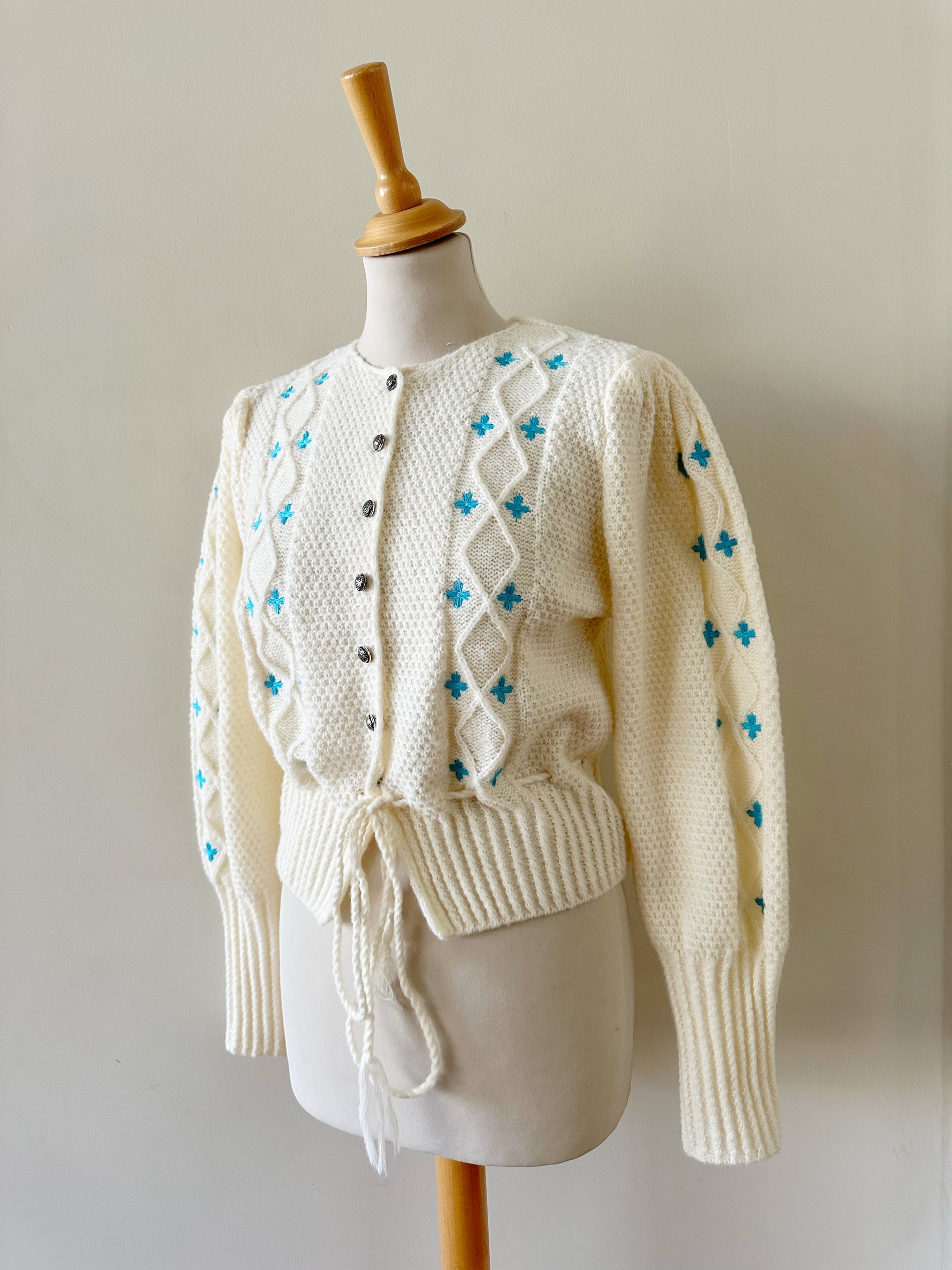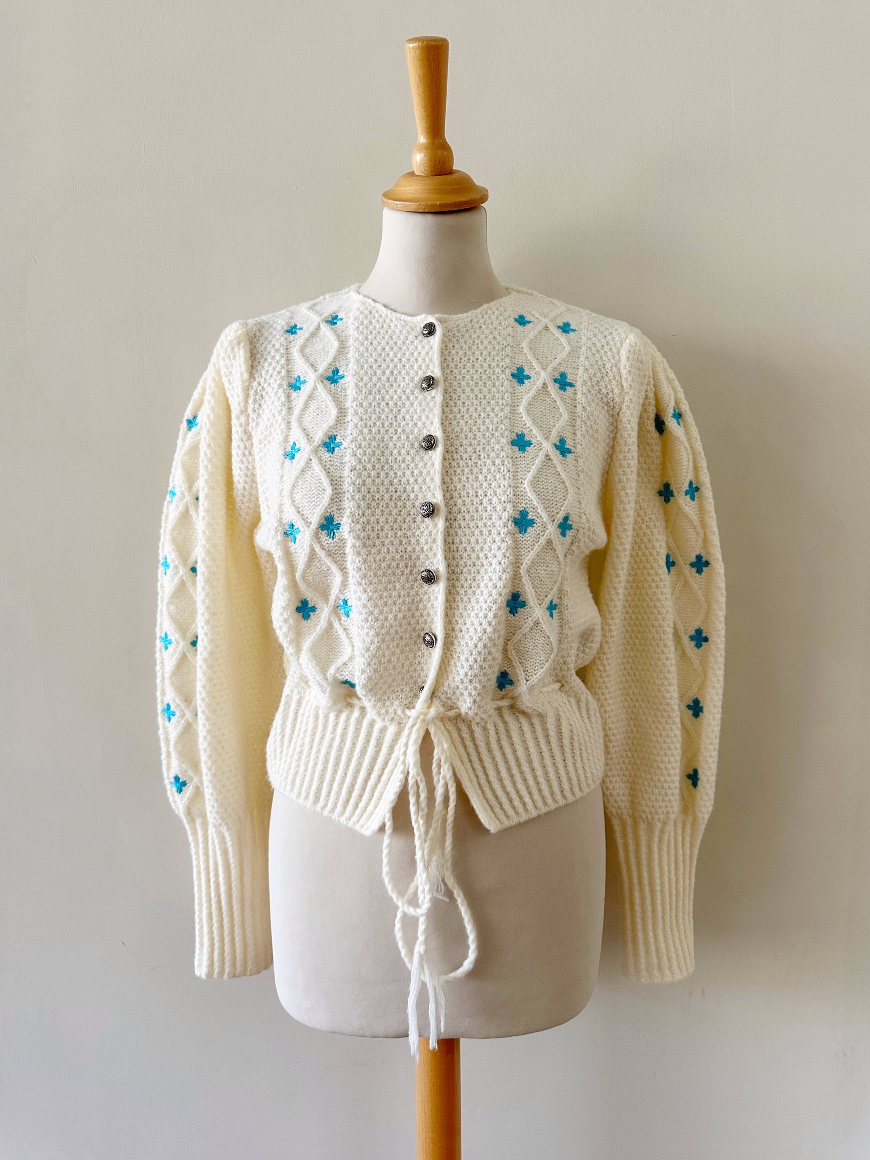 Cardigan Autrichien en laine et mohair écru, maille torsadée, brodé de fleurs bleues, manches ballons, taille à nouer, tricoté en Autriche. Taille 36 porté ici sur un mannequin T36. Aisselles 45cm, Longueur 60cm