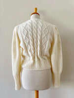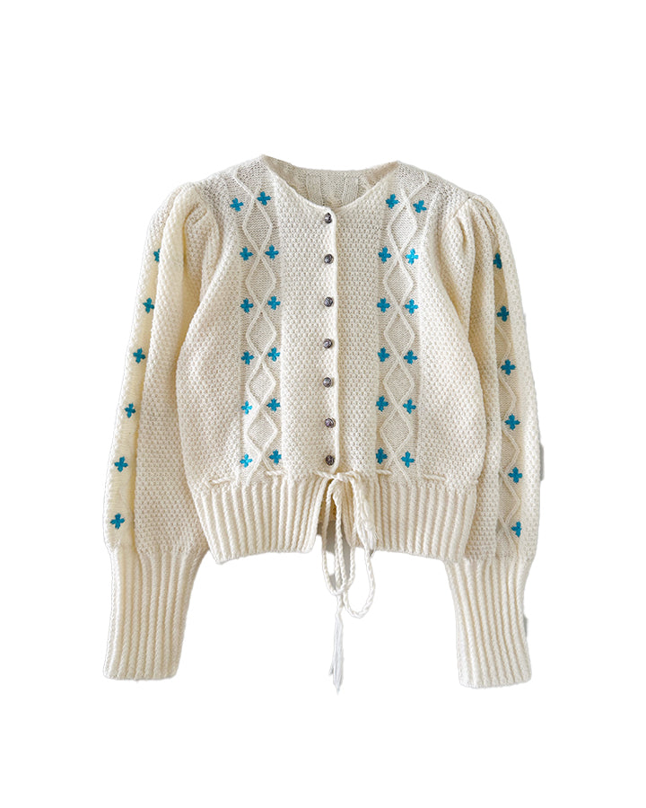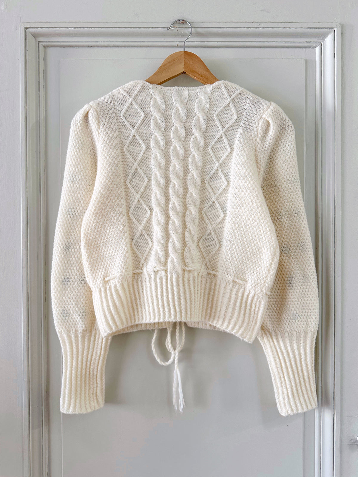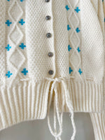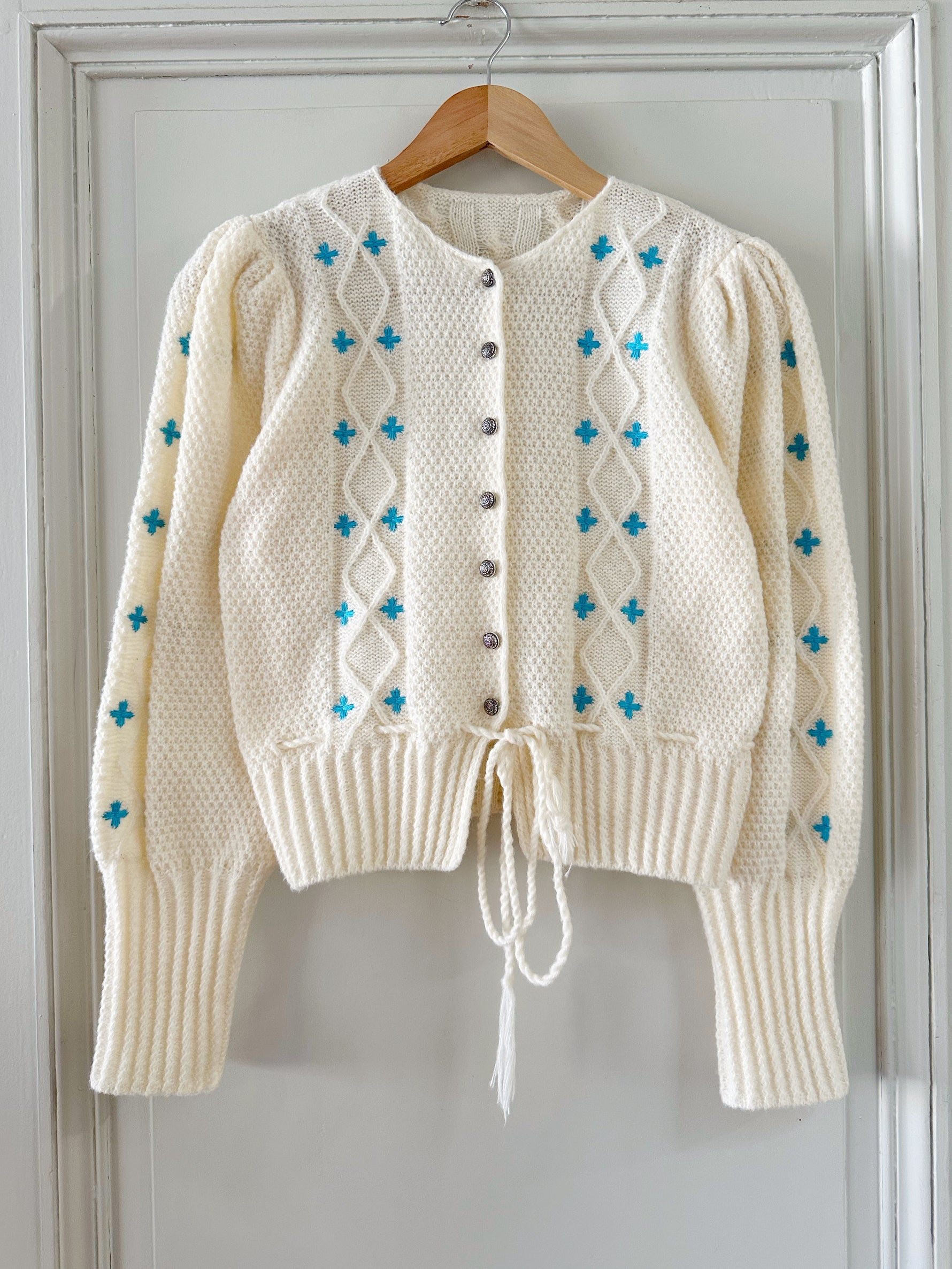 Cardigan Autrichien en laine et mohair écru, maille torsadée, brodé de fleurs bleues, manches ballons, taille à nouer, tricoté en Autriche. Taille 36 porté ici sur un mannequin T36. Aisselles 45cm, Longueur 60cm