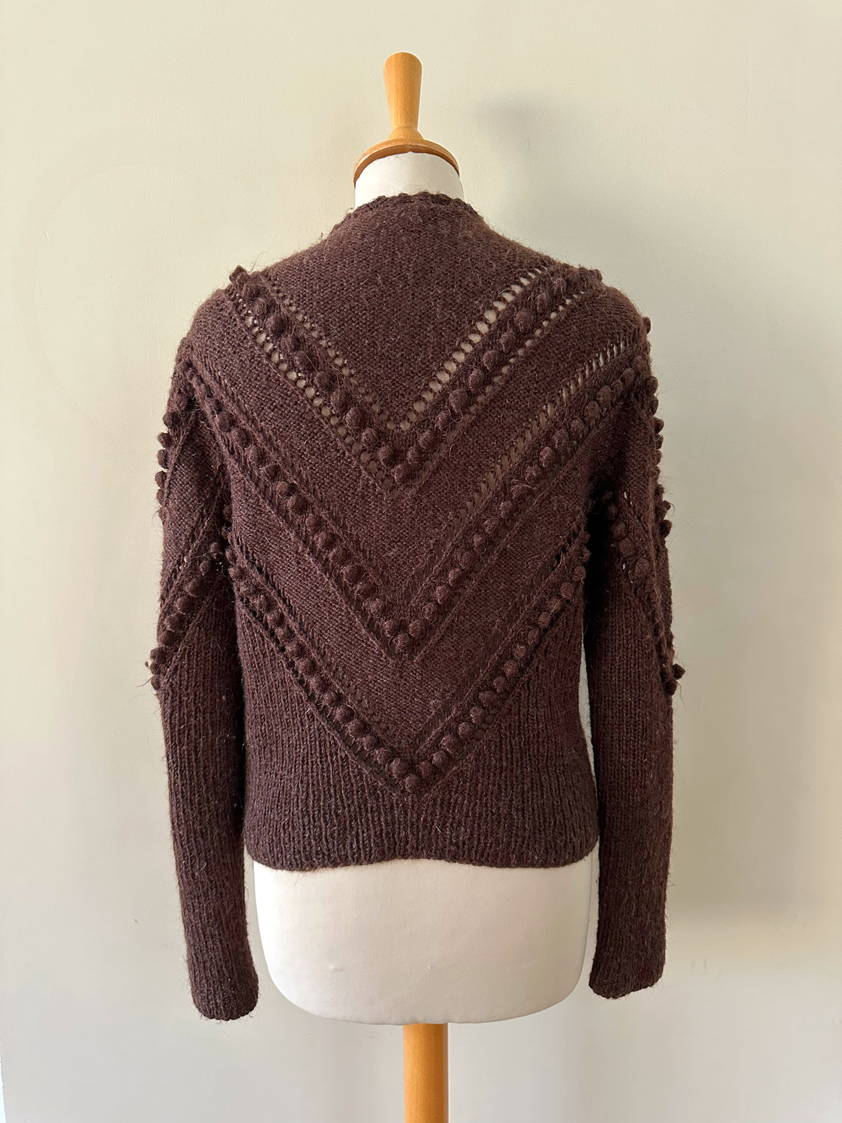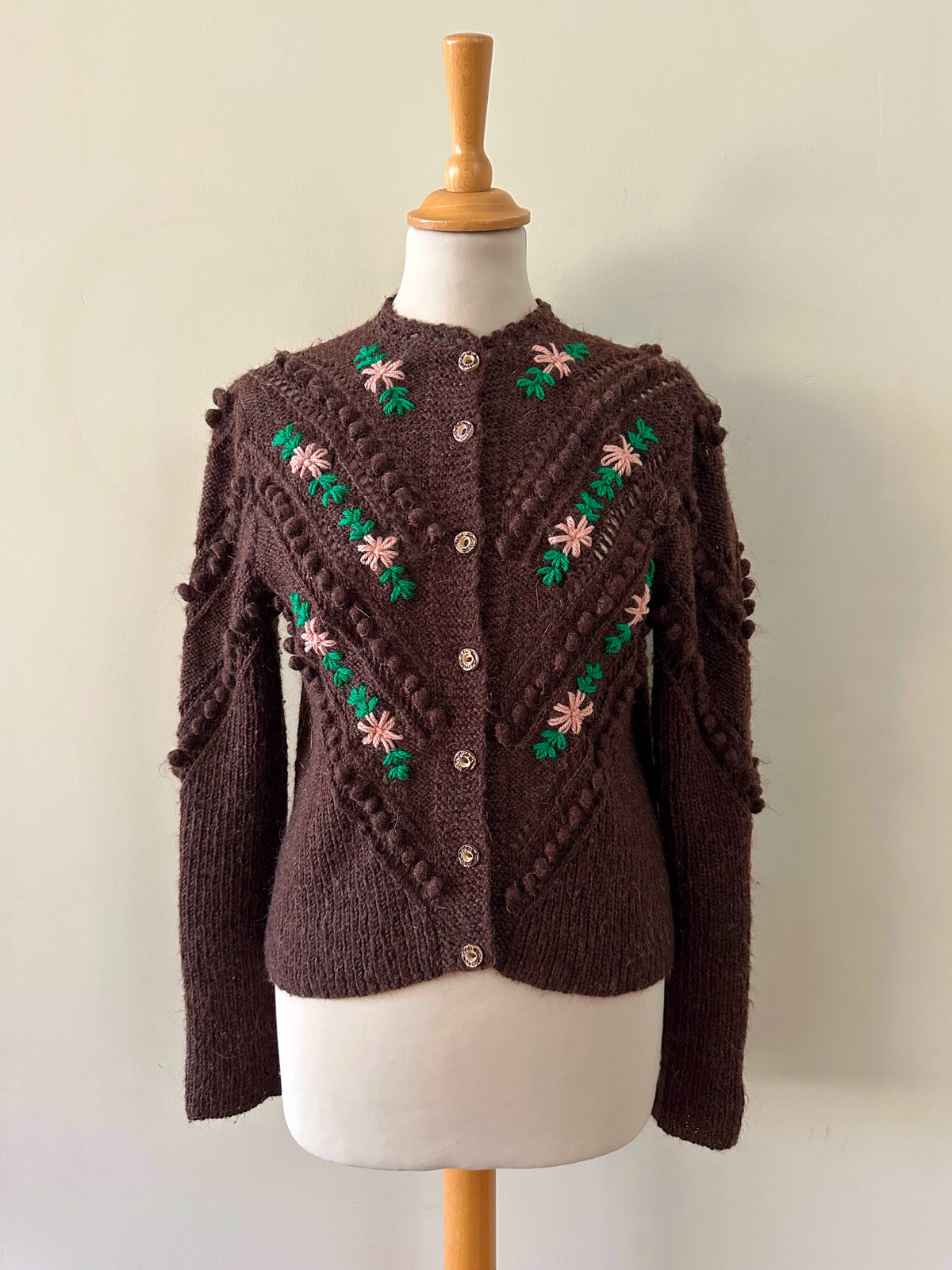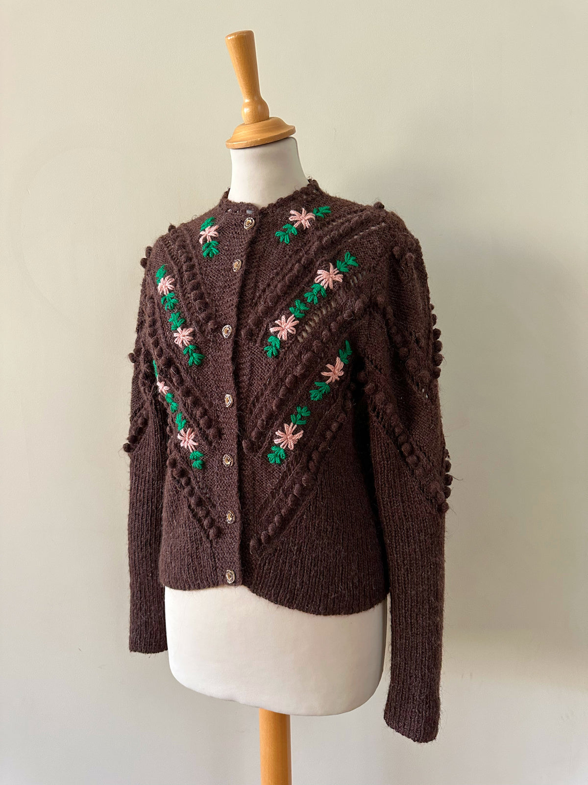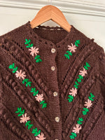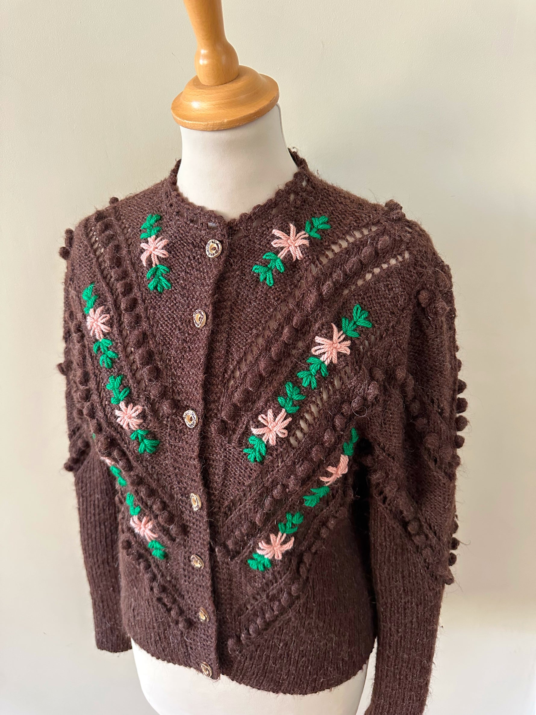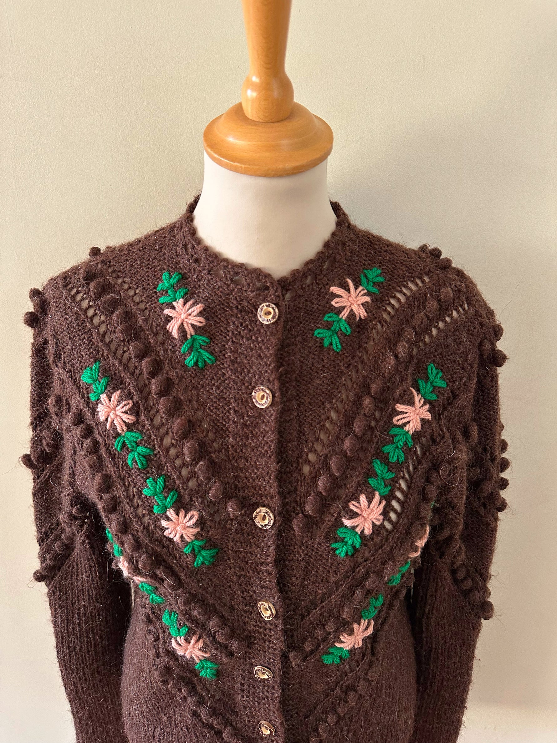 Prix unitaire parCardigan Autrichien en laine et mohair chocolat, maille popcorn ajourée, brodé de fleurs roses pastels et vert gazon . Tricoté et brodé mains en Autriche. Tricoté et brodé mains en Autriche. Taille 36 porté ici sur un mannequin T36. Aisselles 45cm, Longueur 58cm.