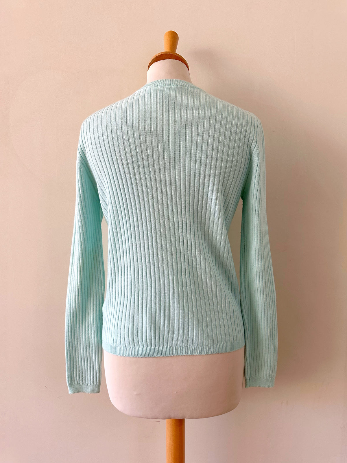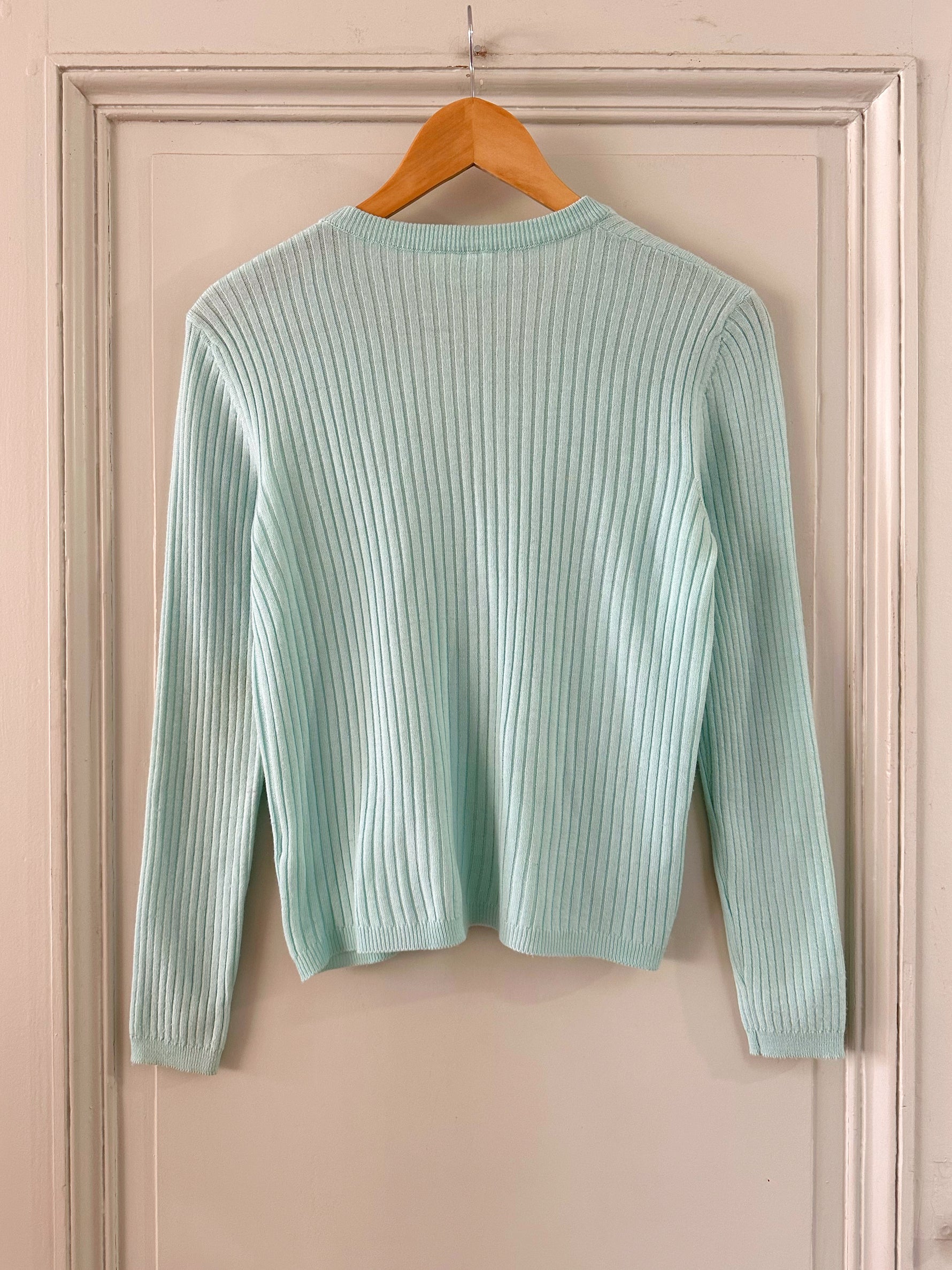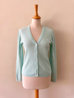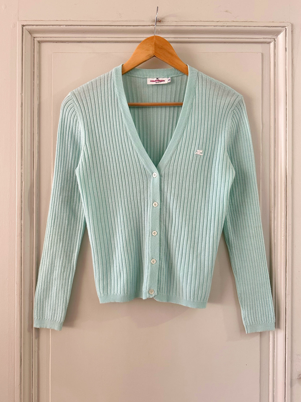 Prix unitaire parCardigan Courrèges, maille côtelée en laine mélangée bleu ciel glacier, logo brodé blanc, col V, fabriqué en Italie, taille 36 porté ici sur un mannequin T36.Aisselles 44cm Longueur 55cm.