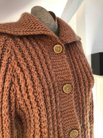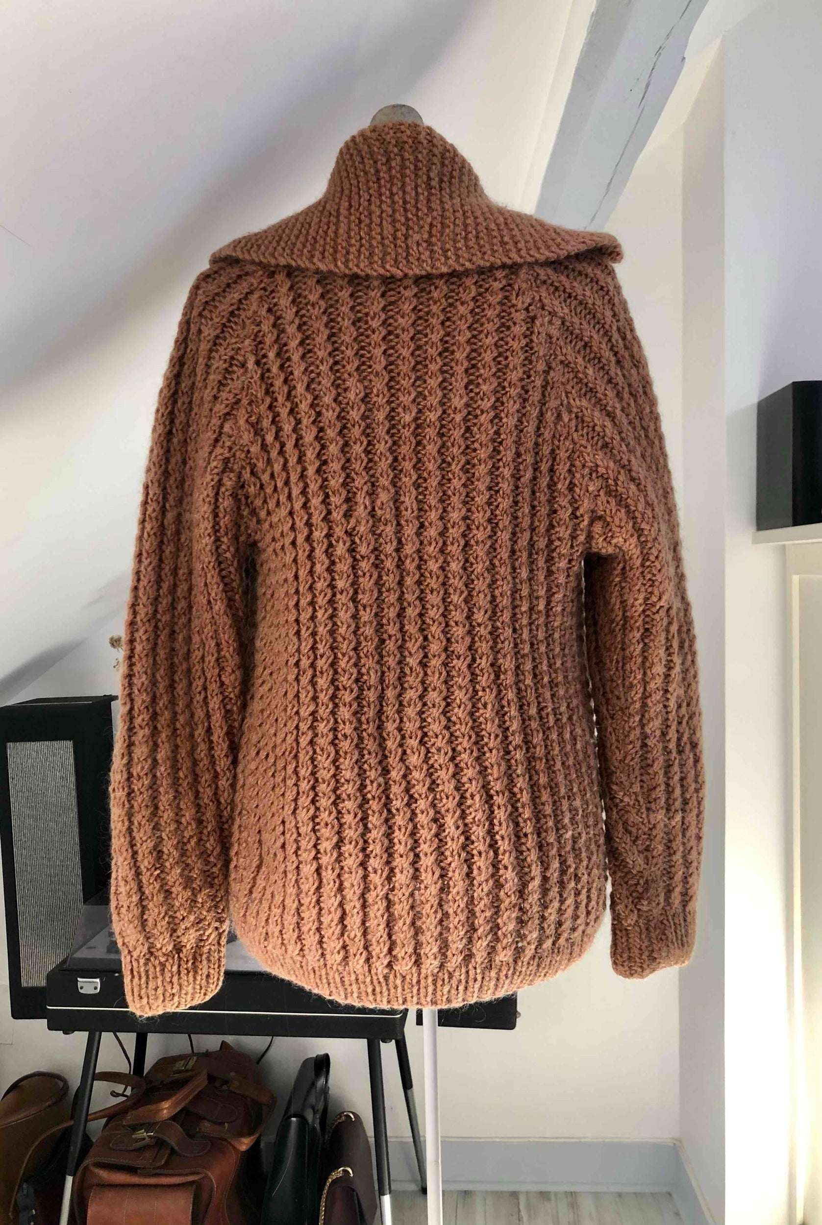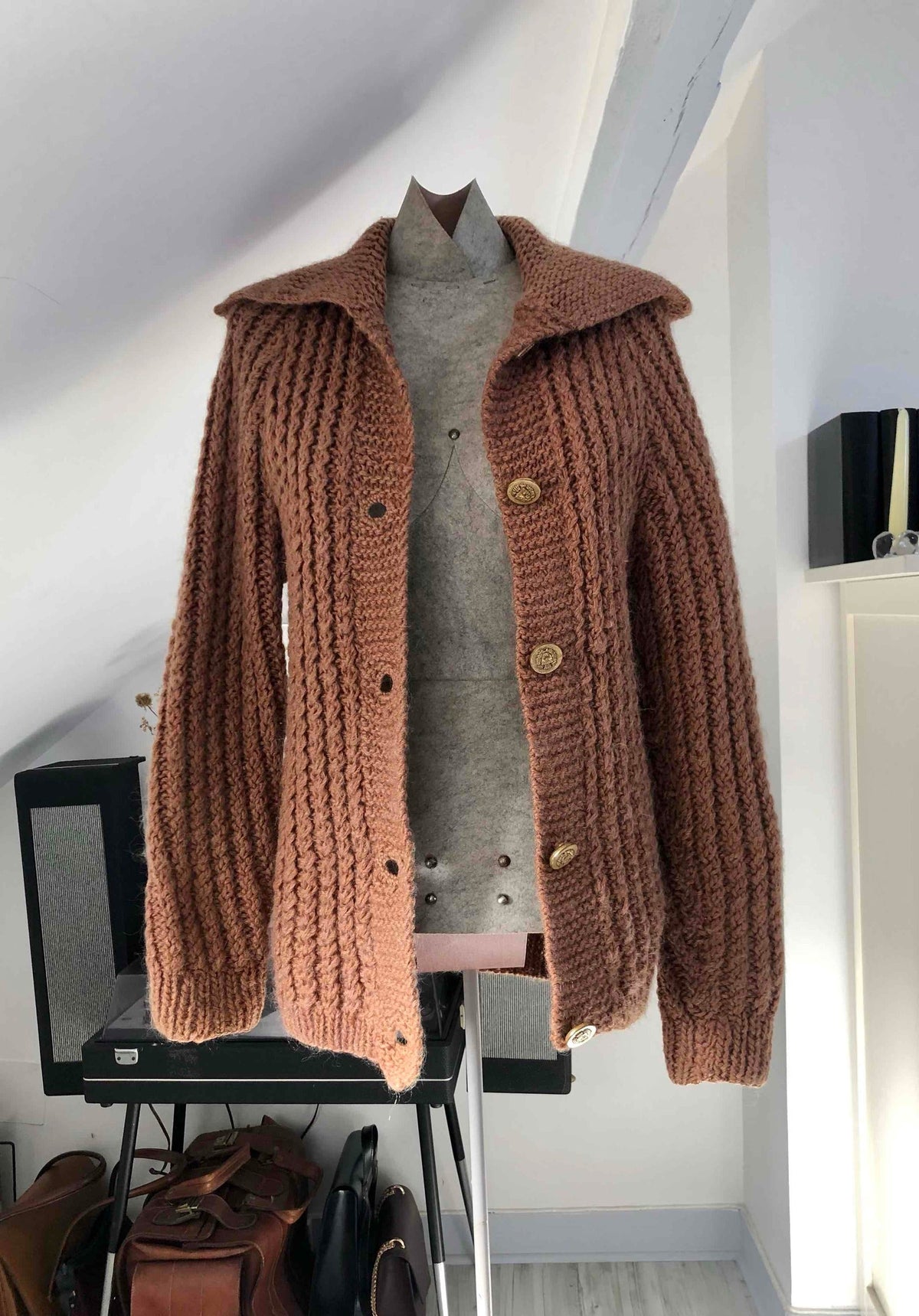 Prix unitaire parCardigan en laine. Coupe droite, grosses mailles côtelés. Boutons en métal doré. Tricoté main. Je le recommande du 36 au 40.