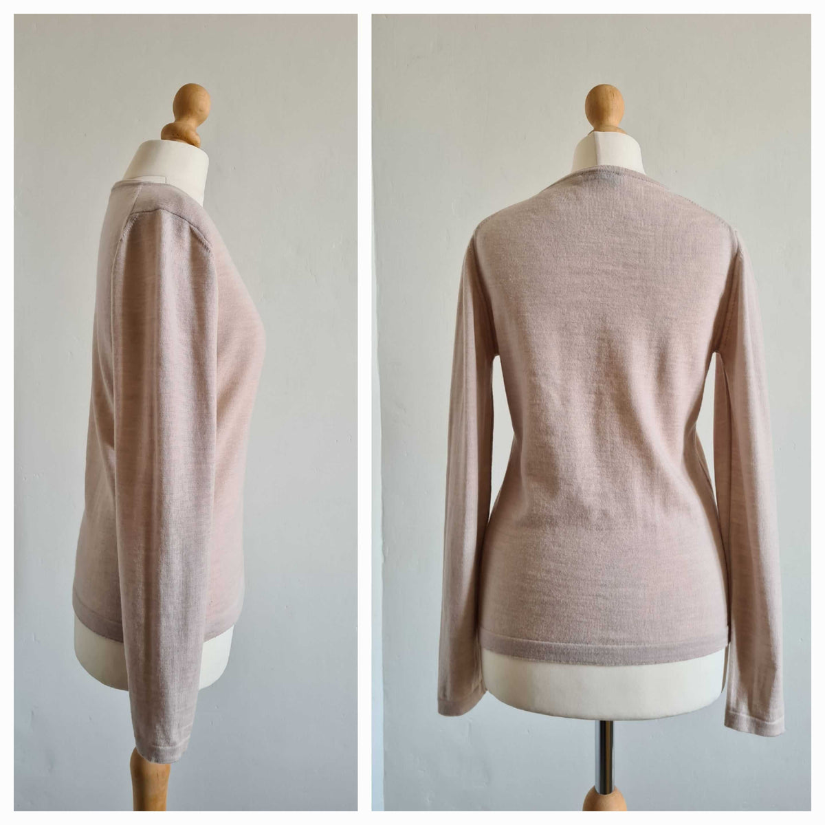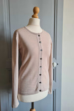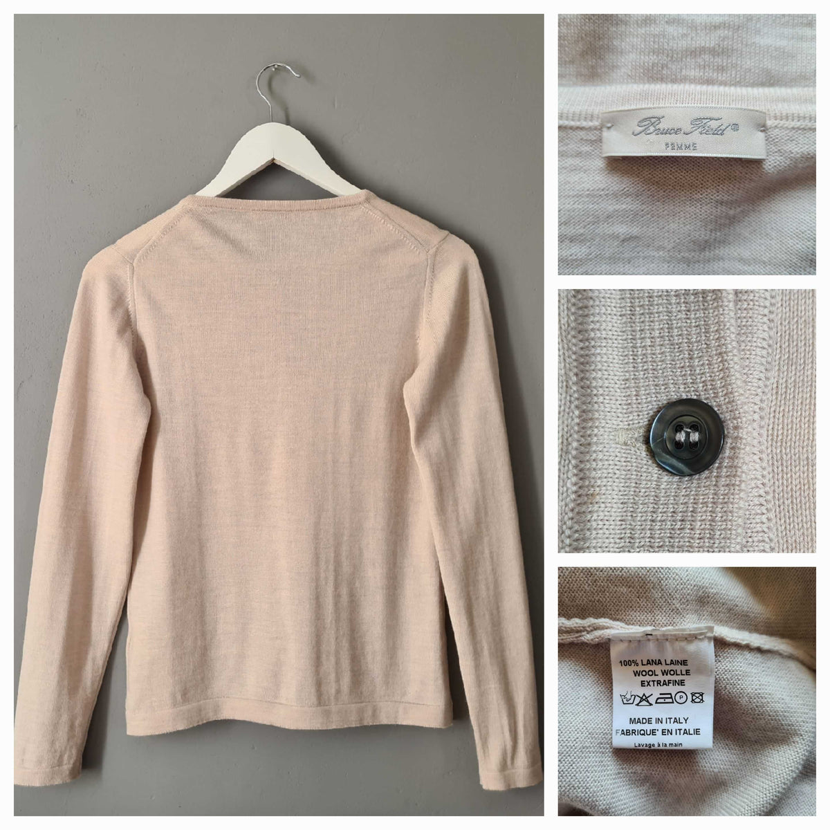 Cardigan en laine beige, maille fine, boutonnière en nacre grise. Coupe à peine cintrée. Convient à une taille 34 ou petit 36. Pièce pure laine, fabriquée en Italie.