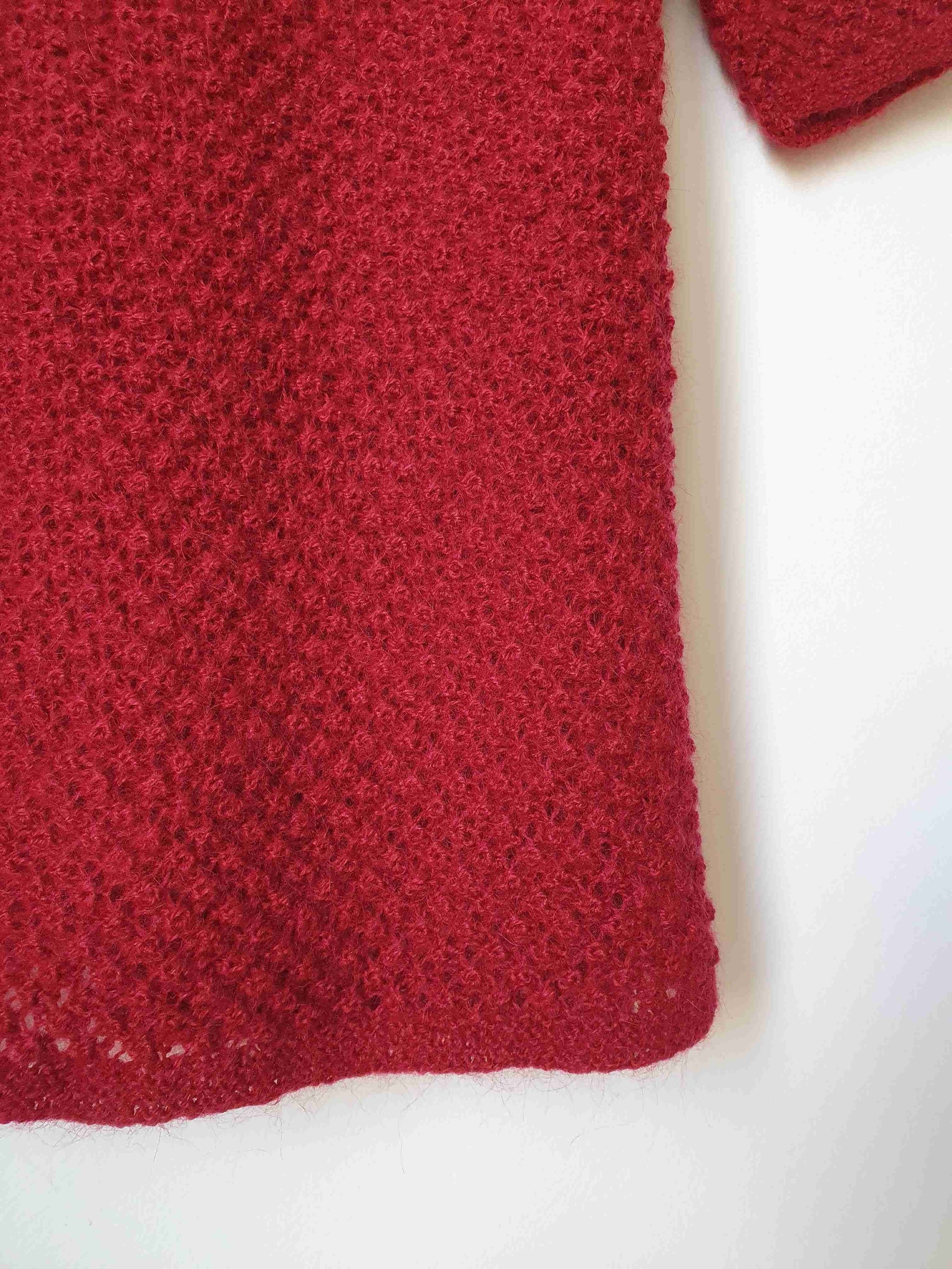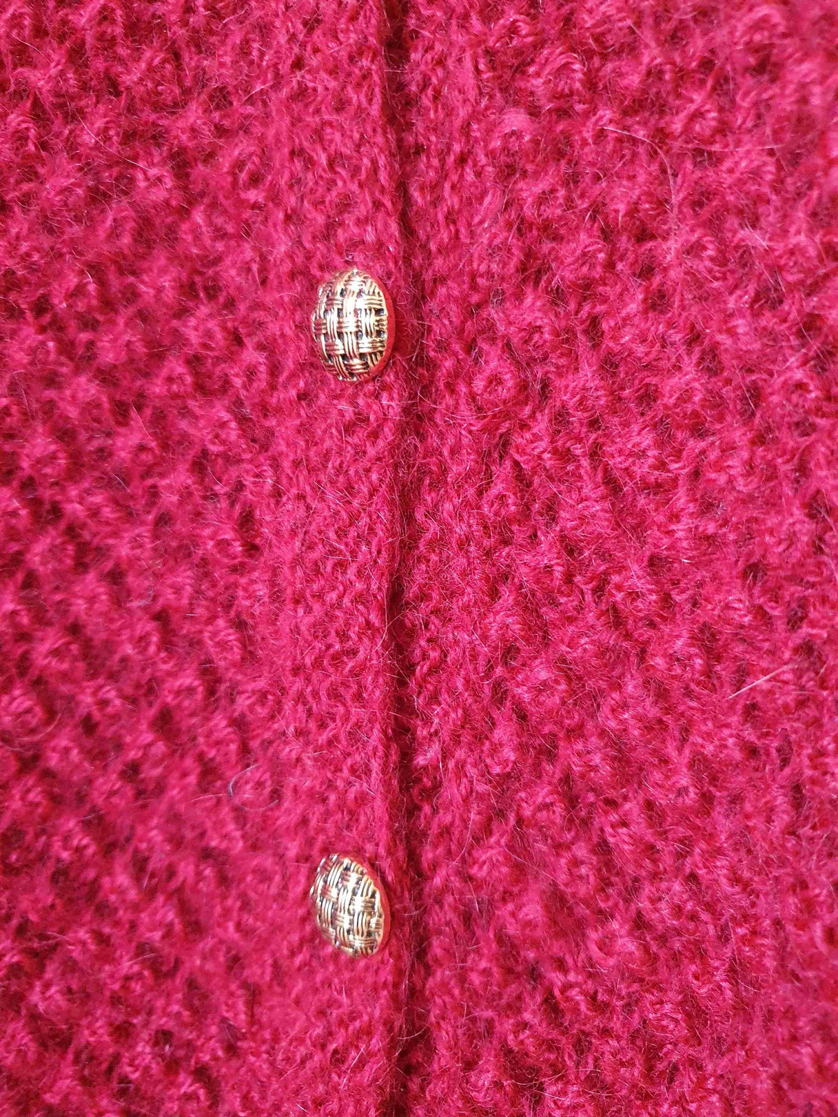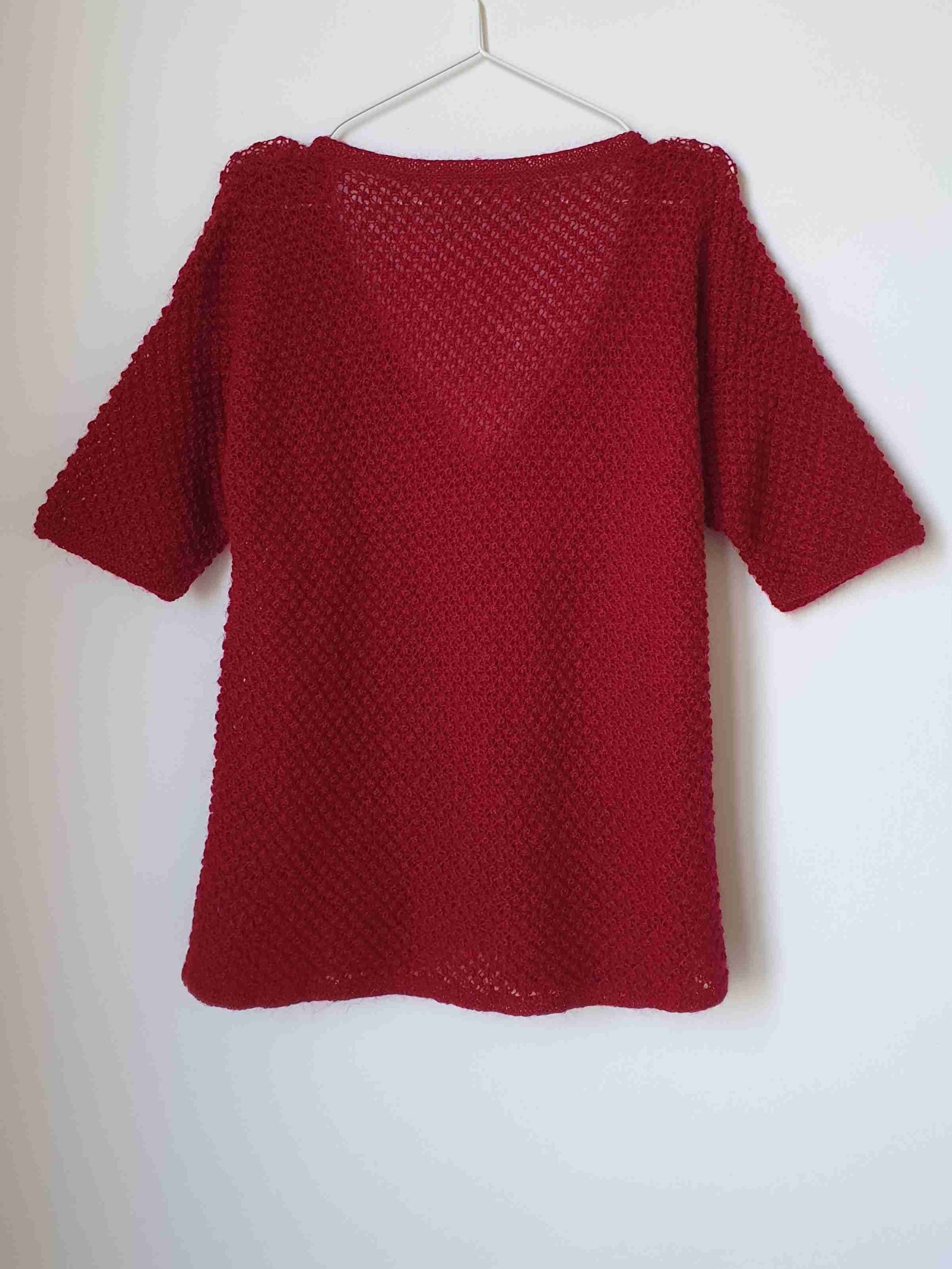 Prix unitaire parCardigan fait main en laine bordeaux (un vrai bordeaux. La couleur paraît rouge sur les photos). Manches courtes. Boutons dorés. Taille 38/40.