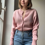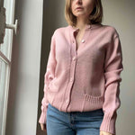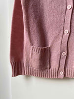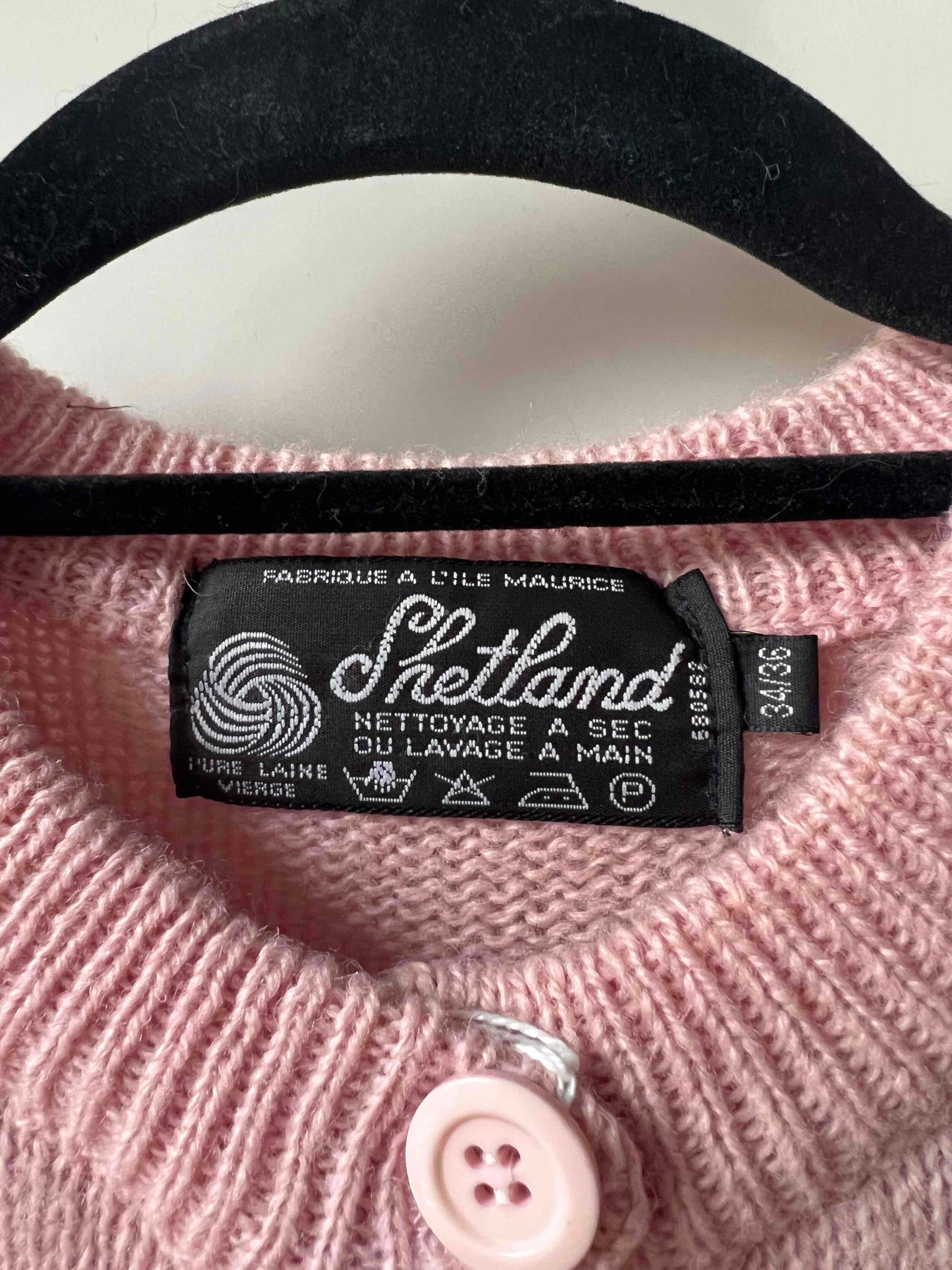 Cardigan épais rose pastel en laine Shetland, pure laine vierge, fabriquée à l’île Maurice. Détail de petites poches, col rond. Taille 36/38/40.