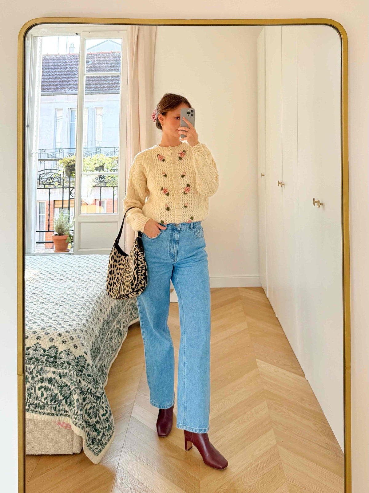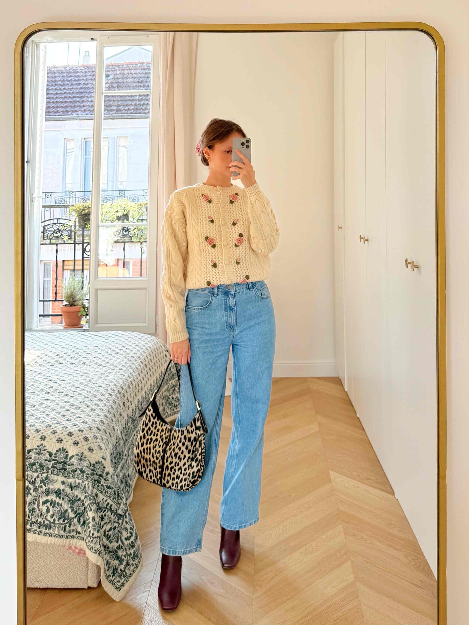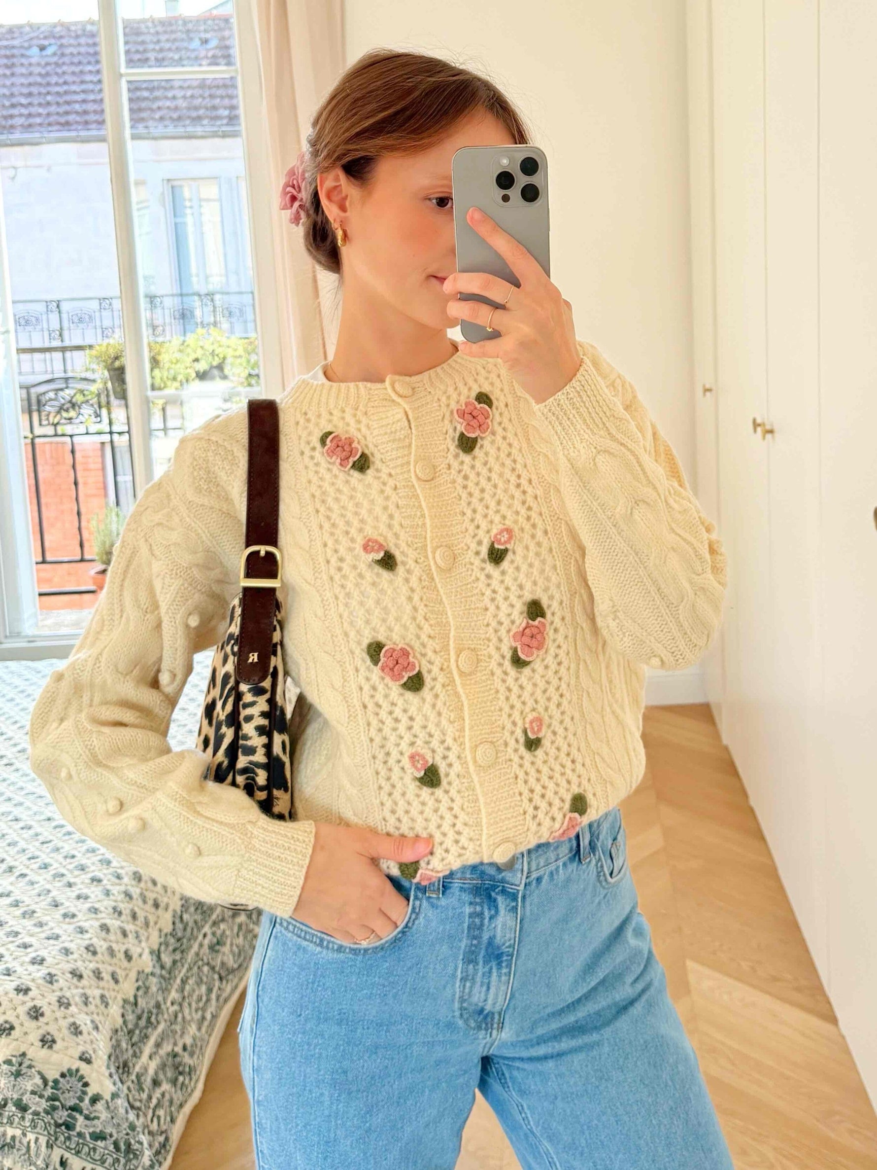 Prix unitaire parCardigan en laine, brodé de fleurs, boutonné sur le devant, porté ici sur une T36 pour 1m64