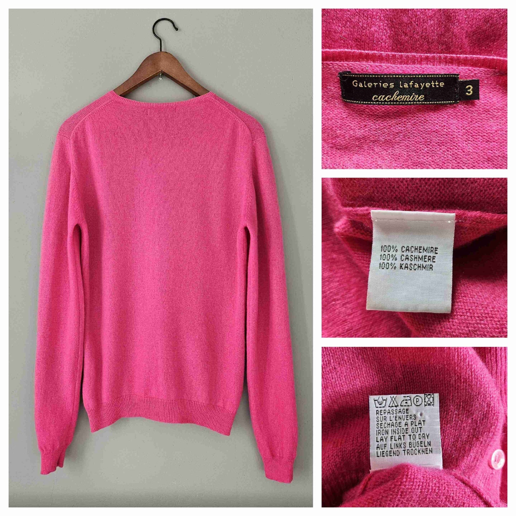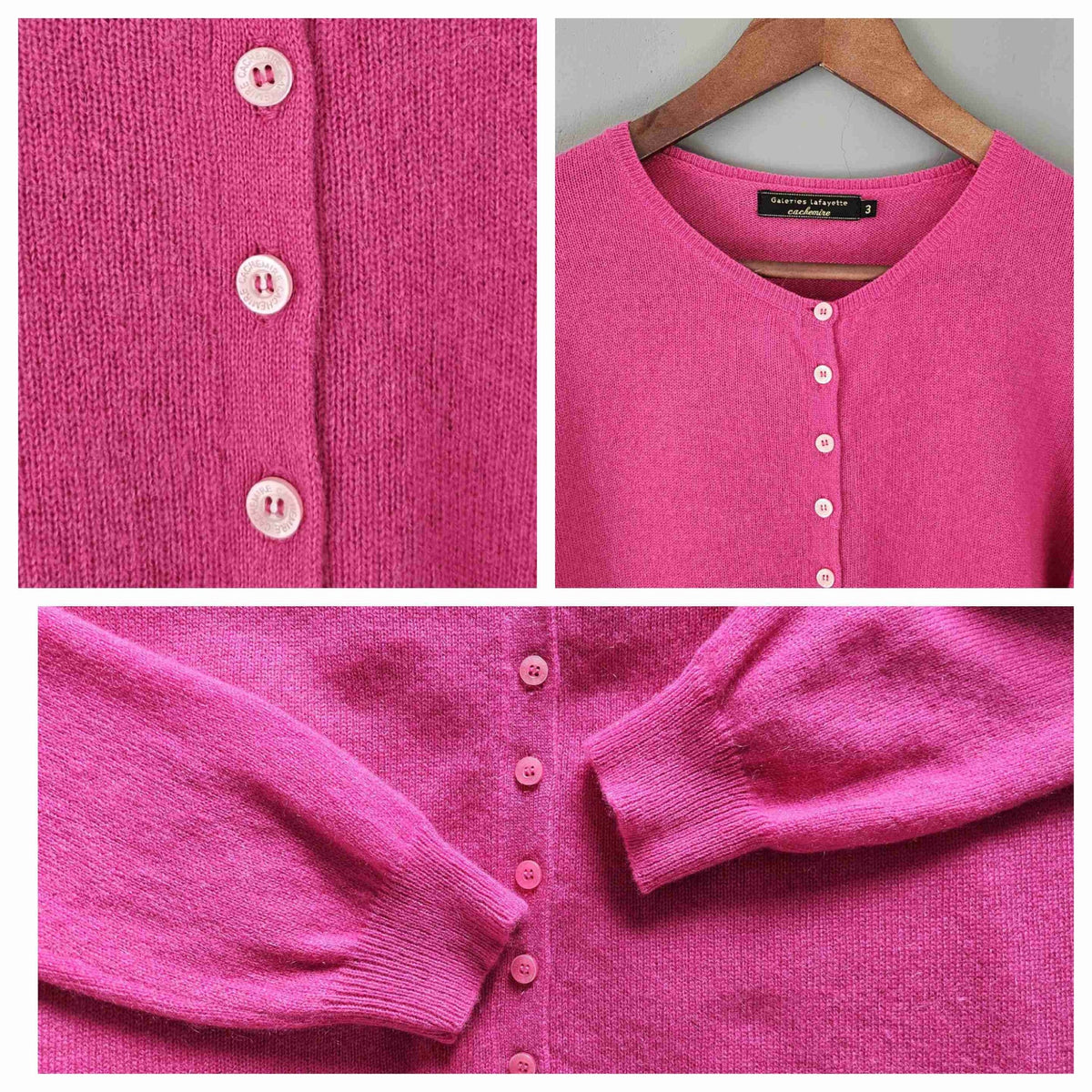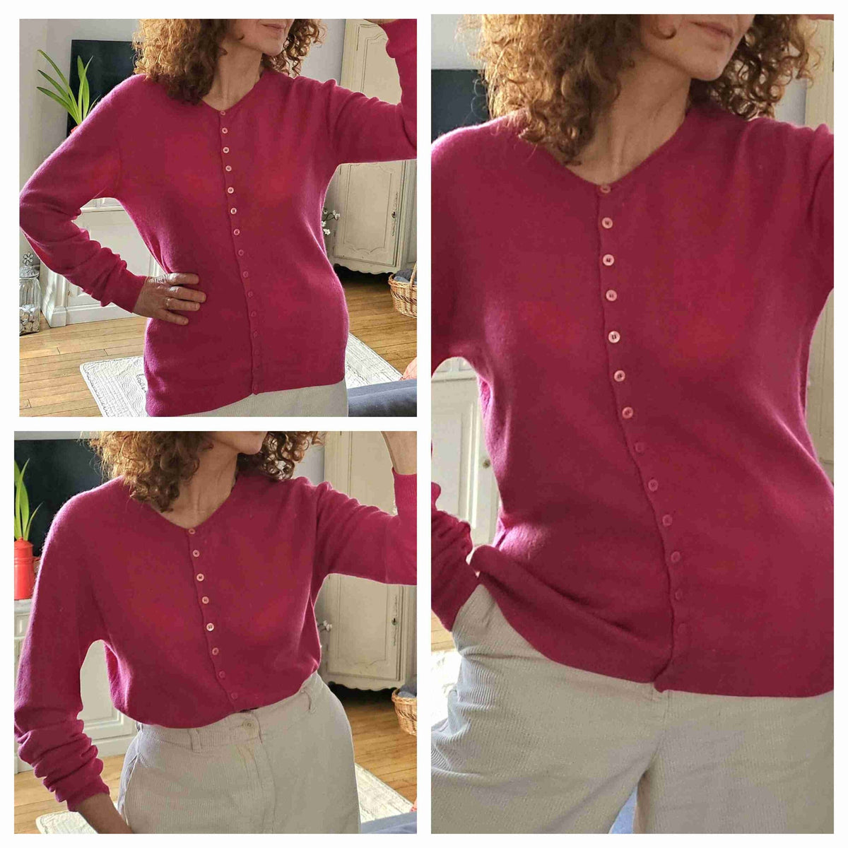 Prix unitaire parCardigan en pure laine cachemire rose framboise, maille fine, base et poignets en côtes. Porté sur les photos par une personne T36. Marque Galeries Lafayette.