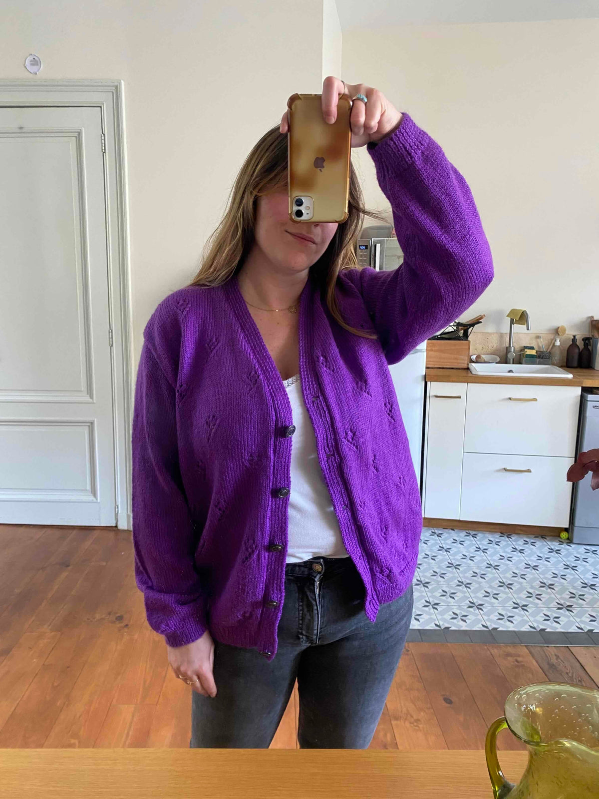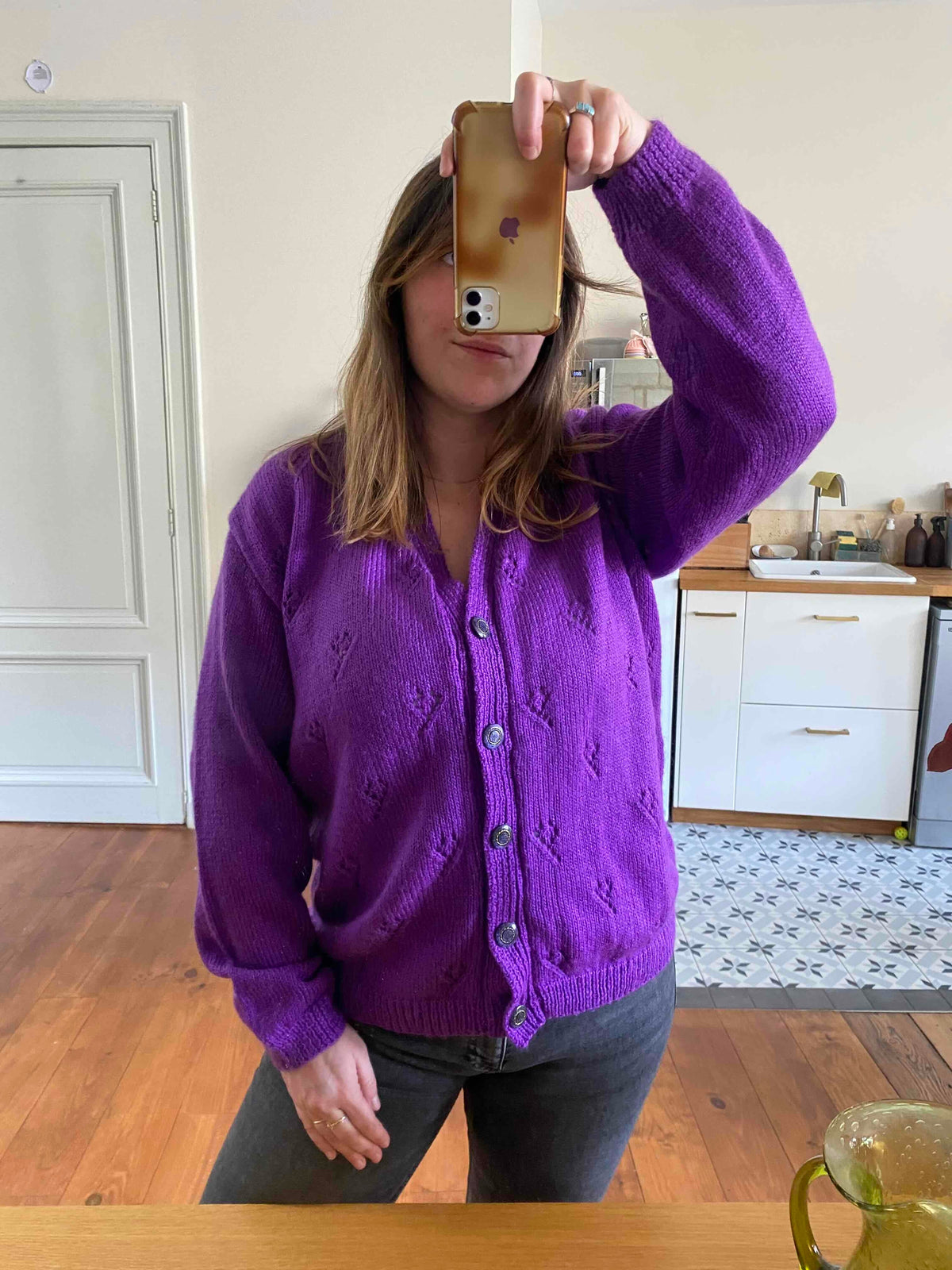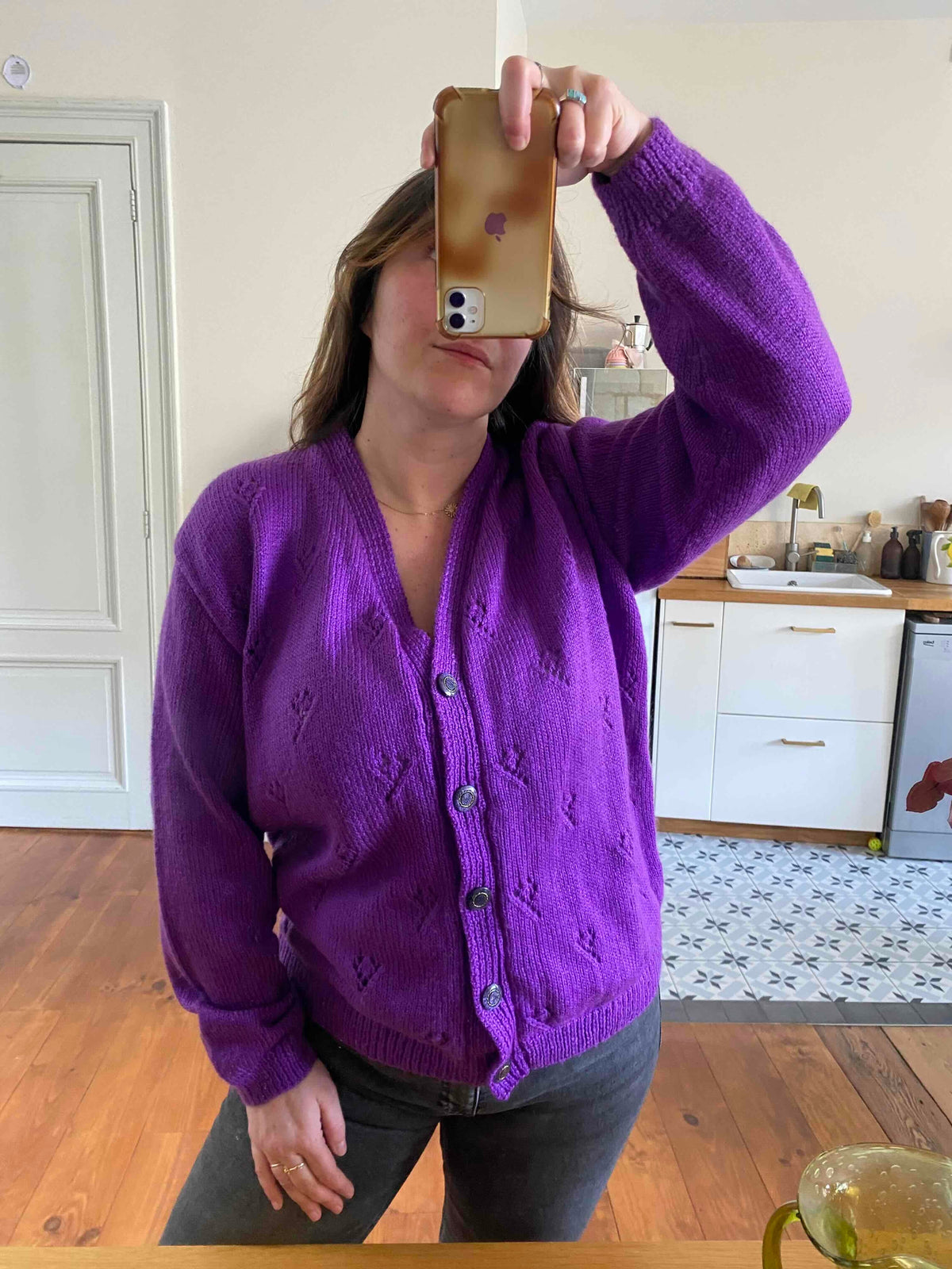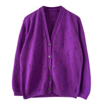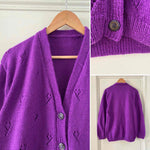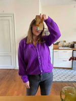 Cardigan en laine mélangée violet vif violine, maille tricot ajouré pointelle, col V échancré, boutons bijoux dorés et violets, taille 40 et 42 porté ici sur une personne T40.