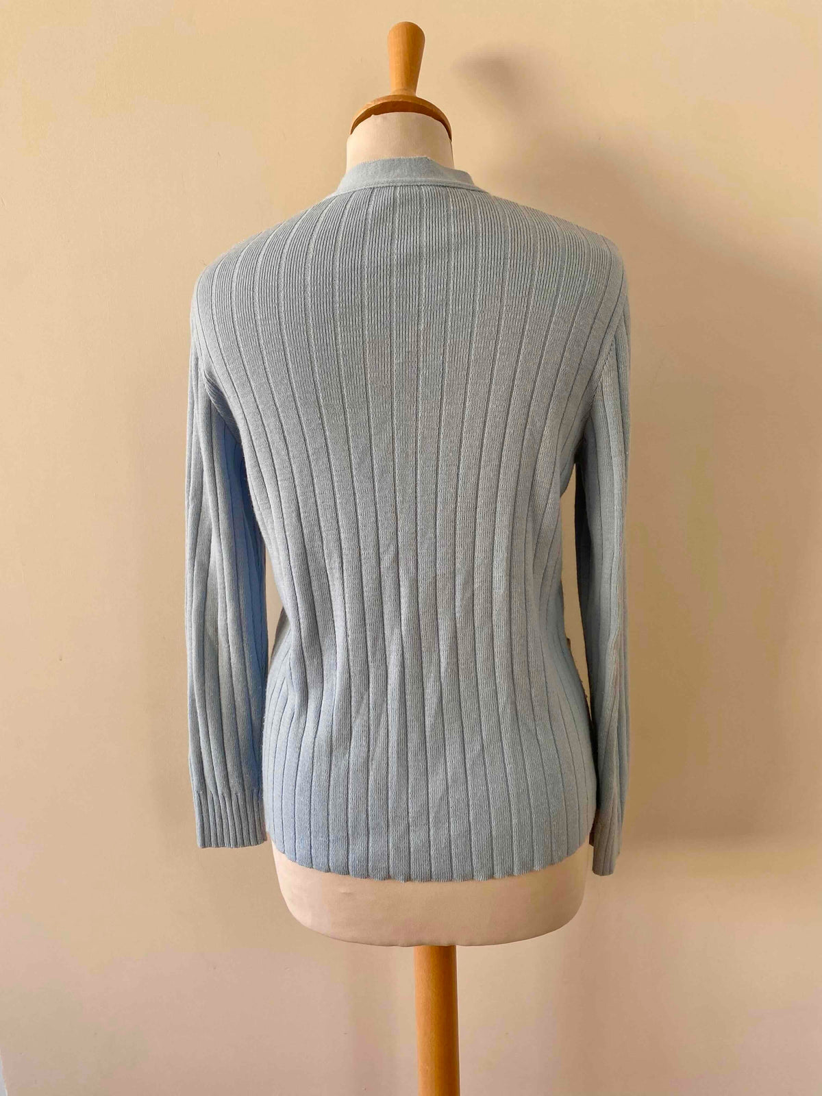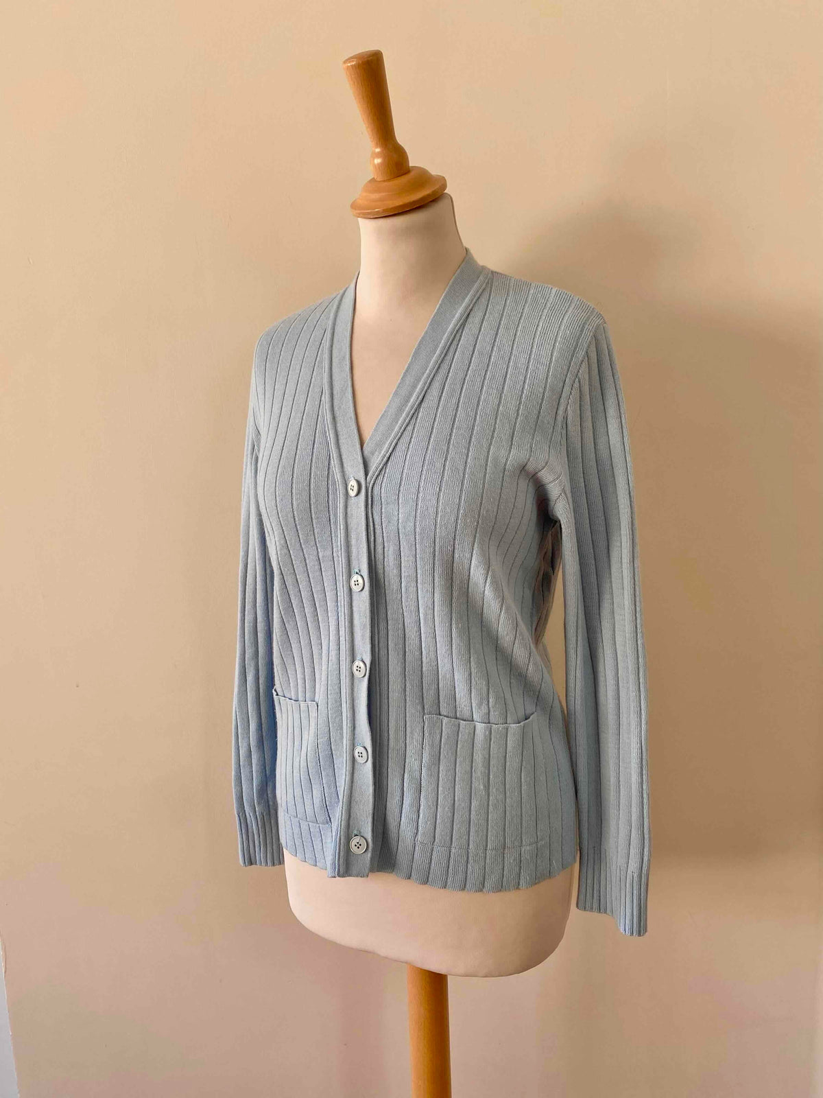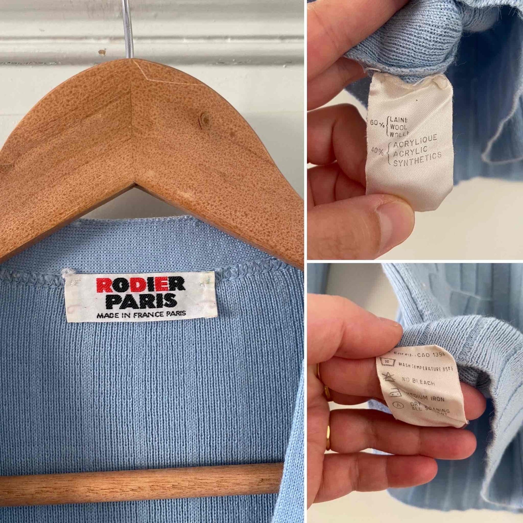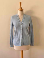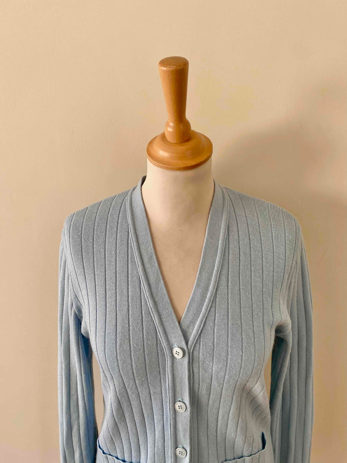 Prix unitaire parCardigan Rodier en laine mélangée maille côtelée bleu ciel, col V boutonné, fabriqué en France, taille 36 porté ici sur un mannequin T36.