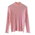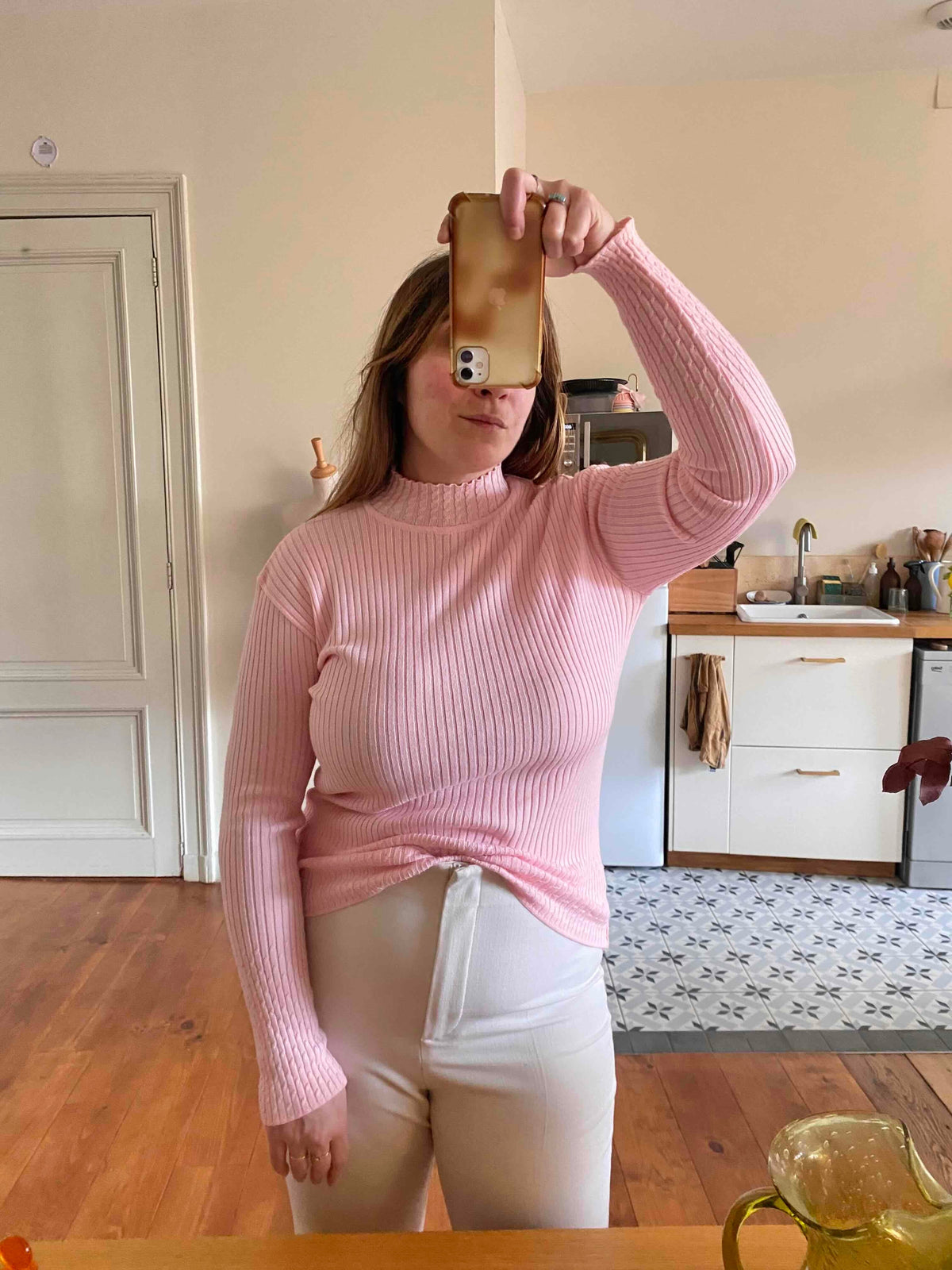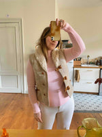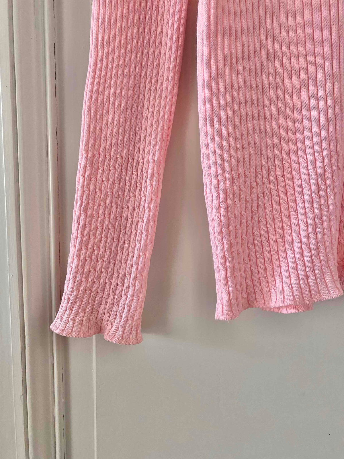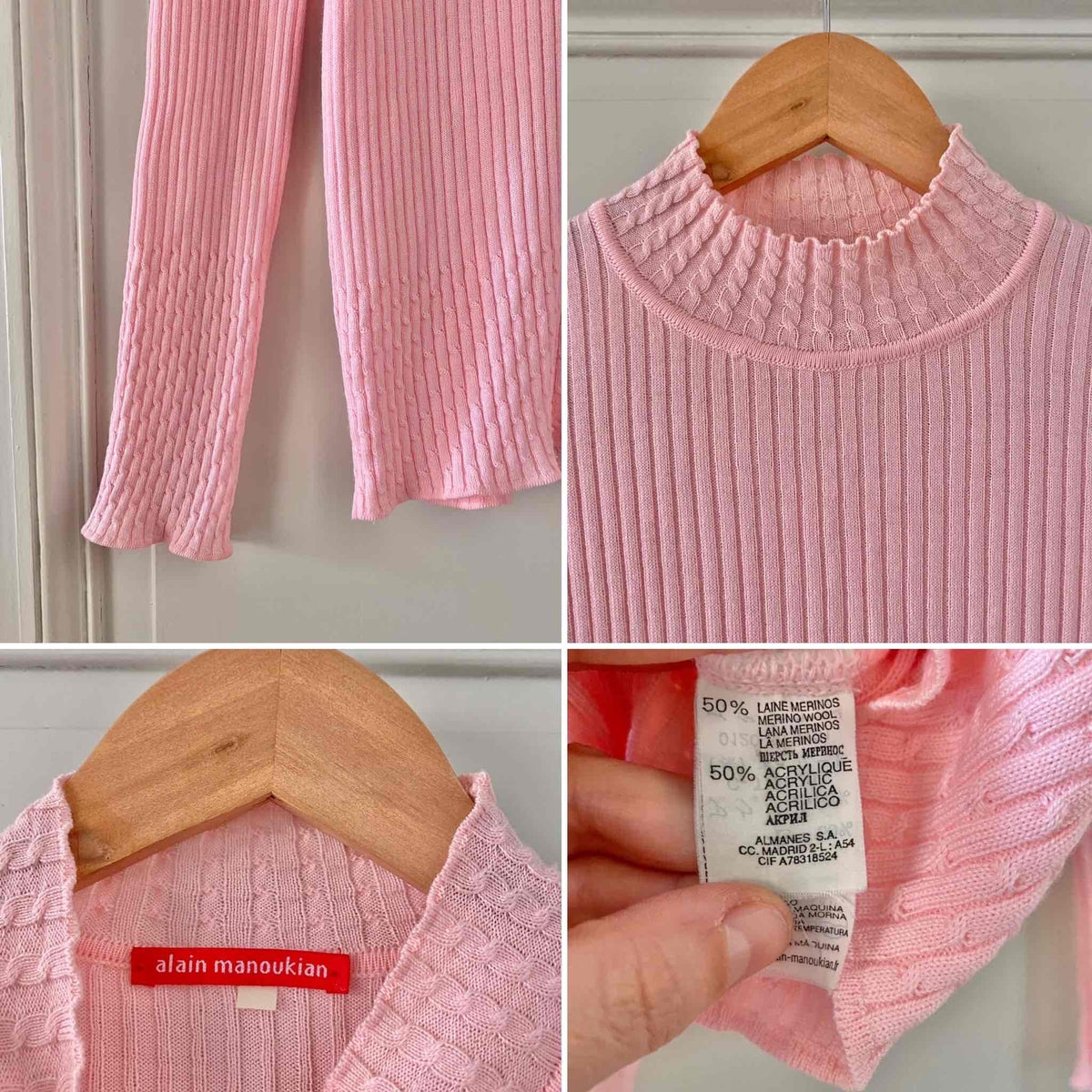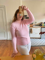 Prix unitaire parCol roulé en laine mélangée rose baby, en maille côtelée et fantaisie tressée au col et bas, alain manoukian, y2k, taille 38 et 40 porté ici sur un mannequin T36 et une personne T40.
