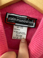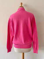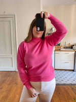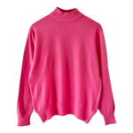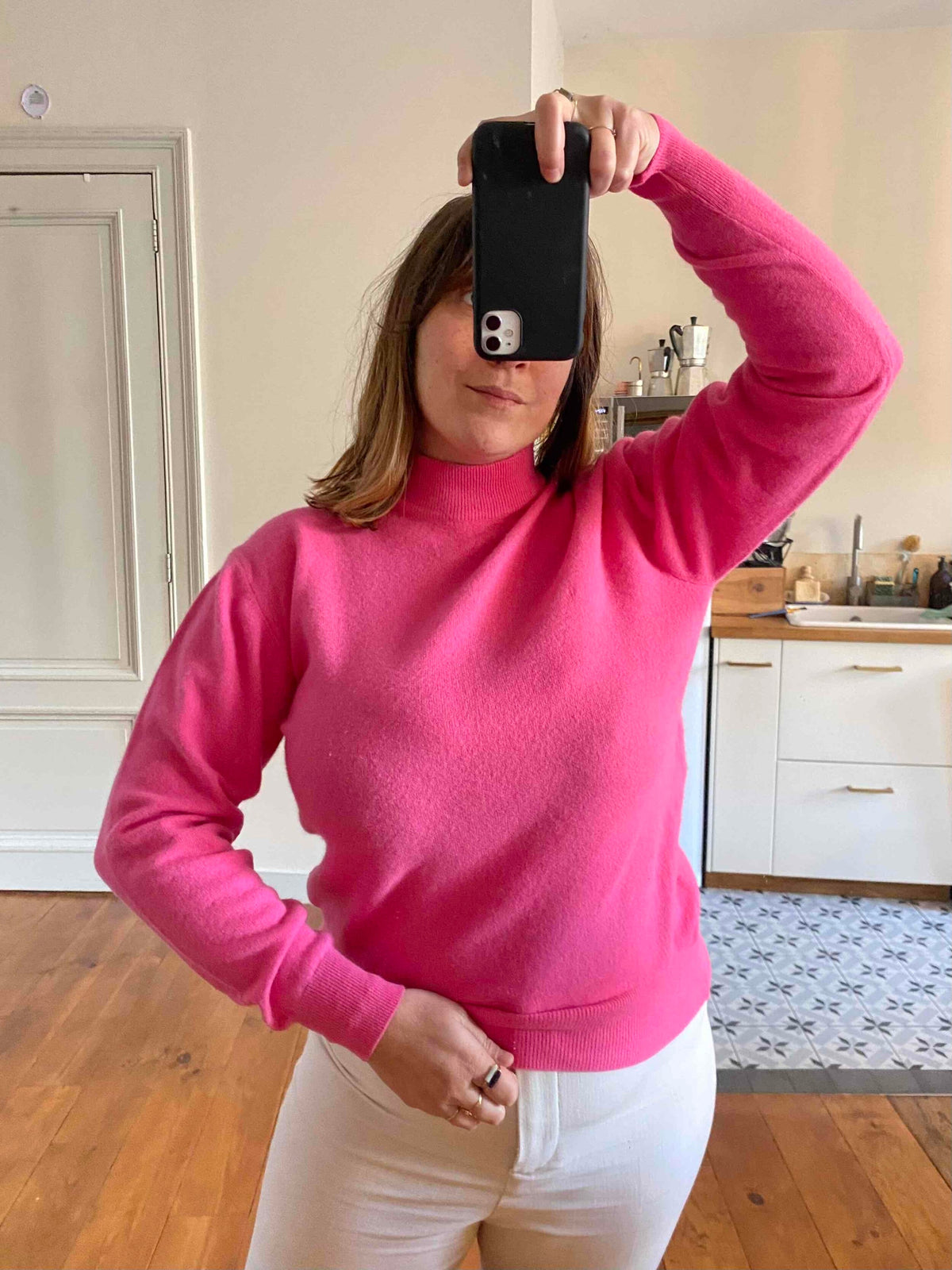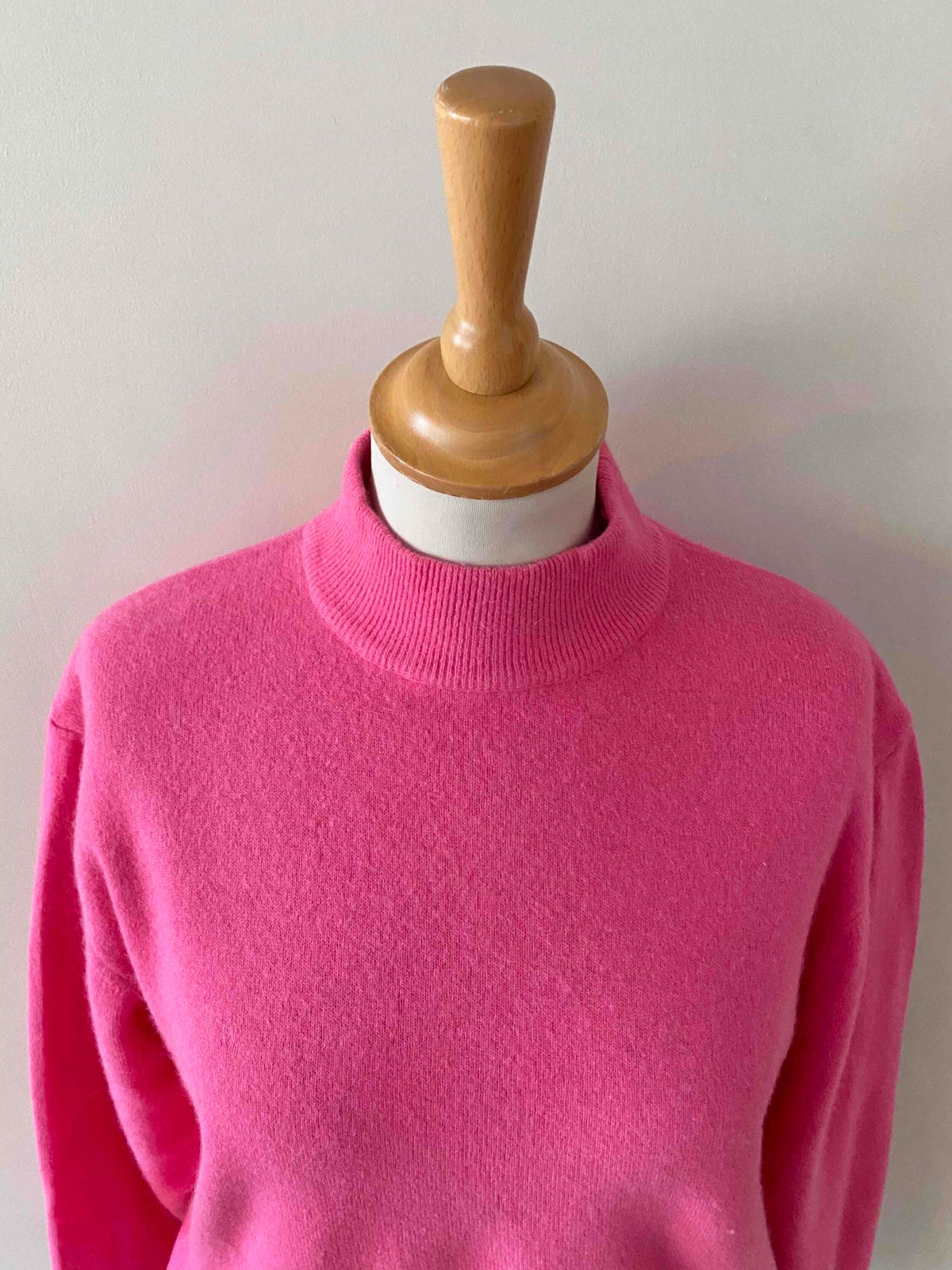 Col roulé en laine angora, rose bonbon vif, col montant forme sweat manches ballons, fabriqué en Italie, taille 36 et 38 porté ici sur un mannequin T36 et serré sur une personne T40.
