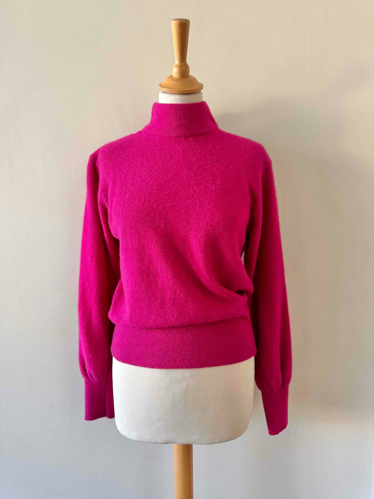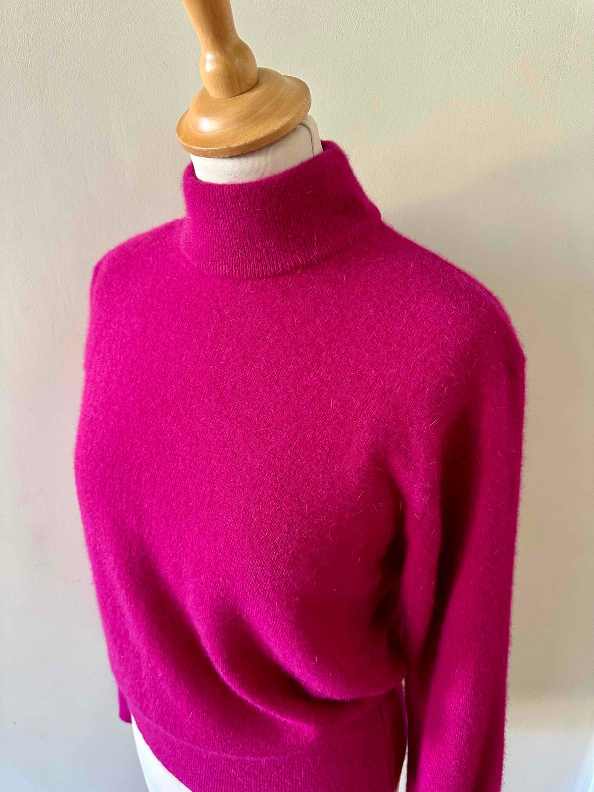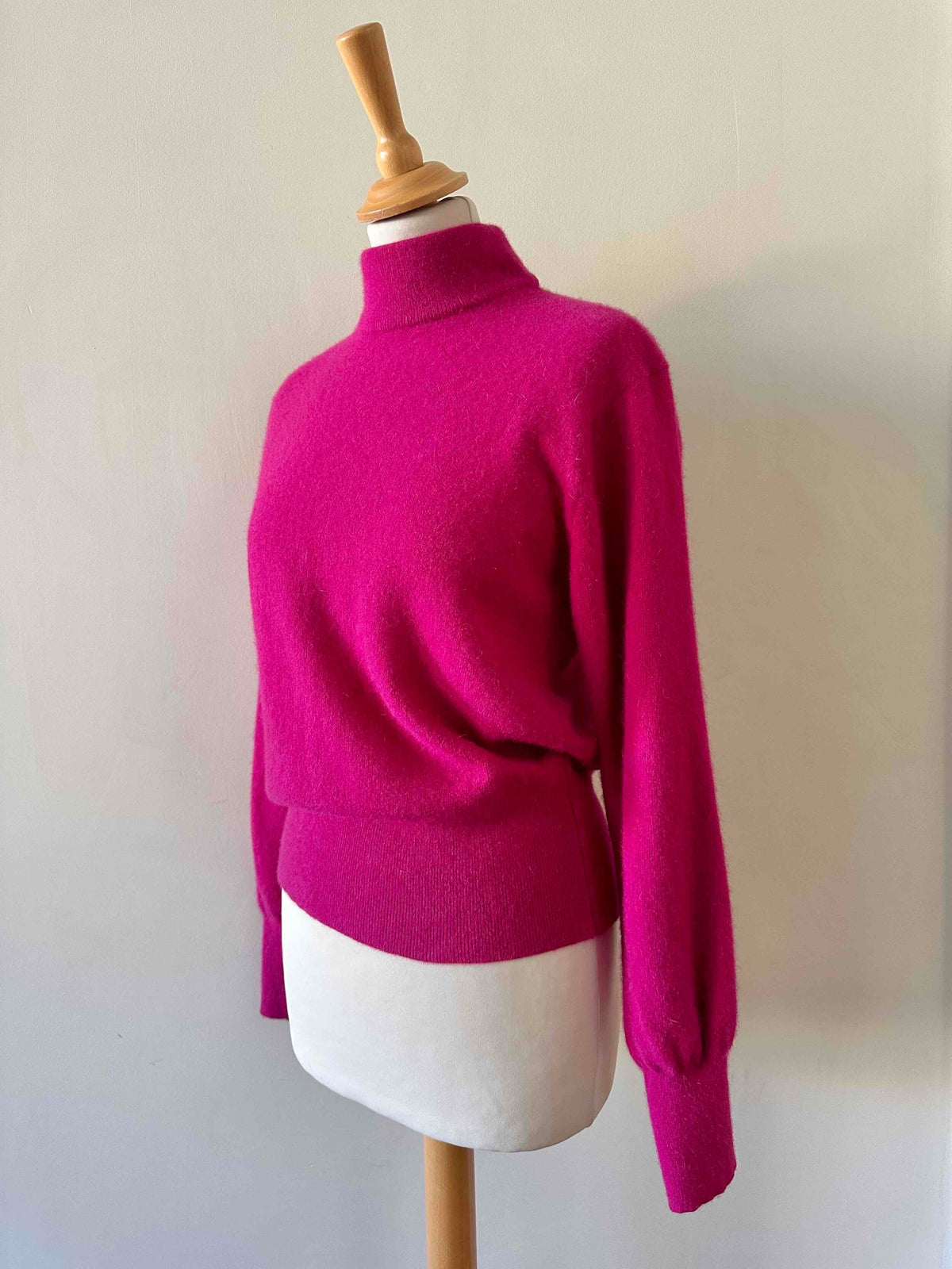 Prix unitaire parCol roulé en laine angora, laine d’agneau et angora rose fuschia, manches ballons, fabriqué en Italie, taille actuelle 36 porté ici sur un mannequin T36.