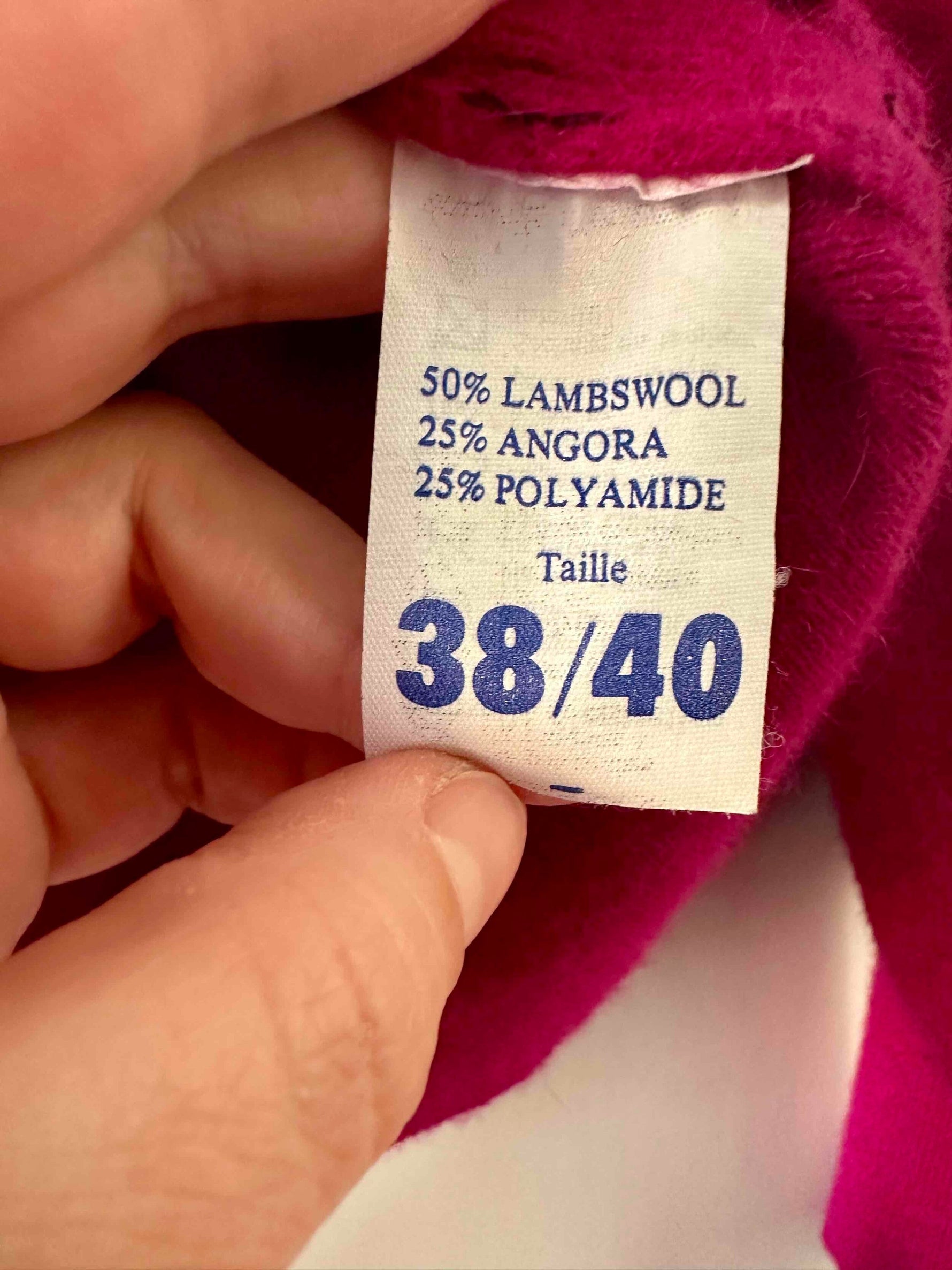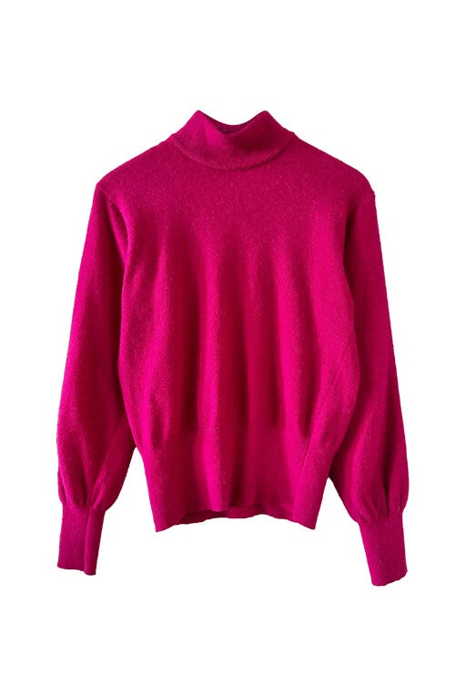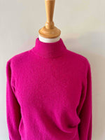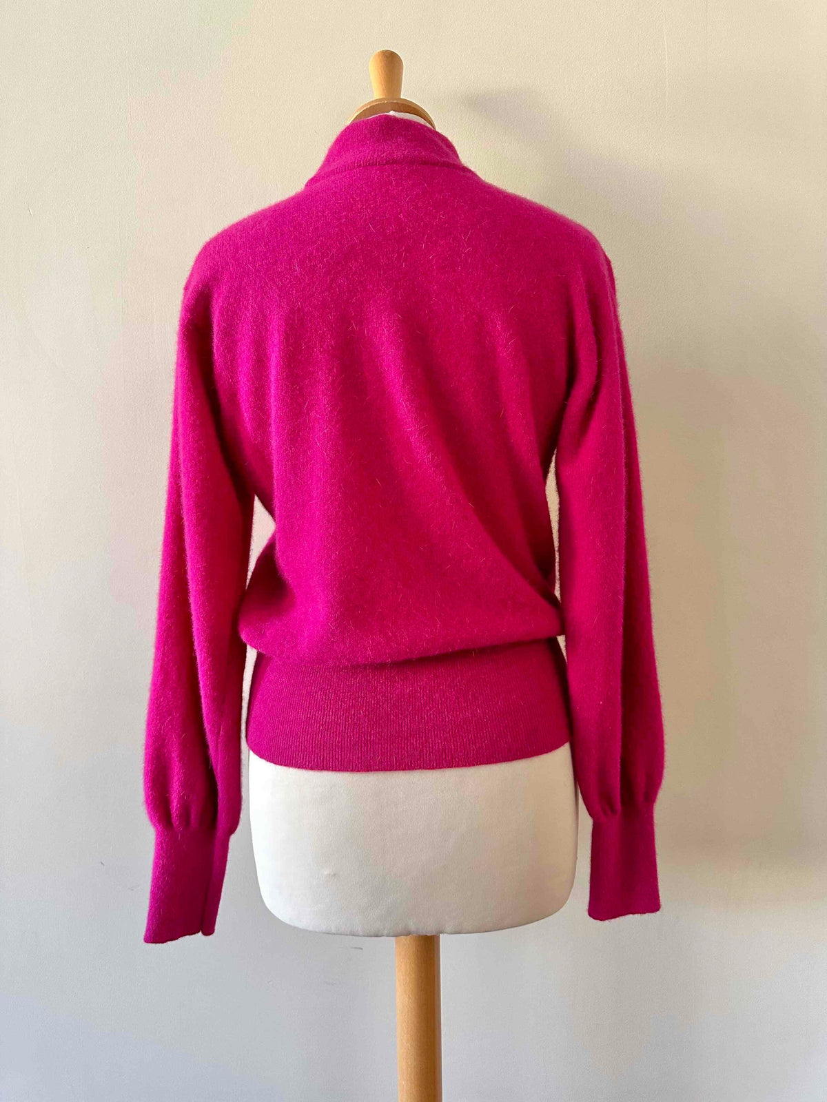 Prix unitaire parCol roulé en laine angora, laine d’agneau et angora rose fuschia, manches ballons, fabriqué en Italie, taille actuelle 36 porté ici sur un mannequin T36.