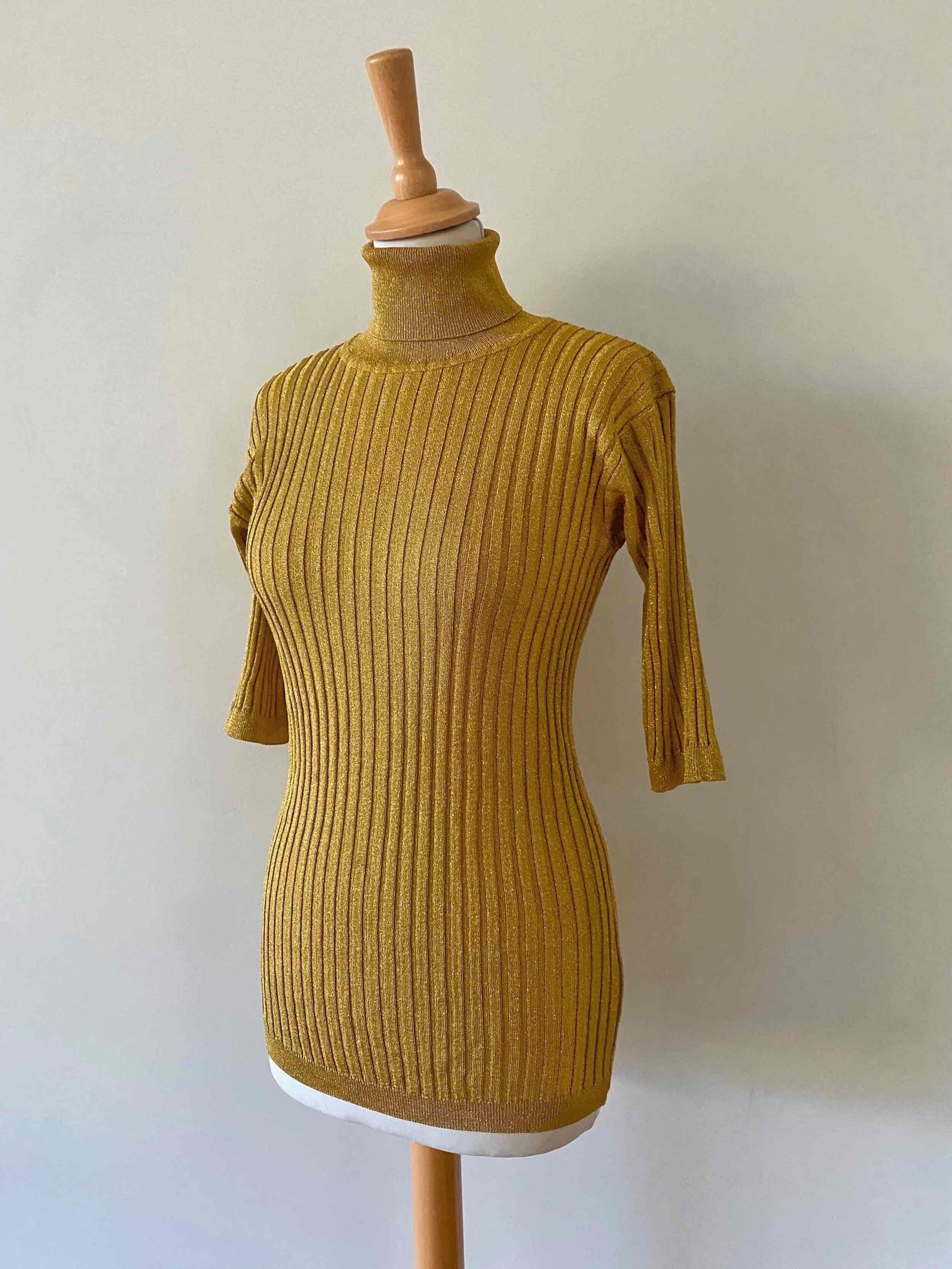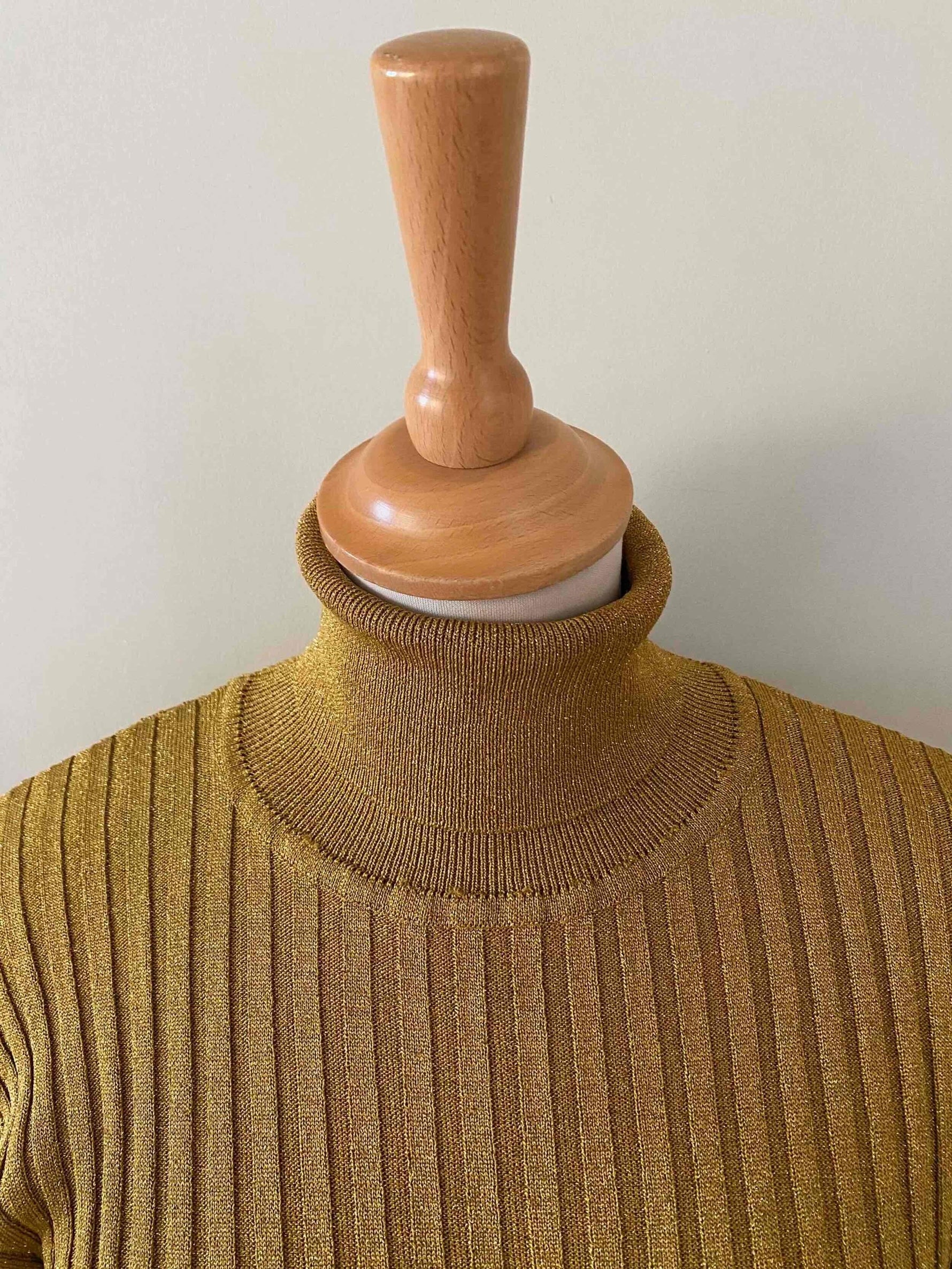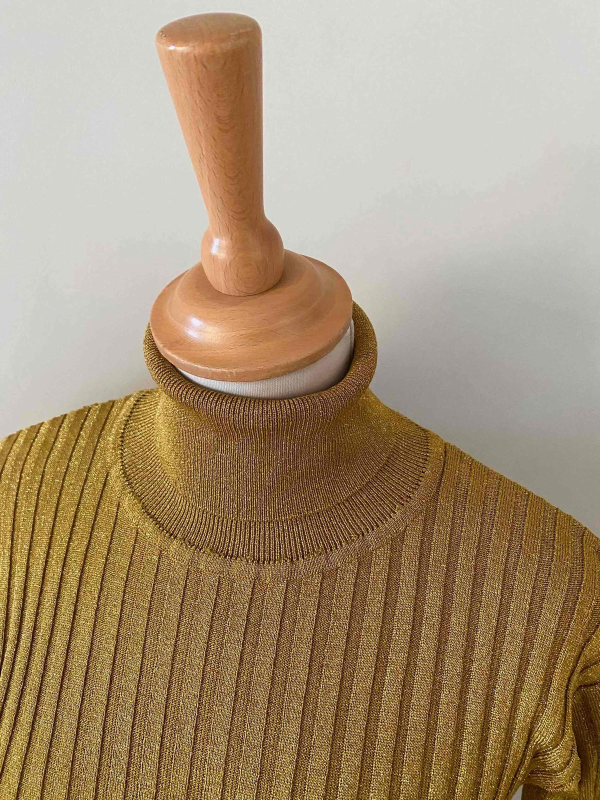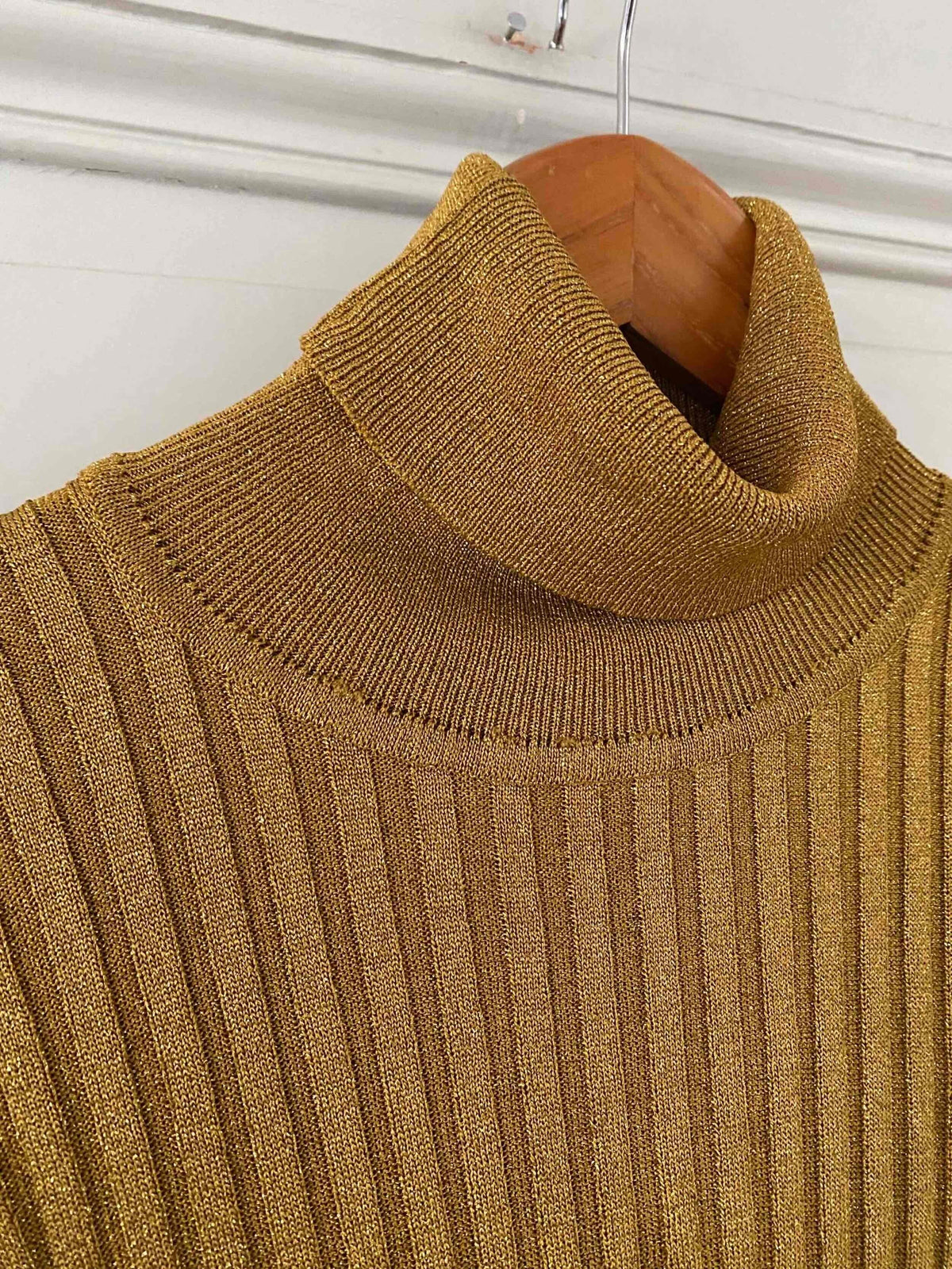 Prix unitaire parCol roulé en lurex, maille côtelée viscose et lurex doré, col roulé, manches courtes, fabriquéé en Italie, taille 36 portée ici sur un mannequin T36
