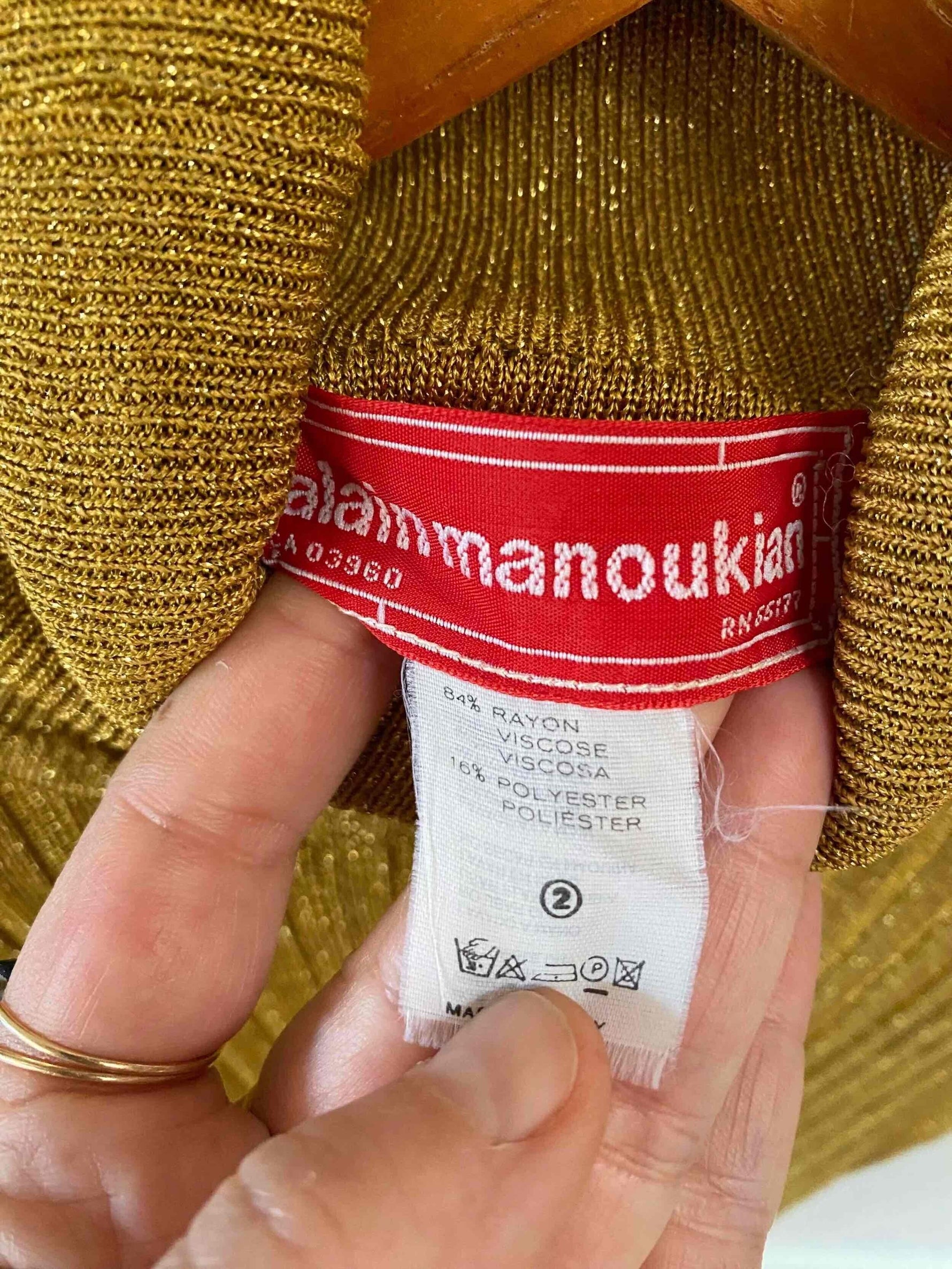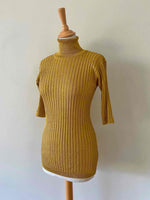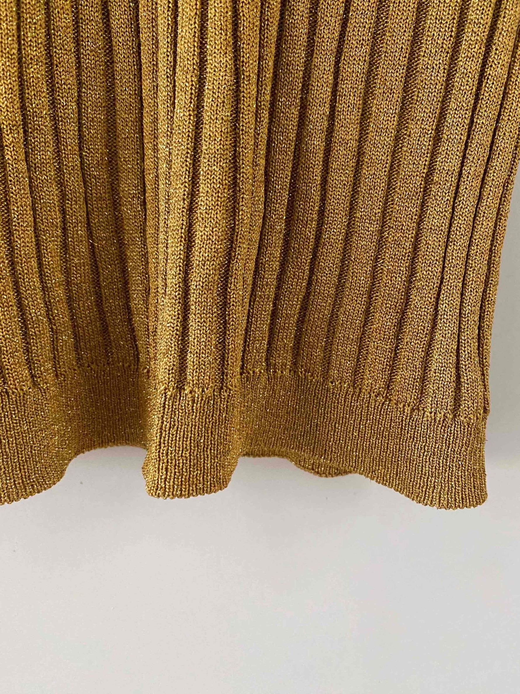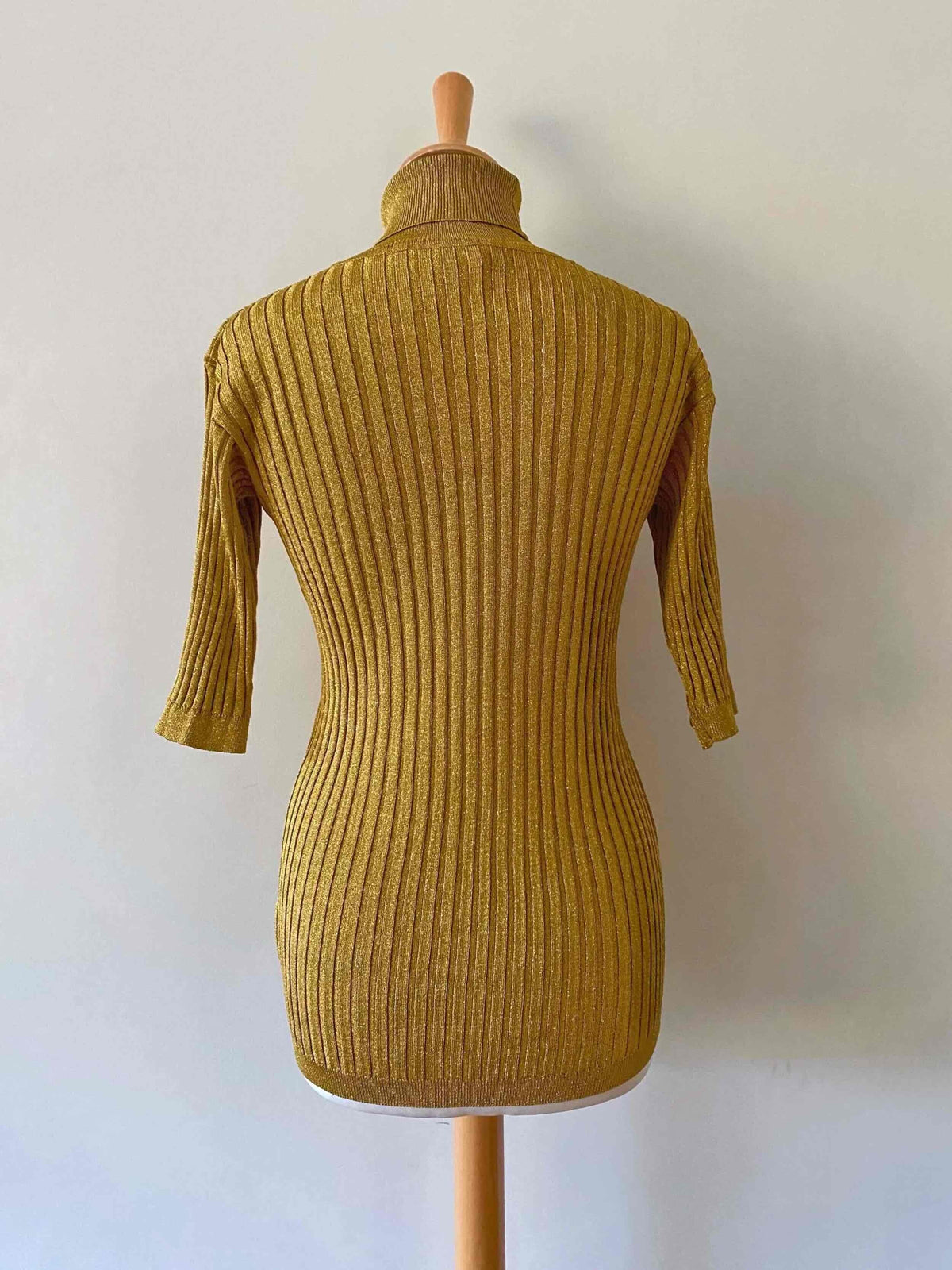 Prix unitaire parCol roulé en lurex, maille côtelée viscose et lurex doré, col roulé, manches courtes, fabriquéé en Italie, taille 36 portée ici sur un mannequin T36