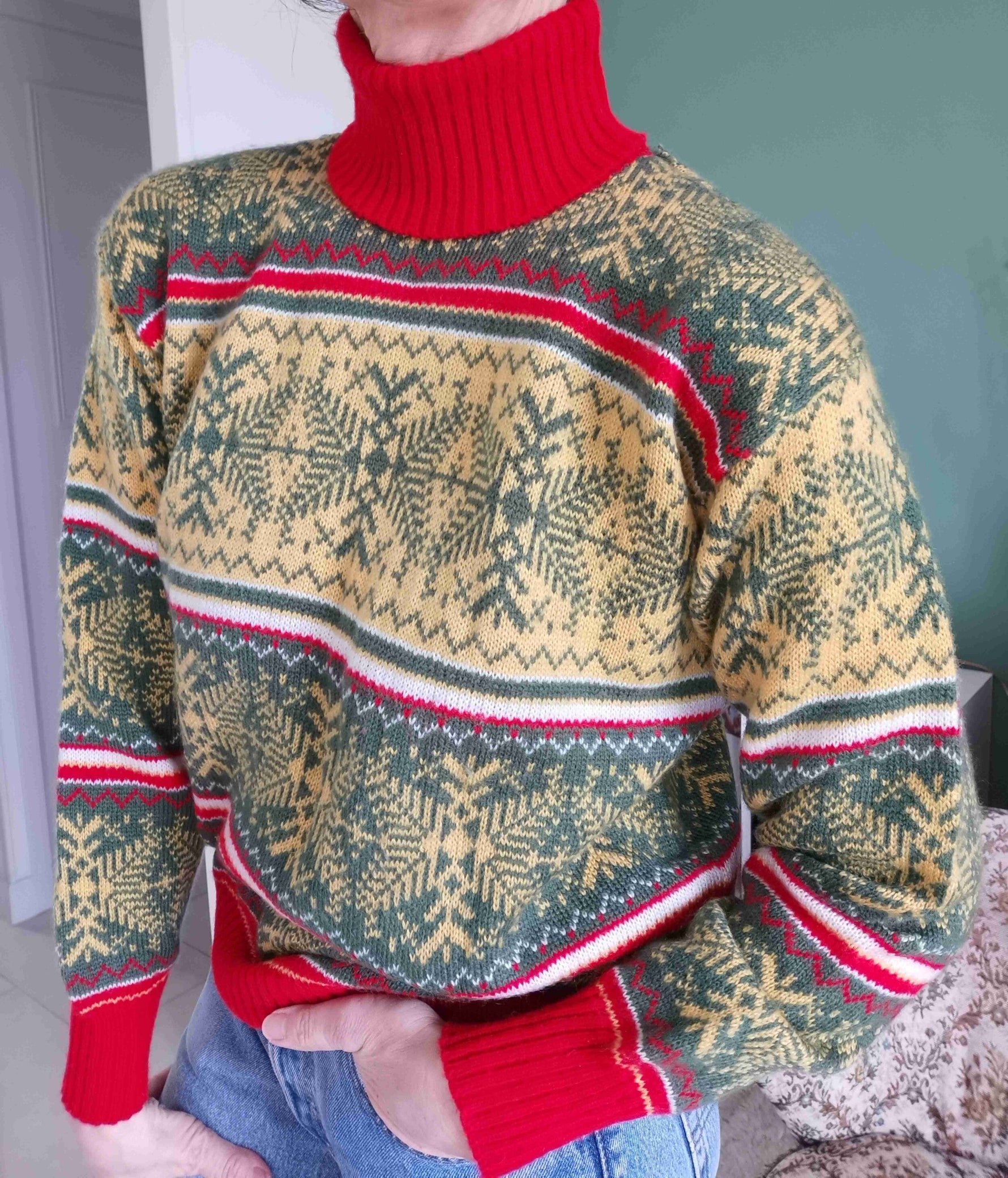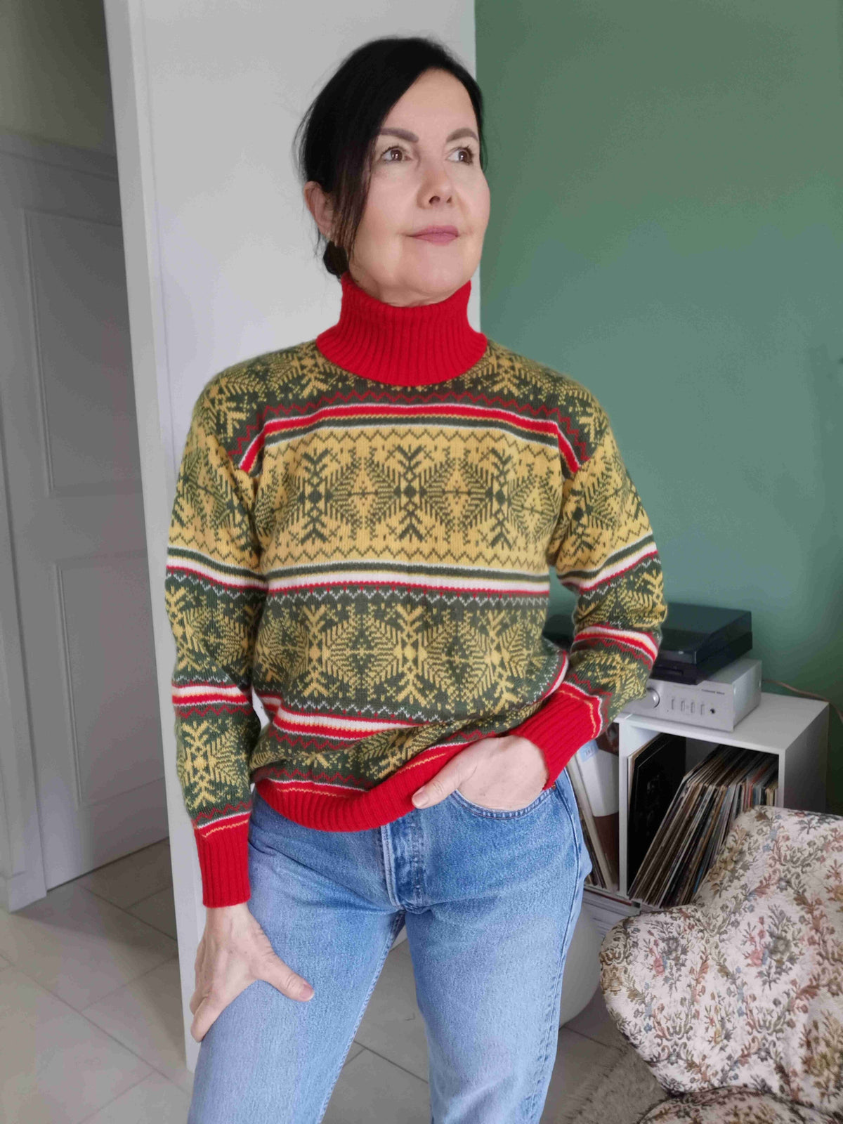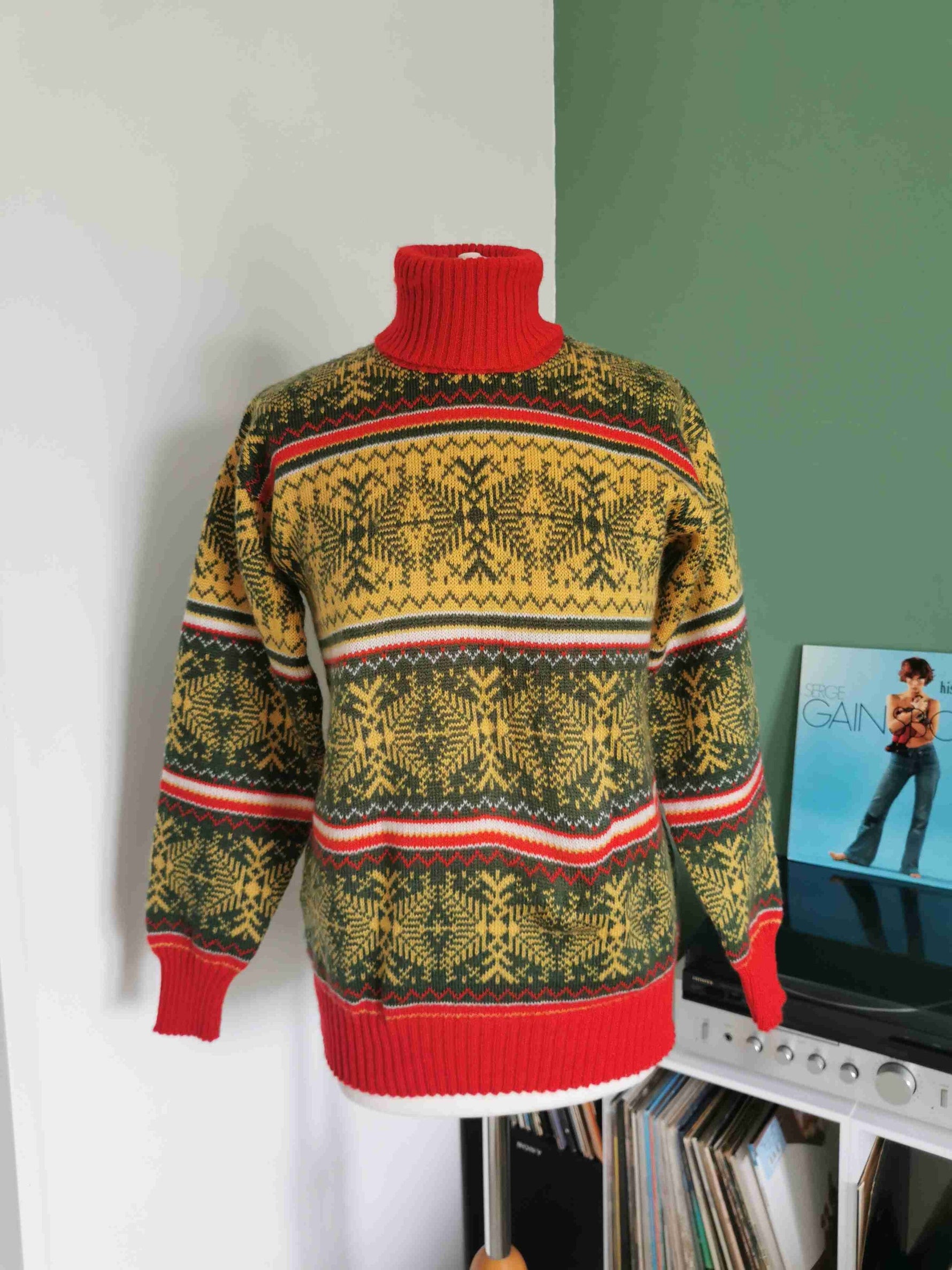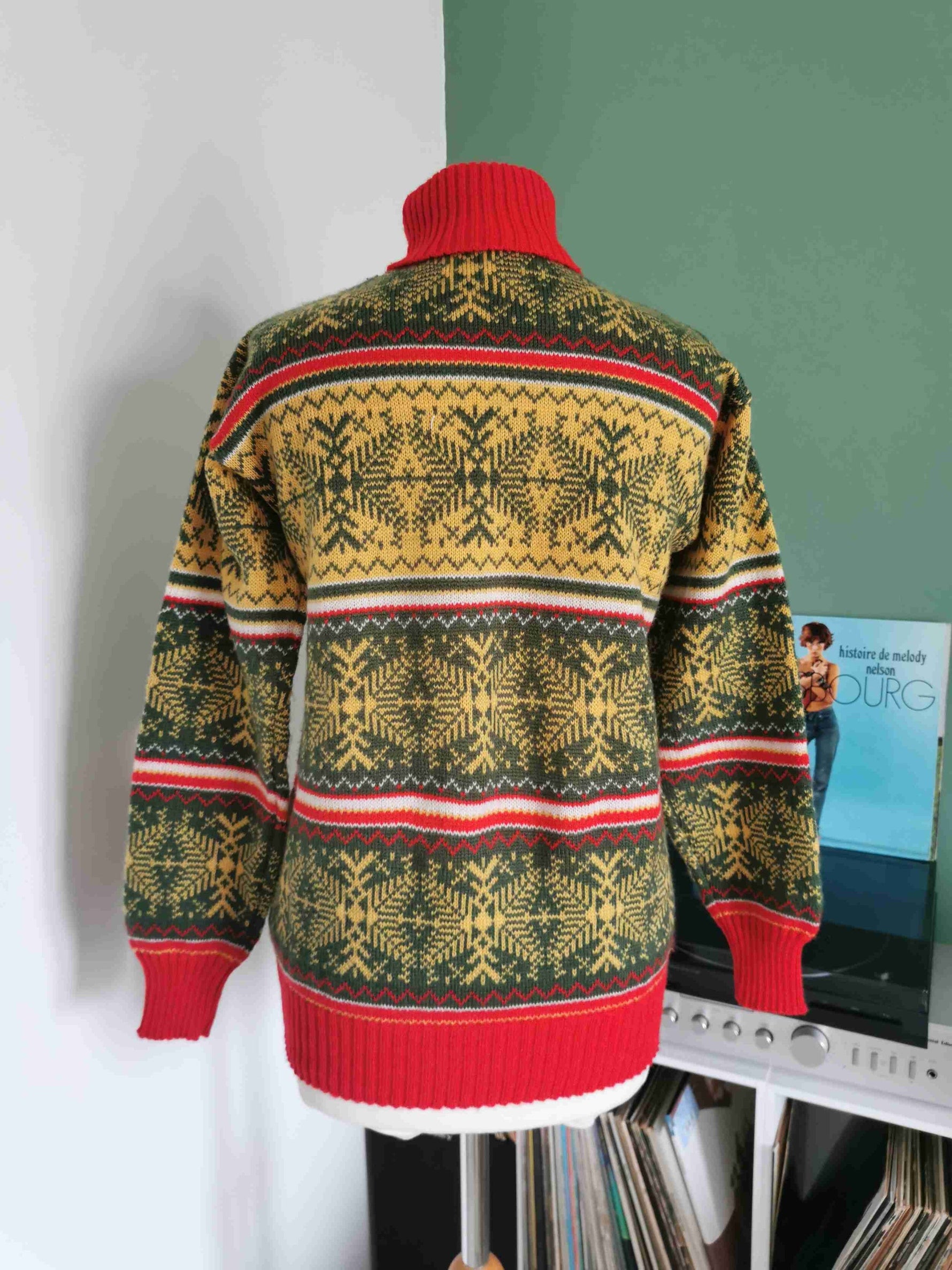 A motifs nordiques et rayures kaki, rouge, jaune moutarde et blanc