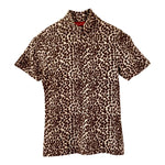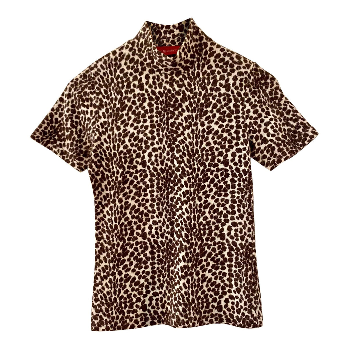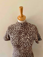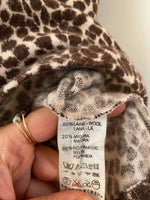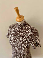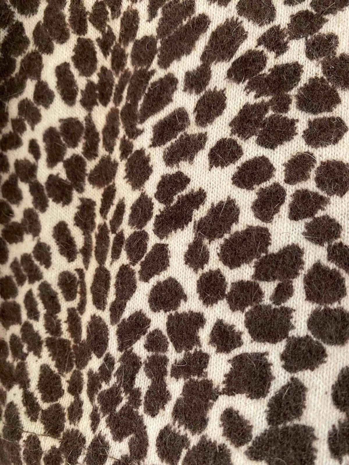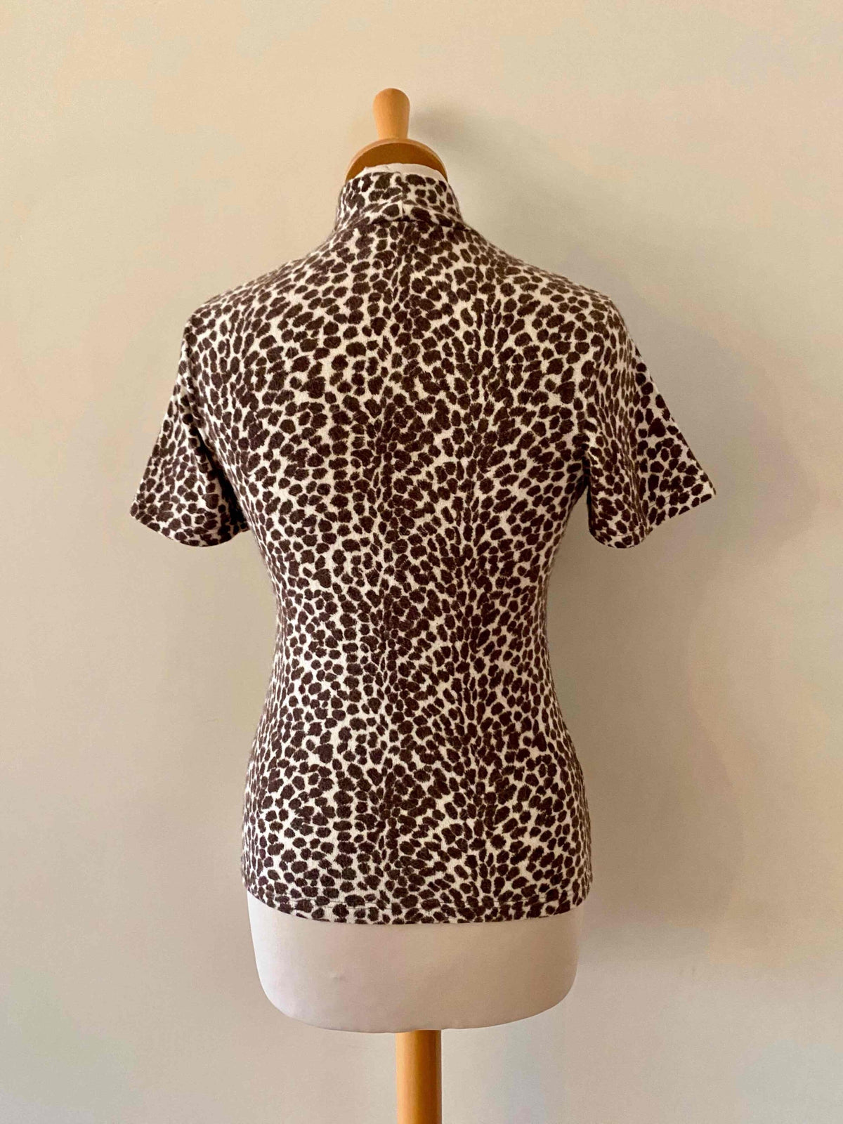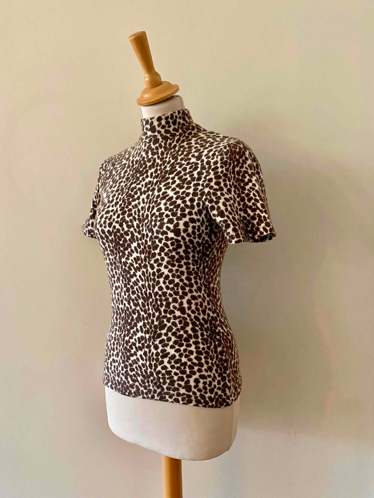 Prix unitaire parCol roulé léopard en laine angora, laine angora melangé écrue imprimée léopard chocolat, manches courtes, col montant, taille 34 et 36 porté ici sur un mannequin T36.