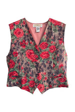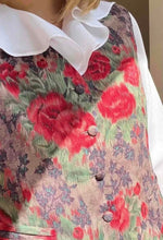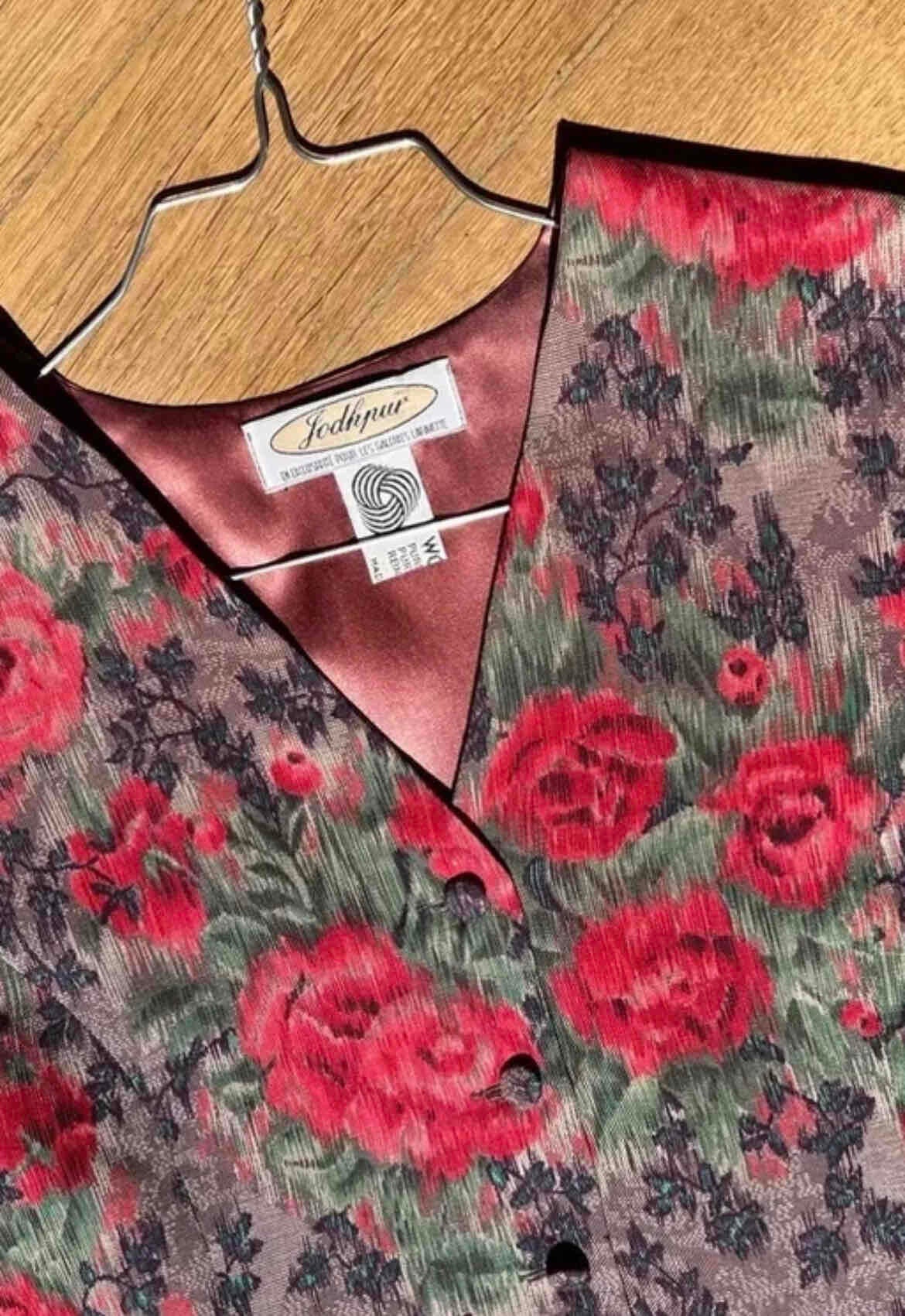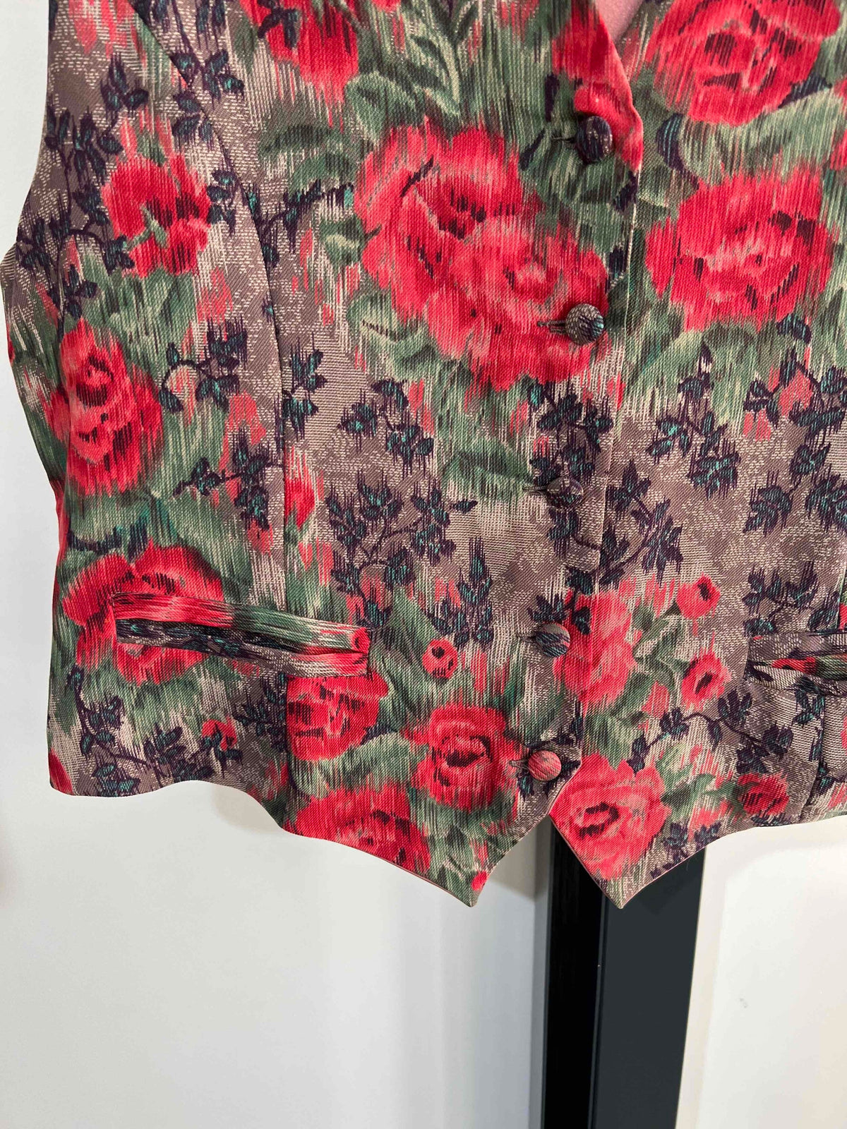 Prix unitaire parGilet en laine, sans manches/veston d’homme gris et rouge bordeaux à fleurs. Dos en tissu satiné vieux rose avec un passant pour régler la taille. Détails de boutons recouverts et petite poche. Fabrication française, marque Jodhpur.