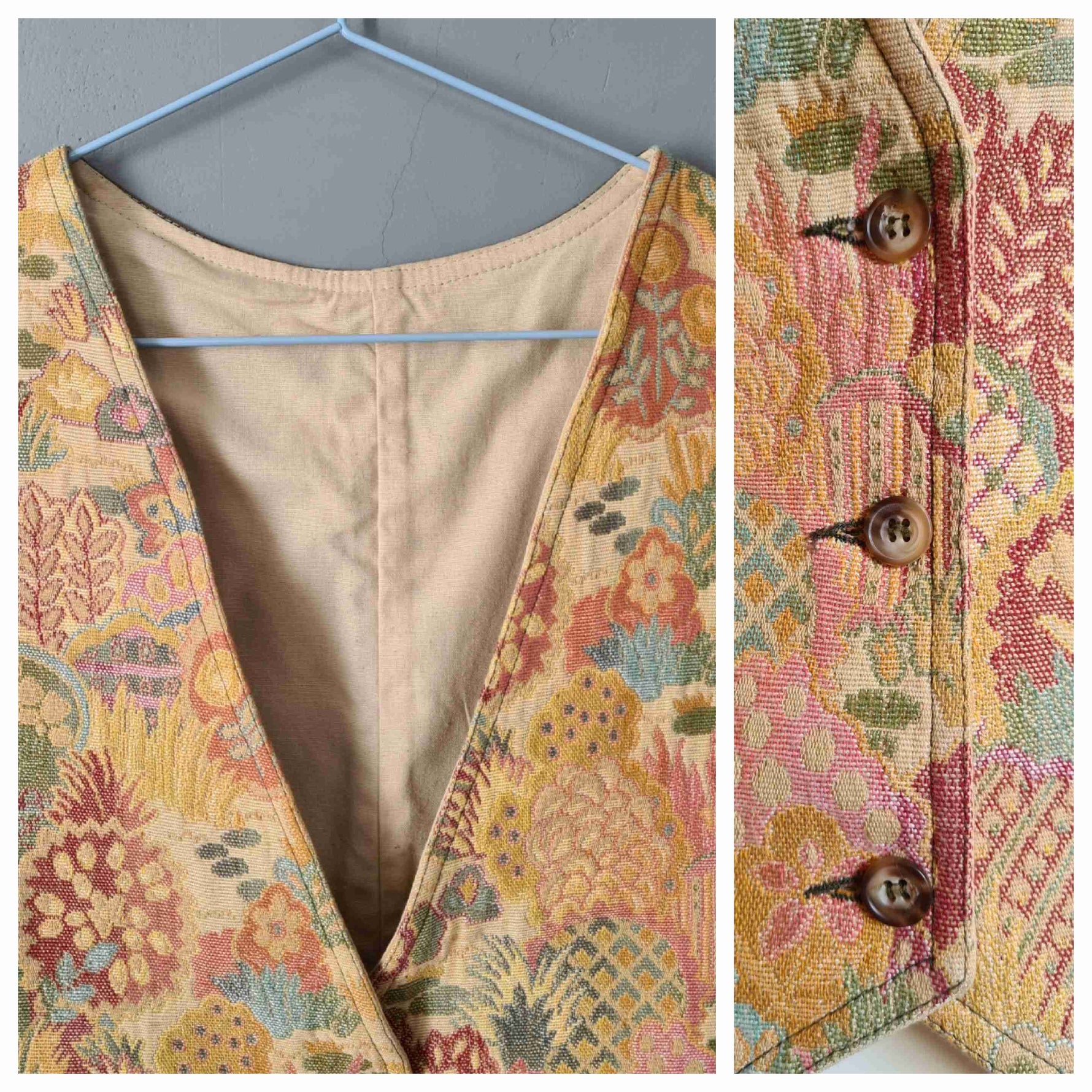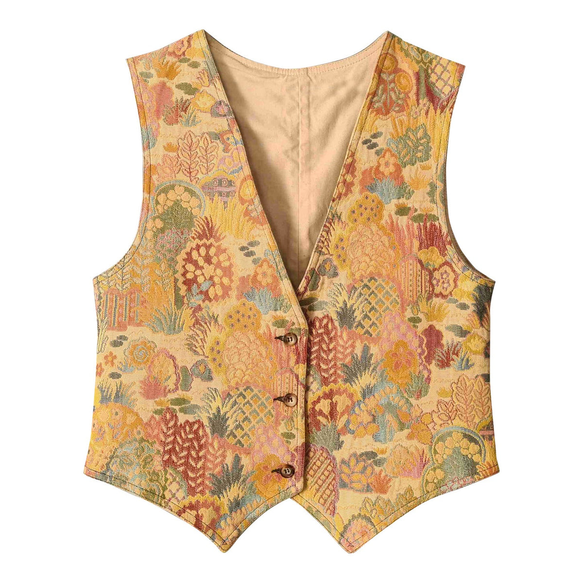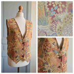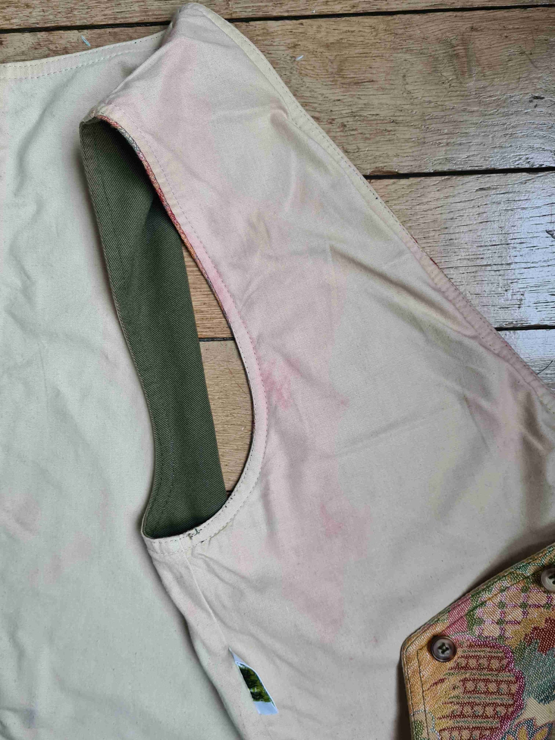 Gilet sans manches en toile de coton tapisserie pastel, motif végétal à dominante beige doré nacré, doublé coton beige, arrière en toile coton kaki avec bride et mini fente. Marque Cyrillus.