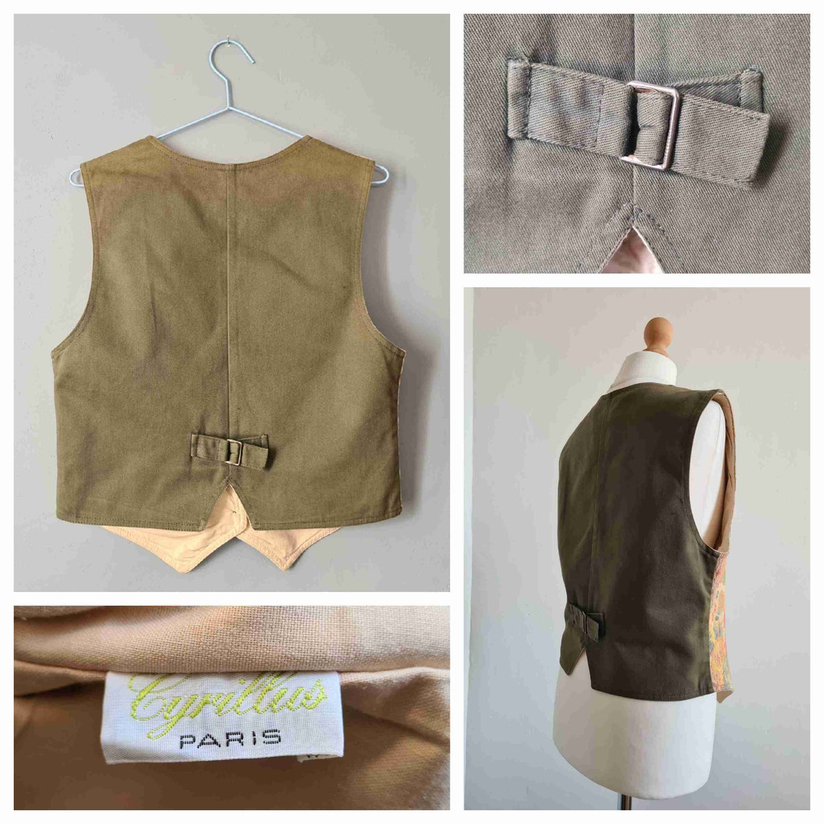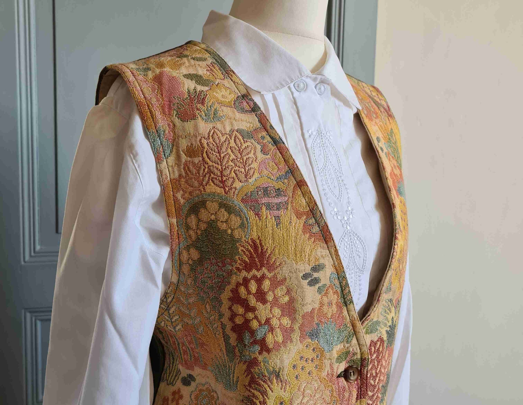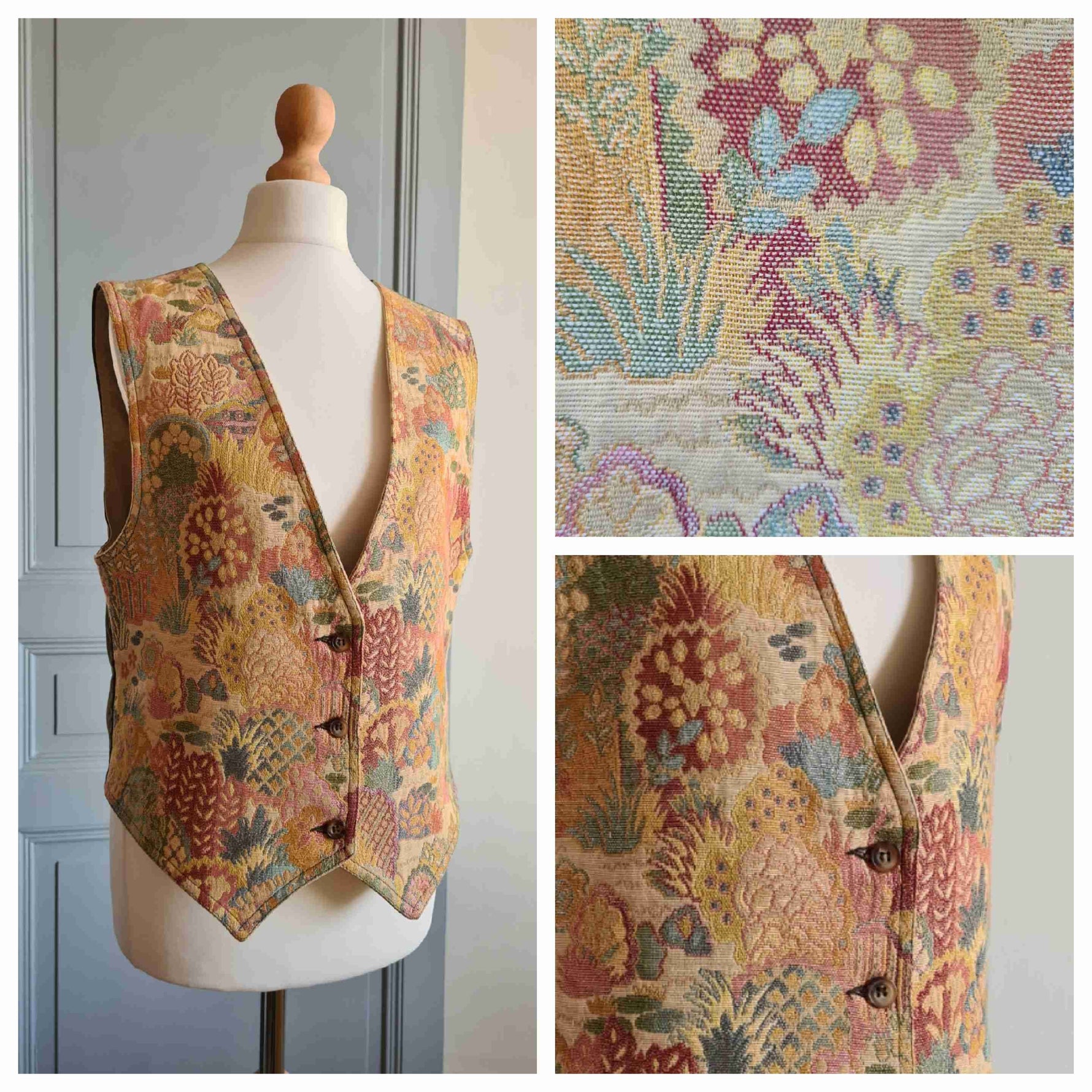 Gilet sans manches en toile de coton tapisserie pastel, motif végétal à dominante beige doré nacré, doublé coton beige, arrière en toile coton kaki avec bride et mini fente. Marque Cyrillus.