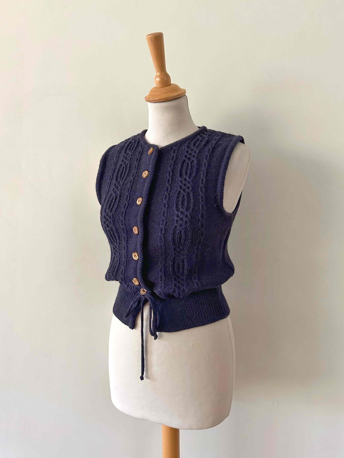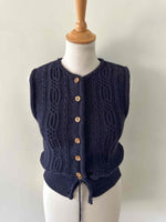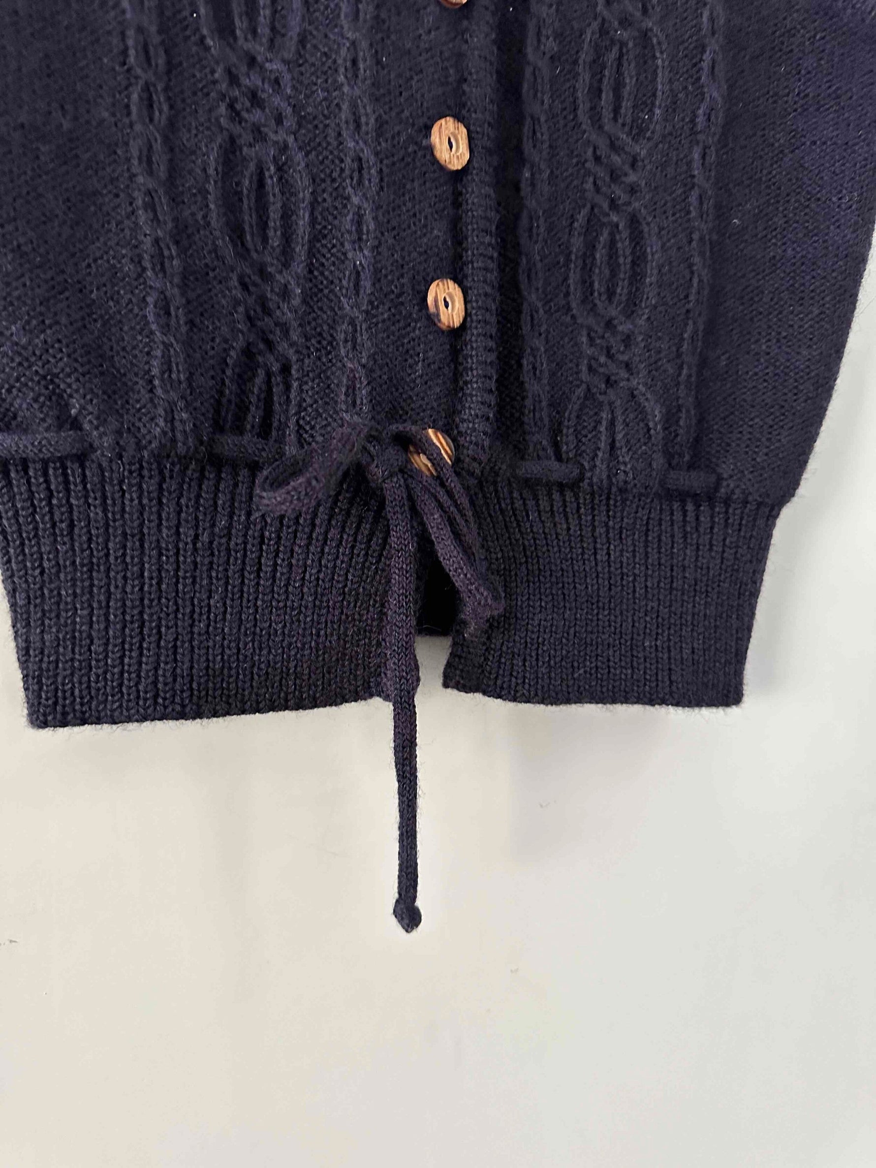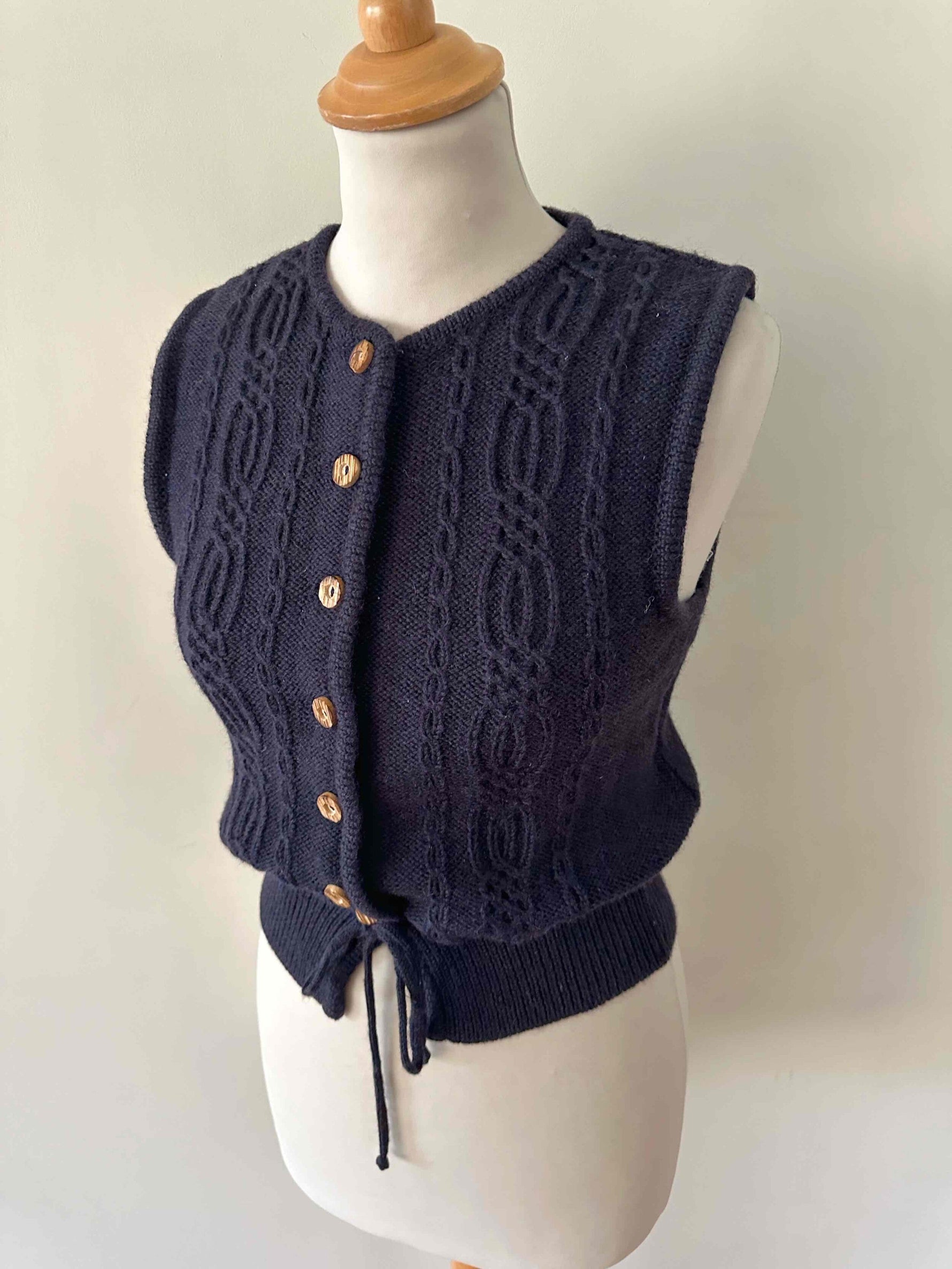 Prix unitaire parGilet Autrichien en pure laine bleue nuit, maille torsadée et tressée, boutons en bois, taille à nouer, fabriqué en Autriche, taille 34 porté ici sur un mannequin T36.