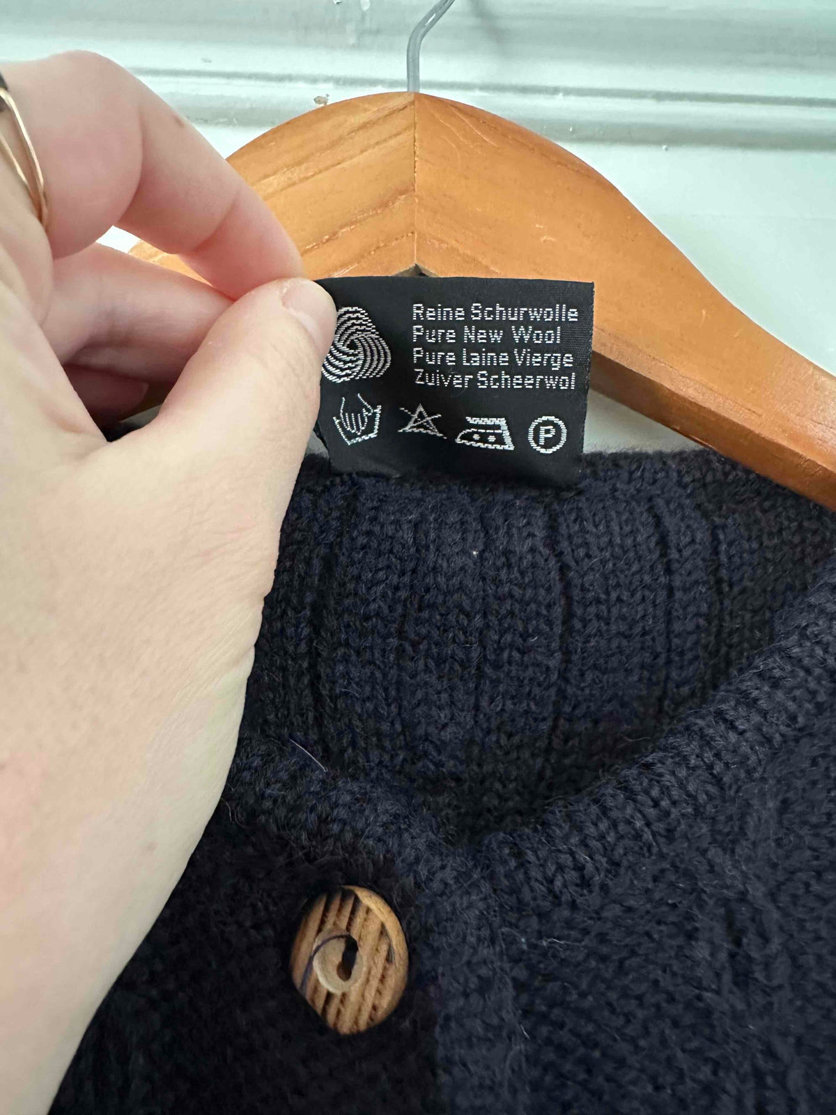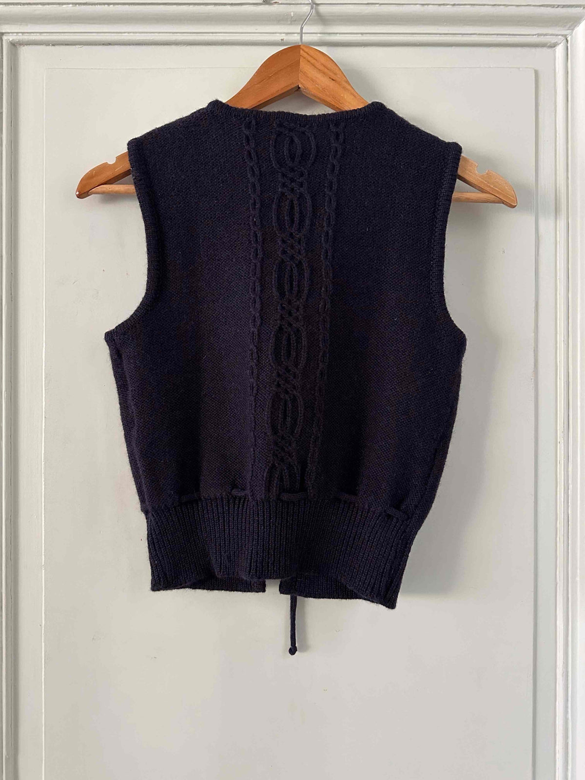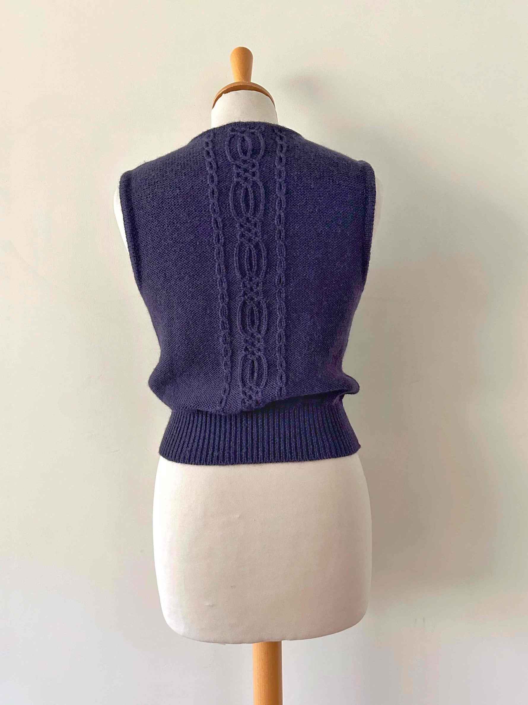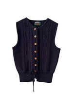 Prix unitaire parGilet Autrichien en pure laine bleue nuit, maille torsadée et tressée, boutons en bois, taille à nouer, fabriqué en Autriche, taille 34 porté ici sur un mannequin T36.