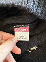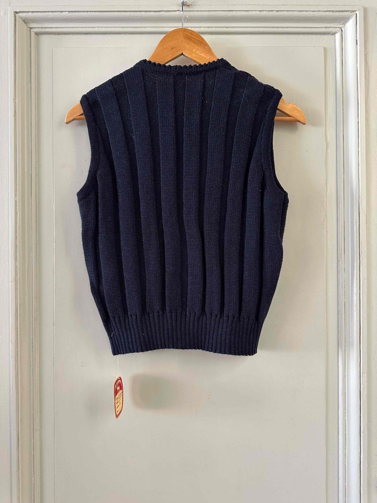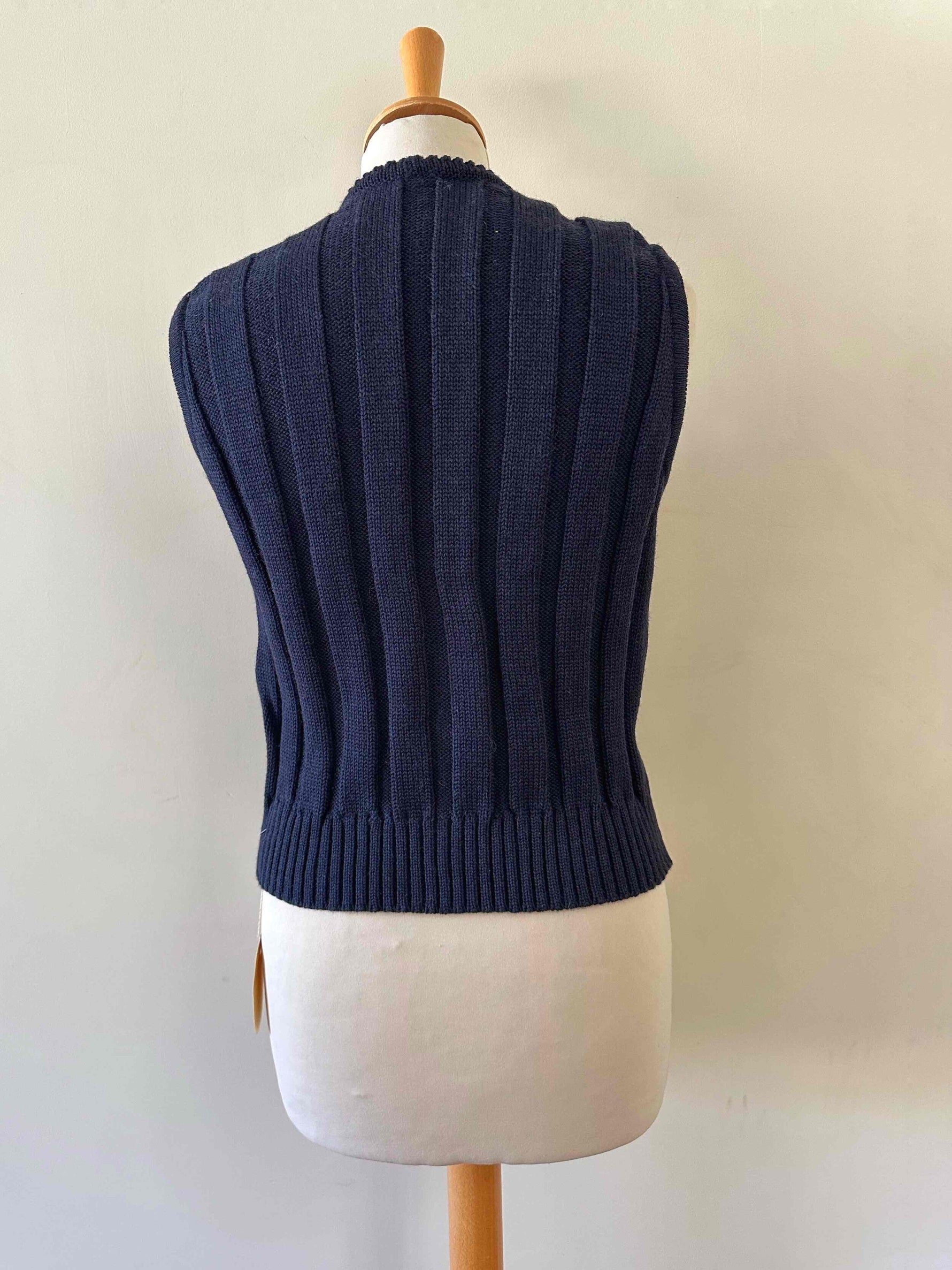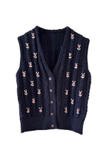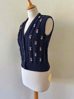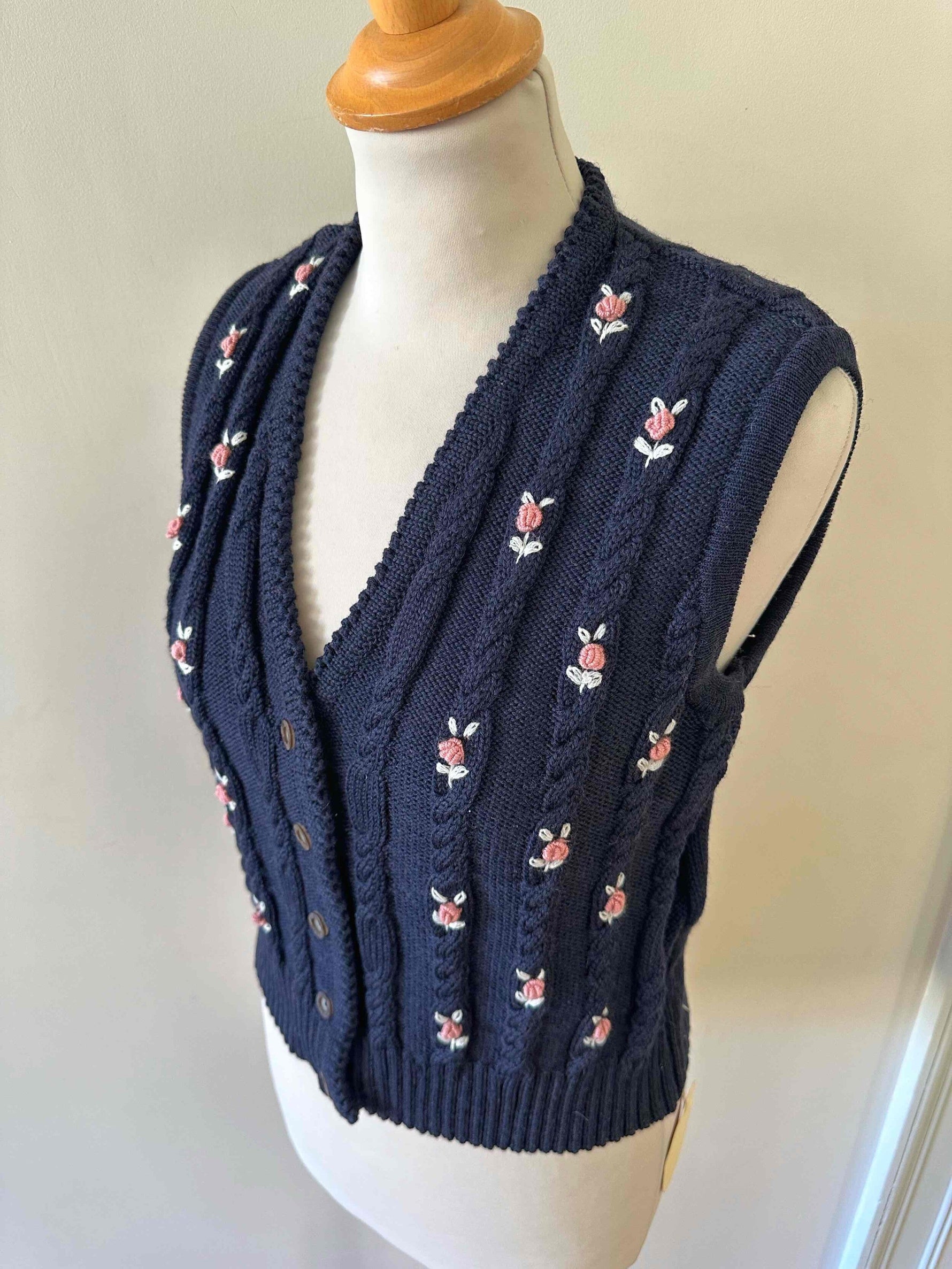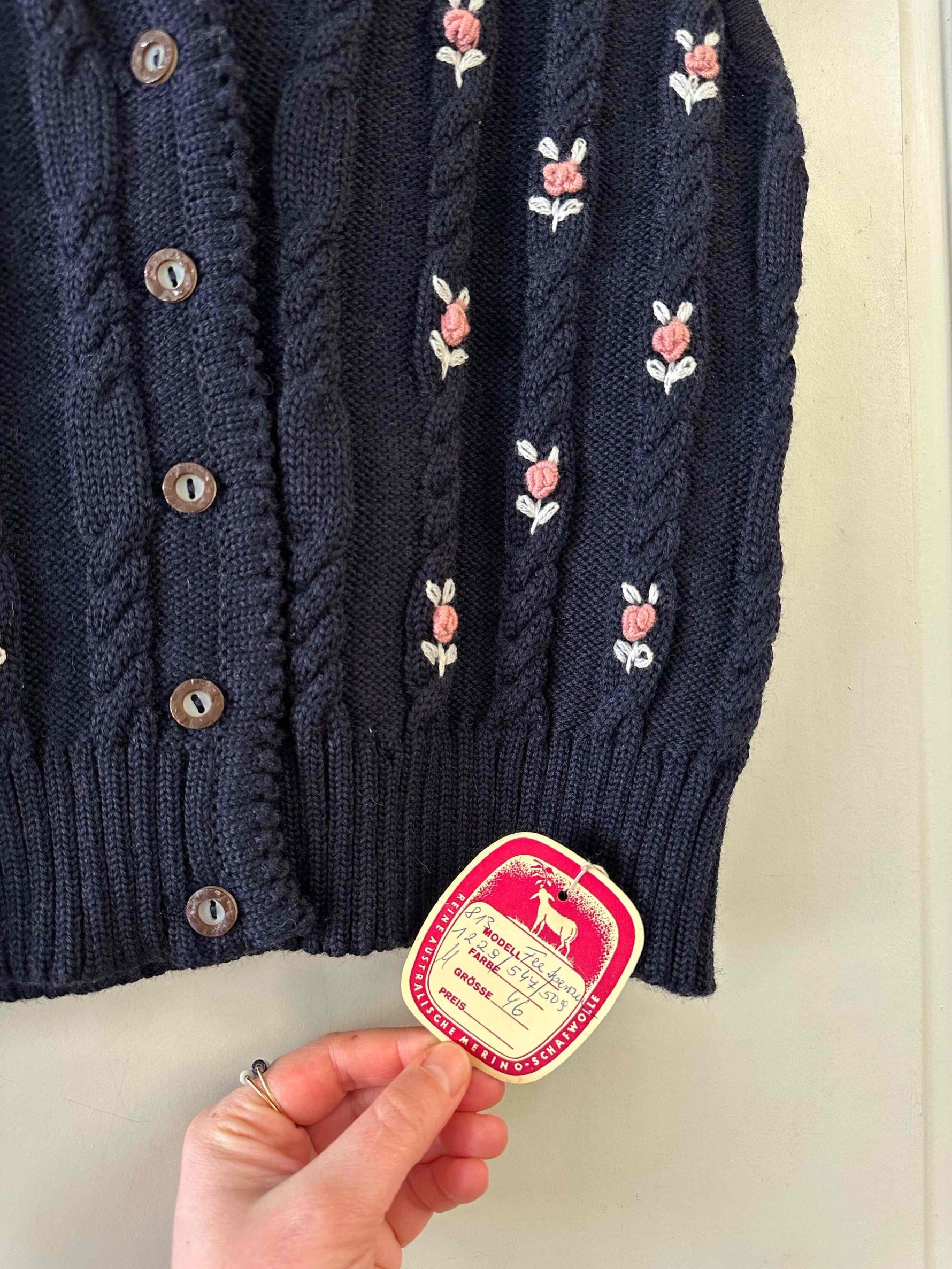 Gilet autrichien sans manches en pure laine bleue nuit, maille torsadée brodée de fleurs roses et écrues, col V, boutons bois, fabriqué et brodé mains en Autriche, taille 36 et 38 porté ici sur un mannequin T36. Étiquettes d’origines, années 80s.