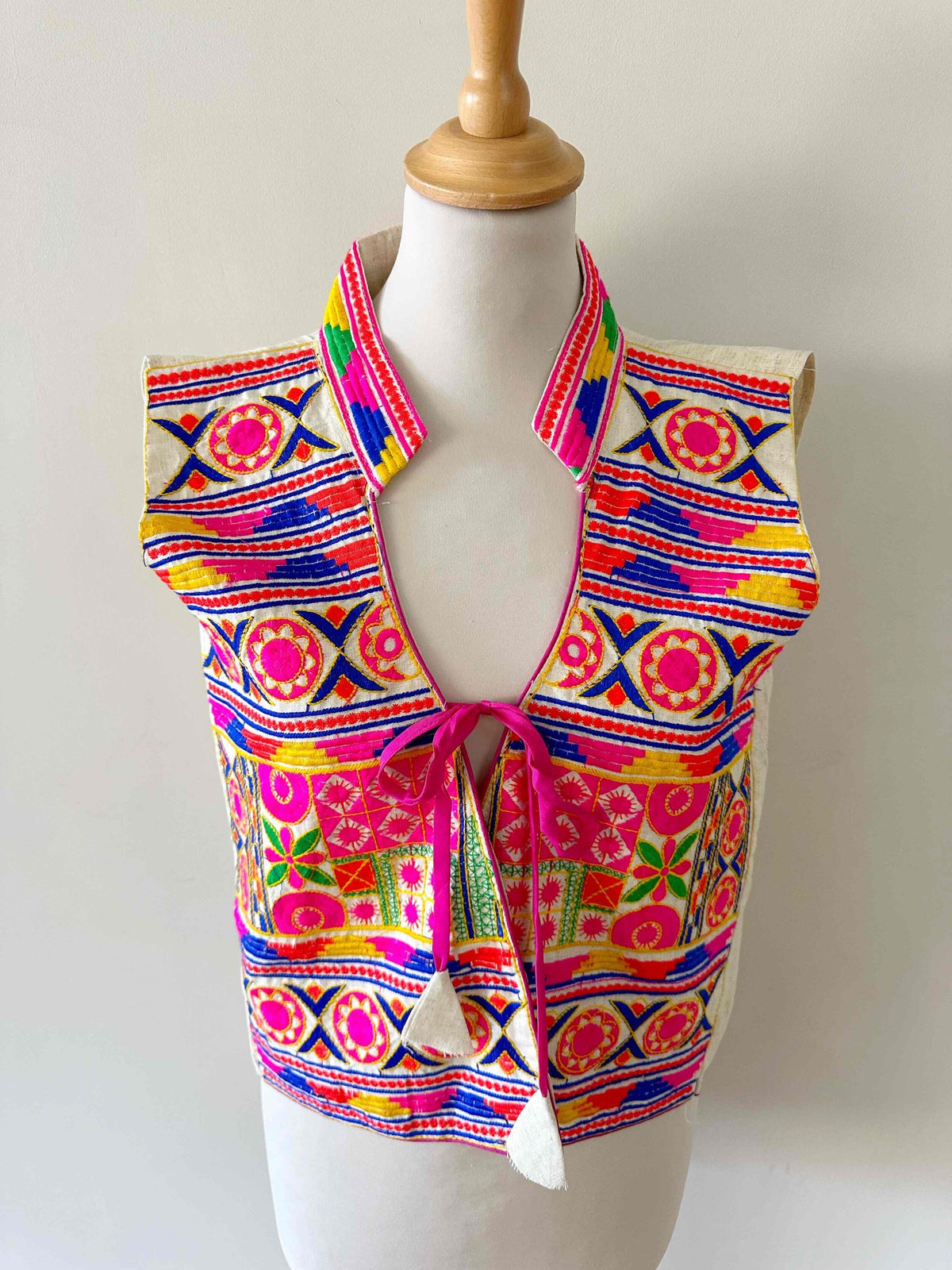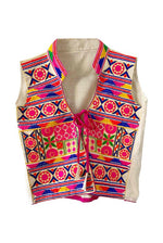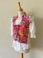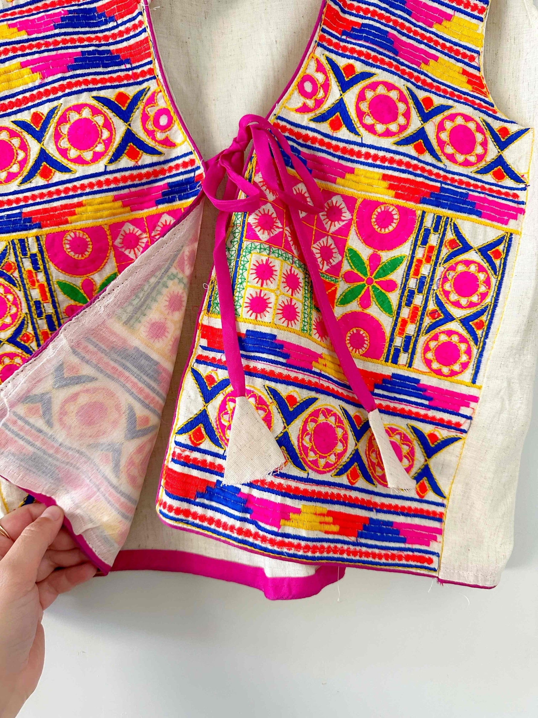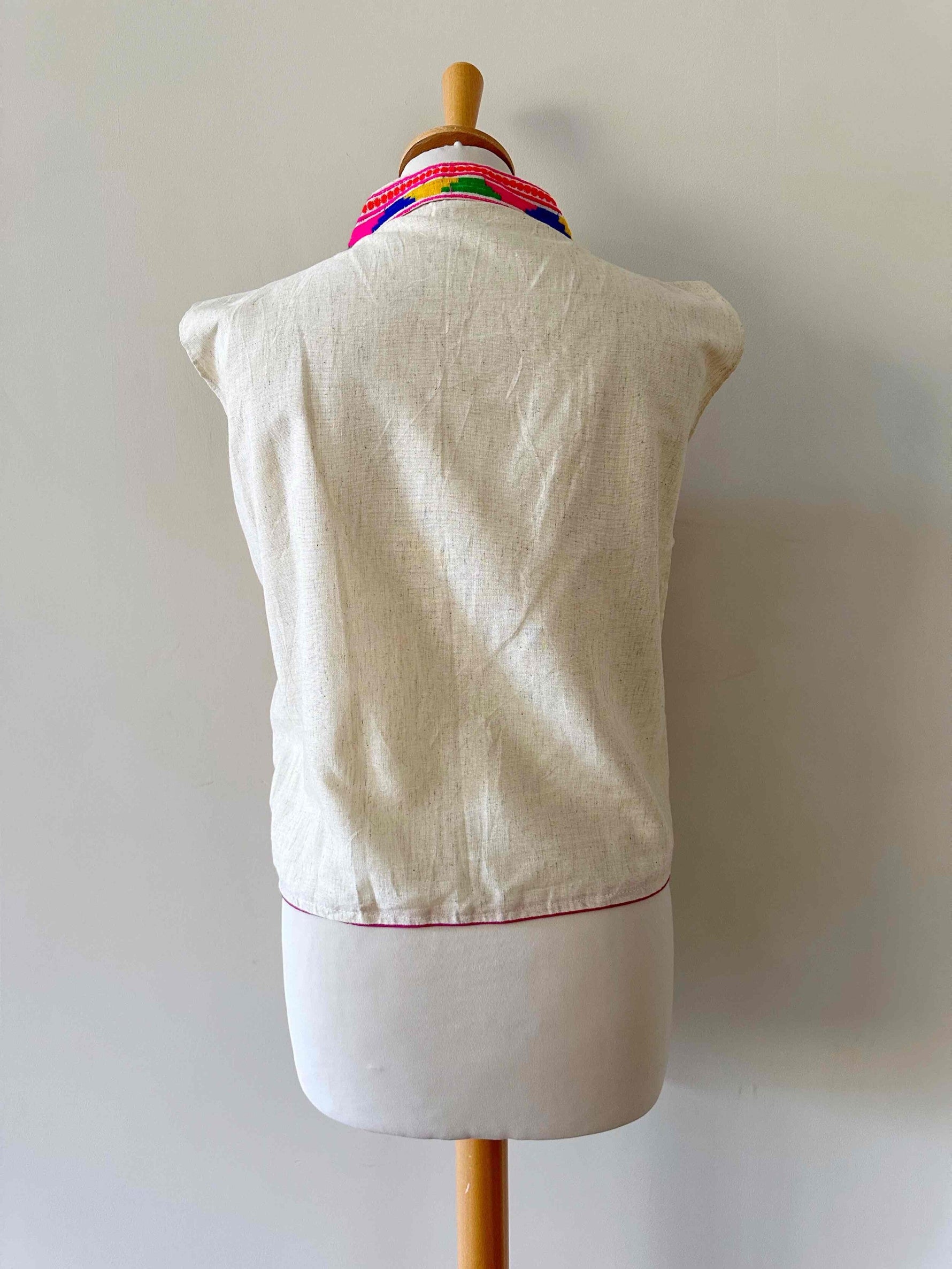 Prix unitaire parGilet sans manches brodé, en coton et broderies traditionnelles indiennes multicolores, col montant, poitrine à nouer, taille 36 porté ici sur un mannequin T36.