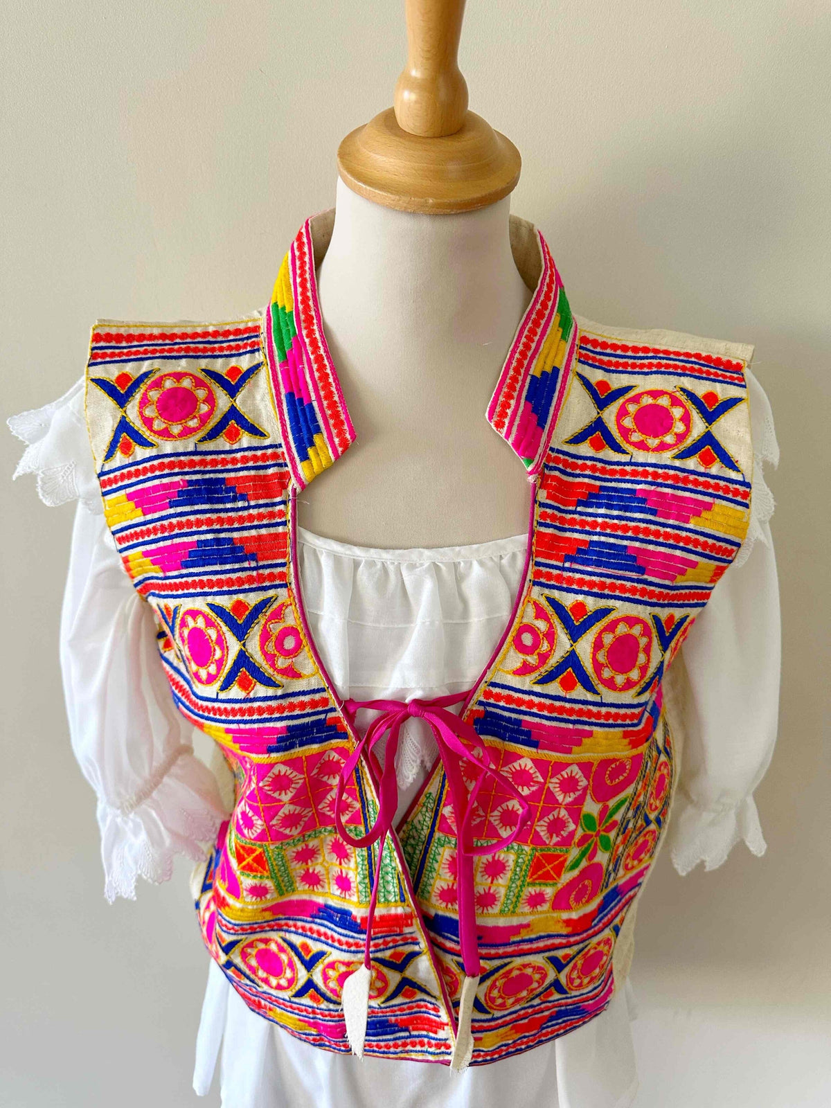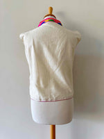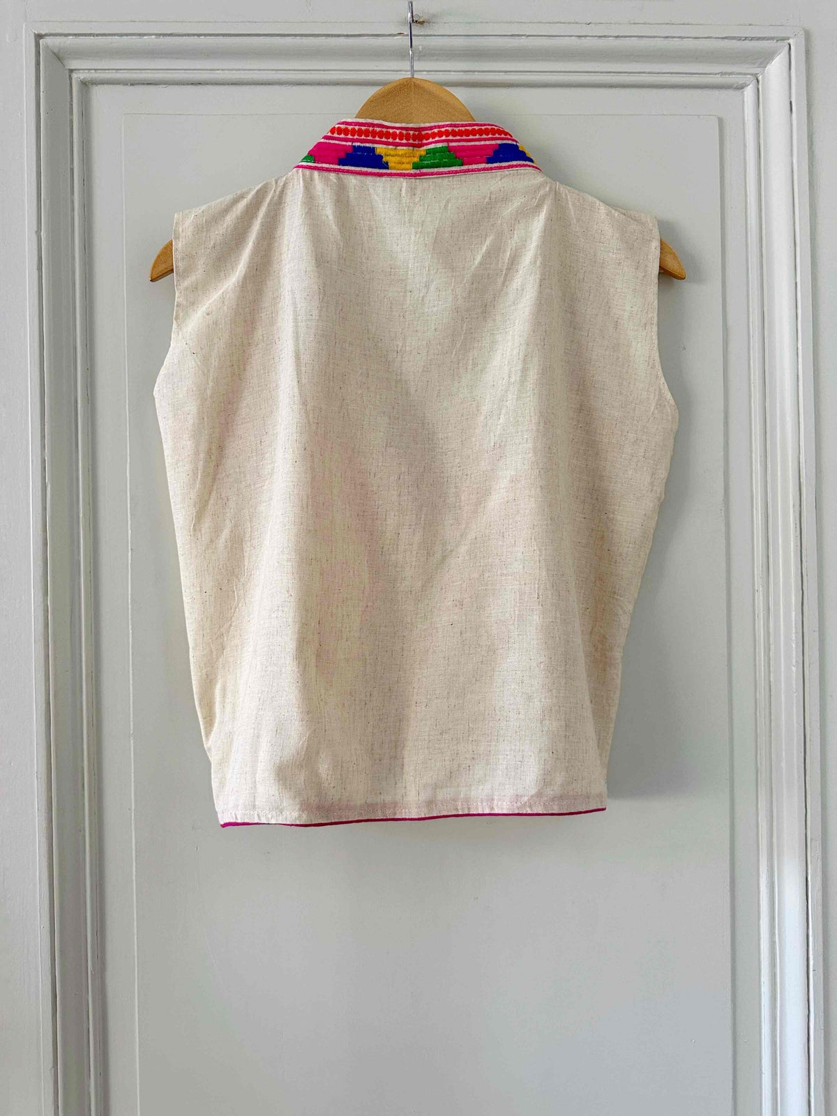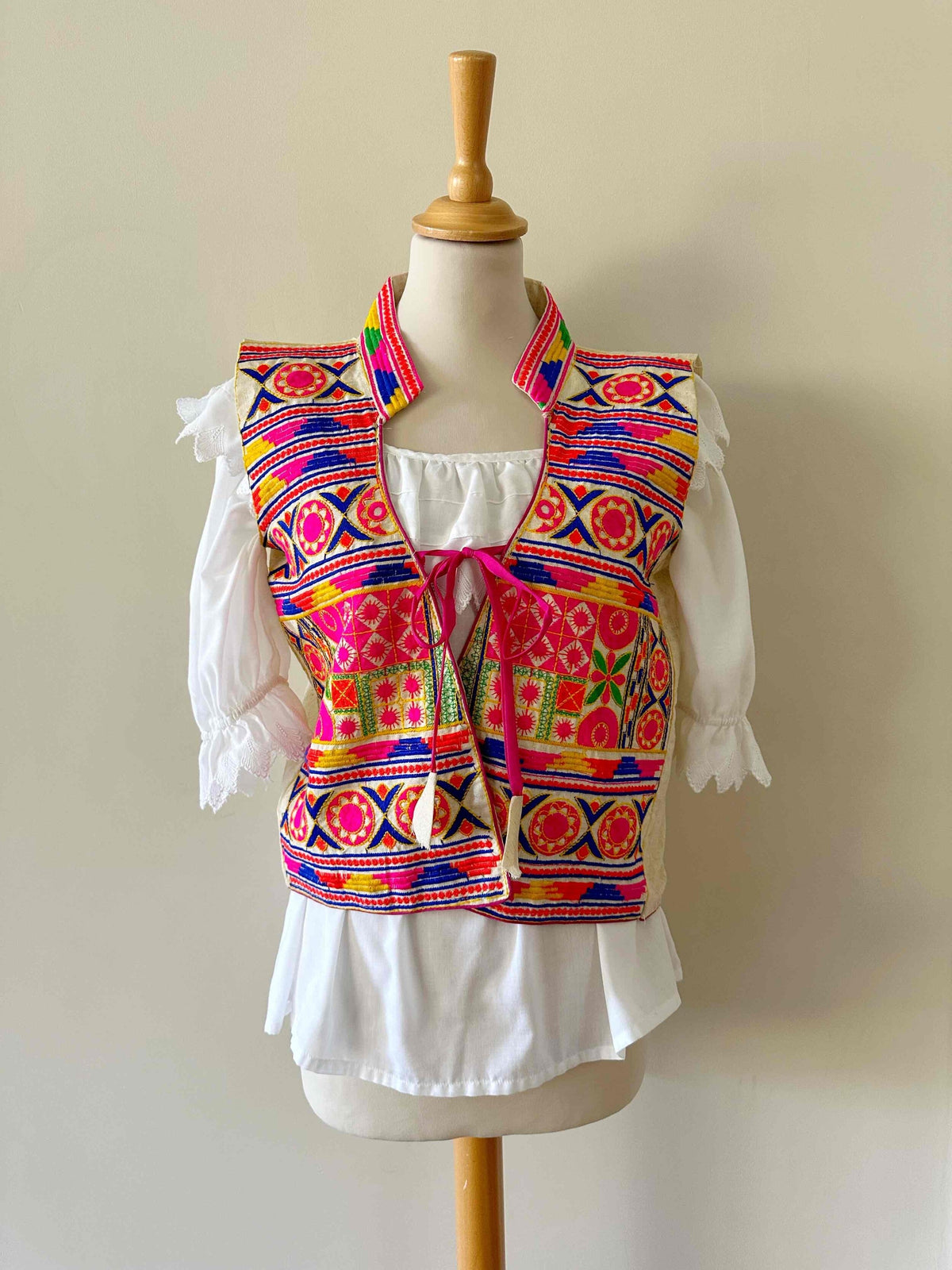 Prix unitaire parGilet sans manches brodé, en coton et broderies traditionnelles indiennes multicolores, col montant, poitrine à nouer, taille 36 porté ici sur un mannequin T36.