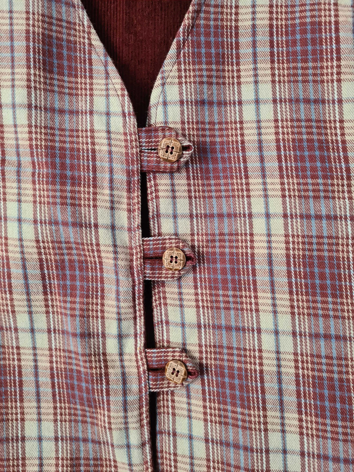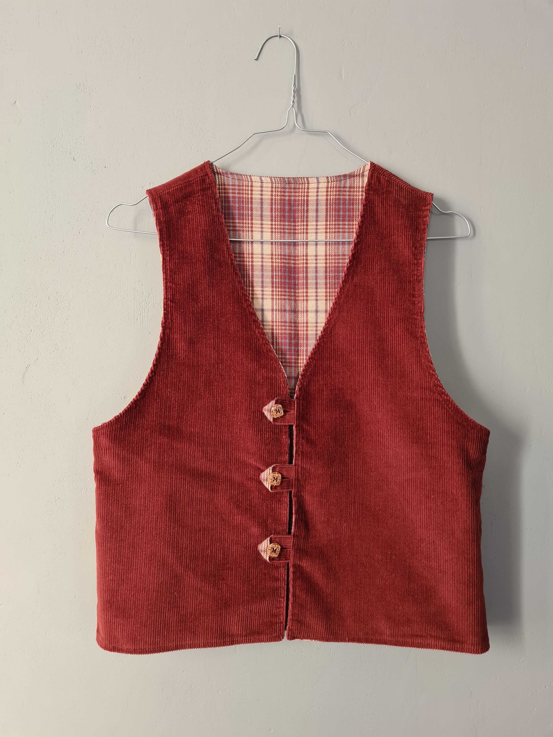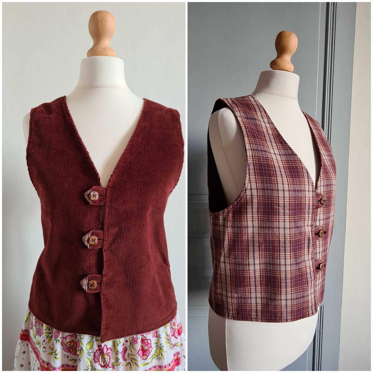 Gilet velours bordeaux à fines côtes, coupe droite, réversible, trois boutons à brides de chaque côté. Envers en flanelle de coton écossaise. Sans étiquette.