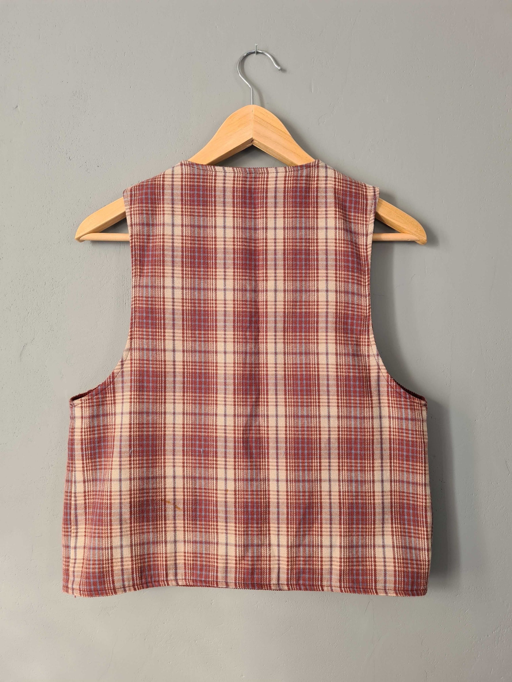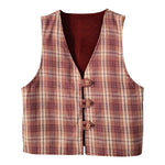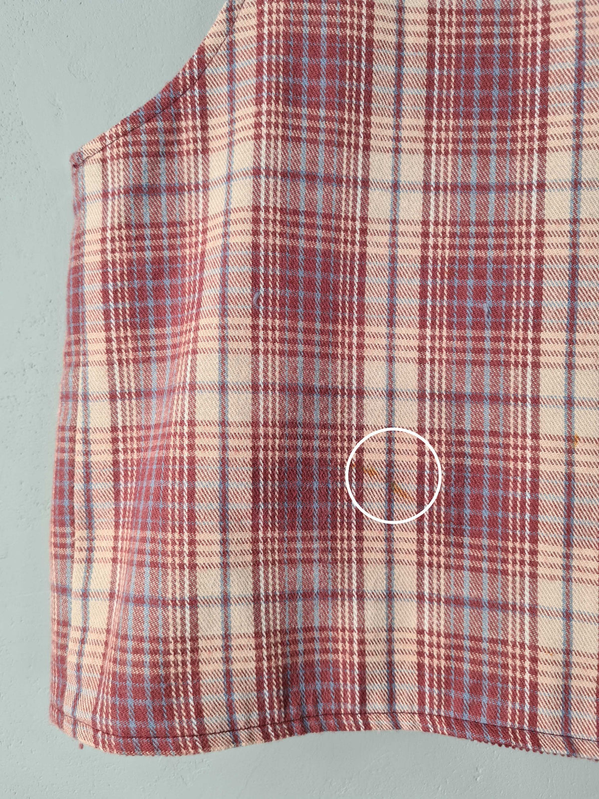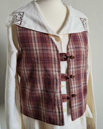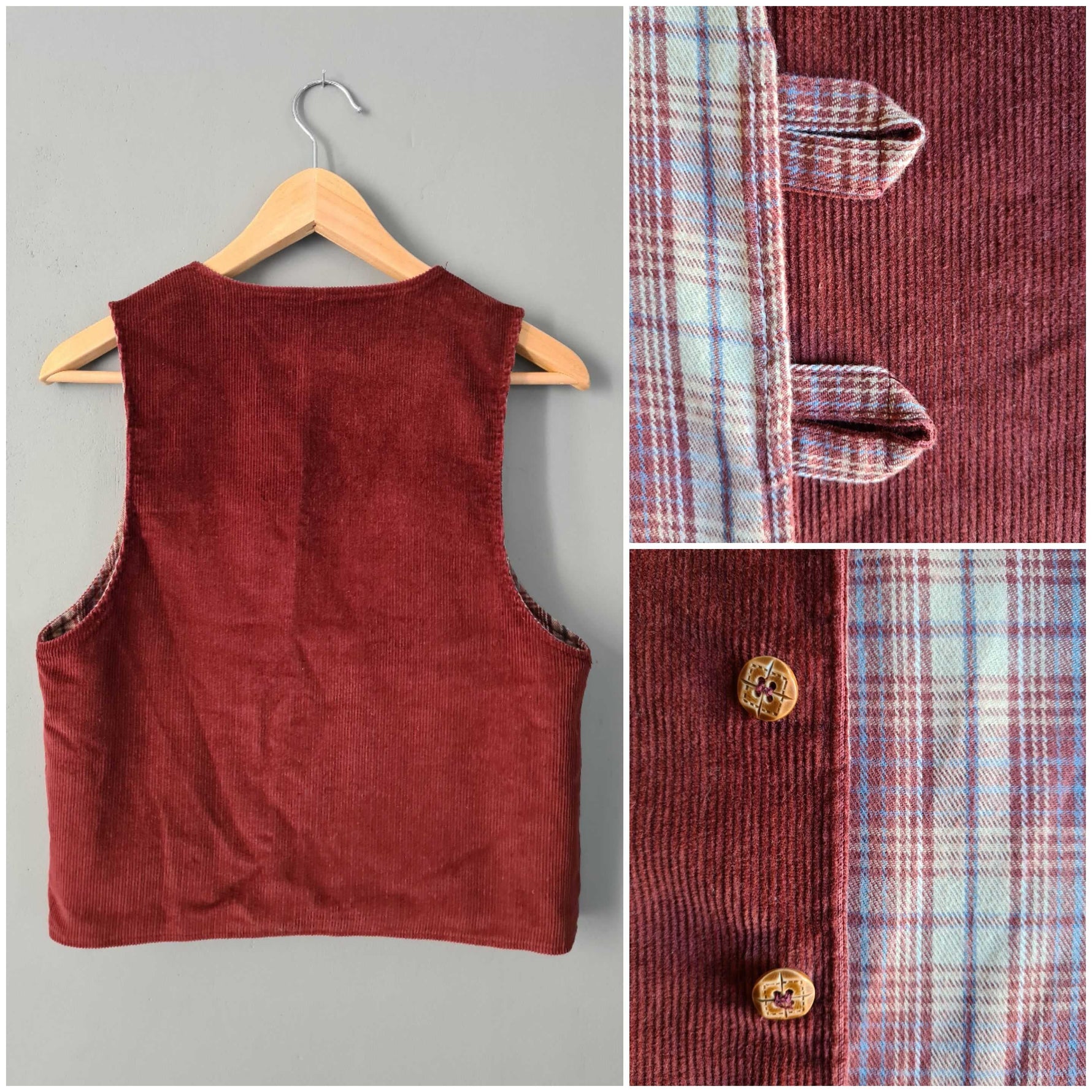 Gilet velours bordeaux à fines côtes, coupe droite, réversible, trois boutons à brides de chaque côté. Envers en flanelle de coton écossaise. Sans étiquette.