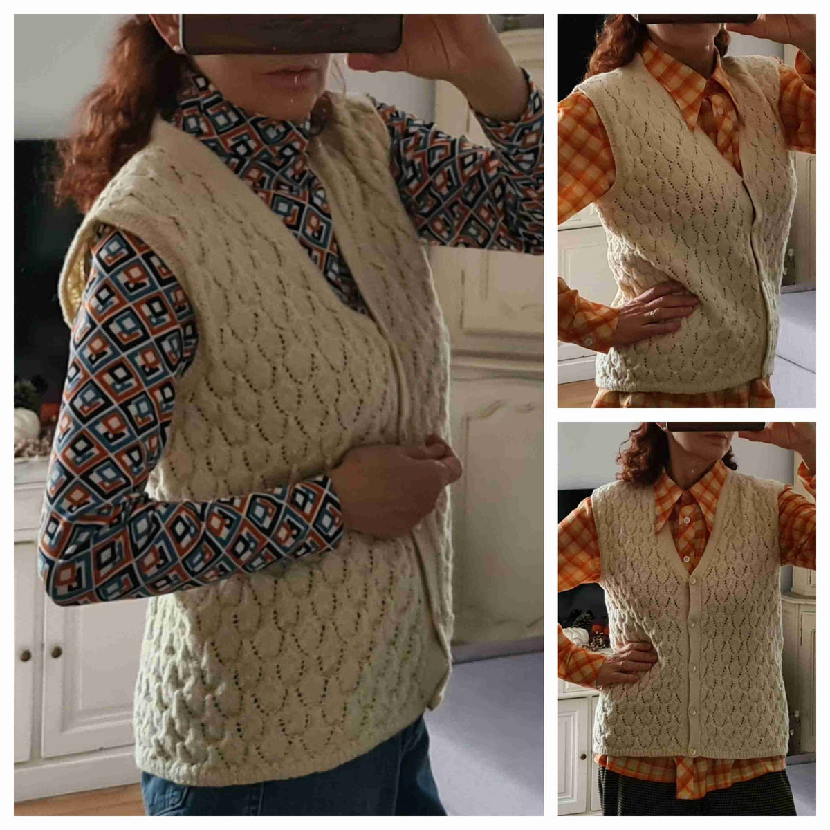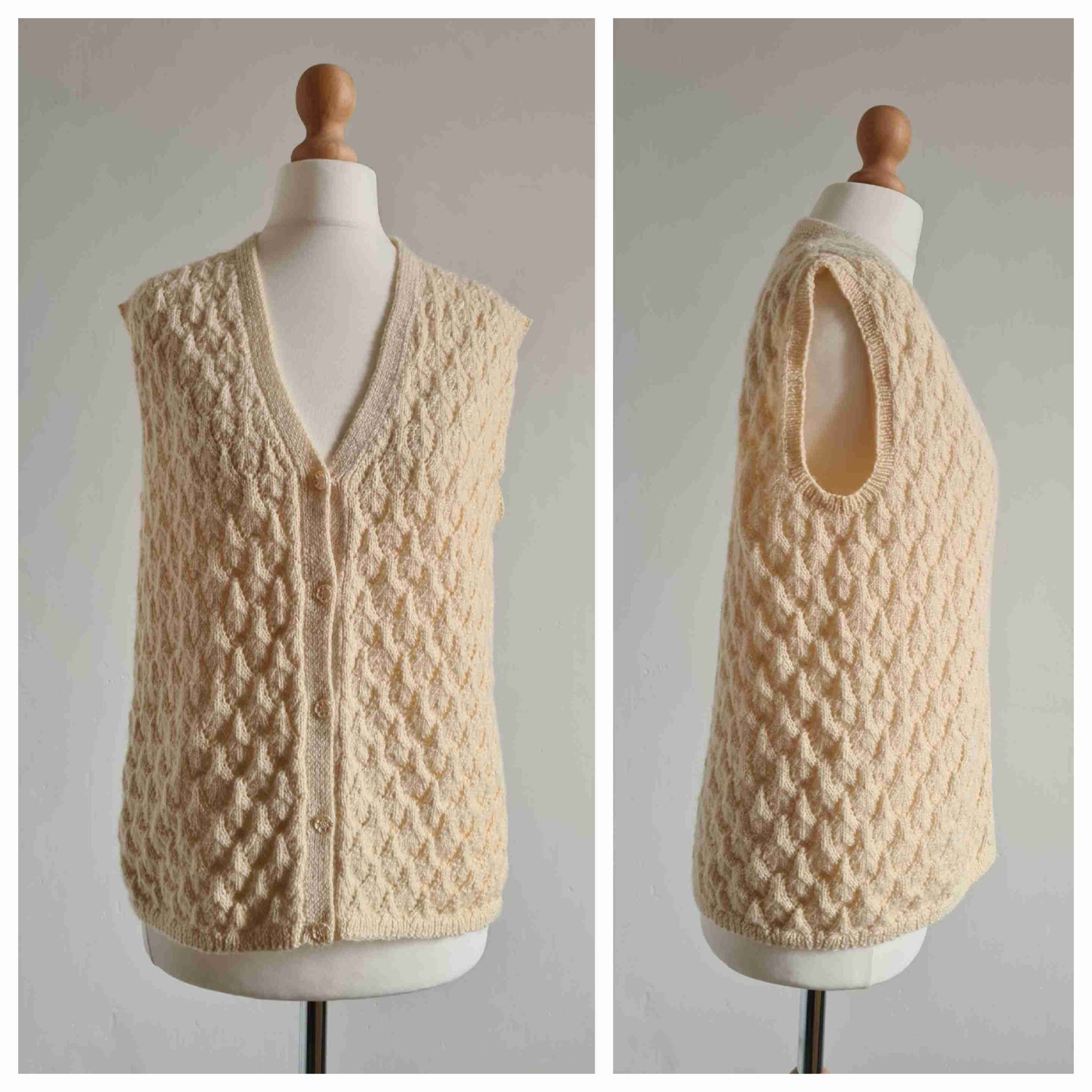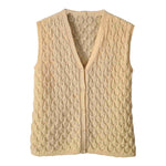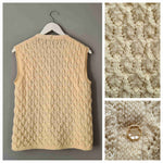 Prix unitaire parGilet en laine sans manches en laine écrue, point relief à petit jours, encolure V, boutons fleurs nacrées. Porté sur les photos par une taille 36. Pièce unique tricotée main.
