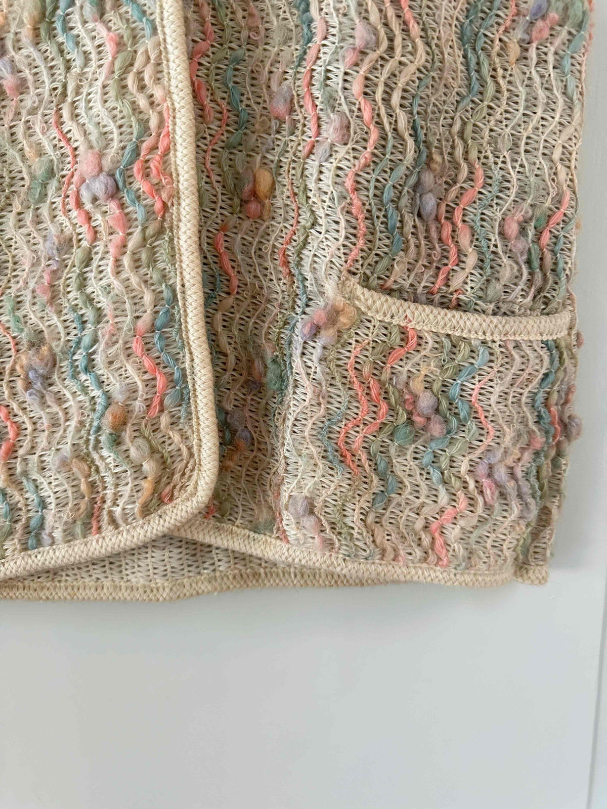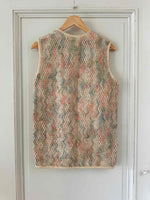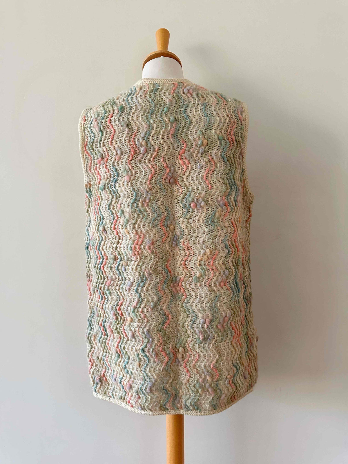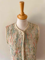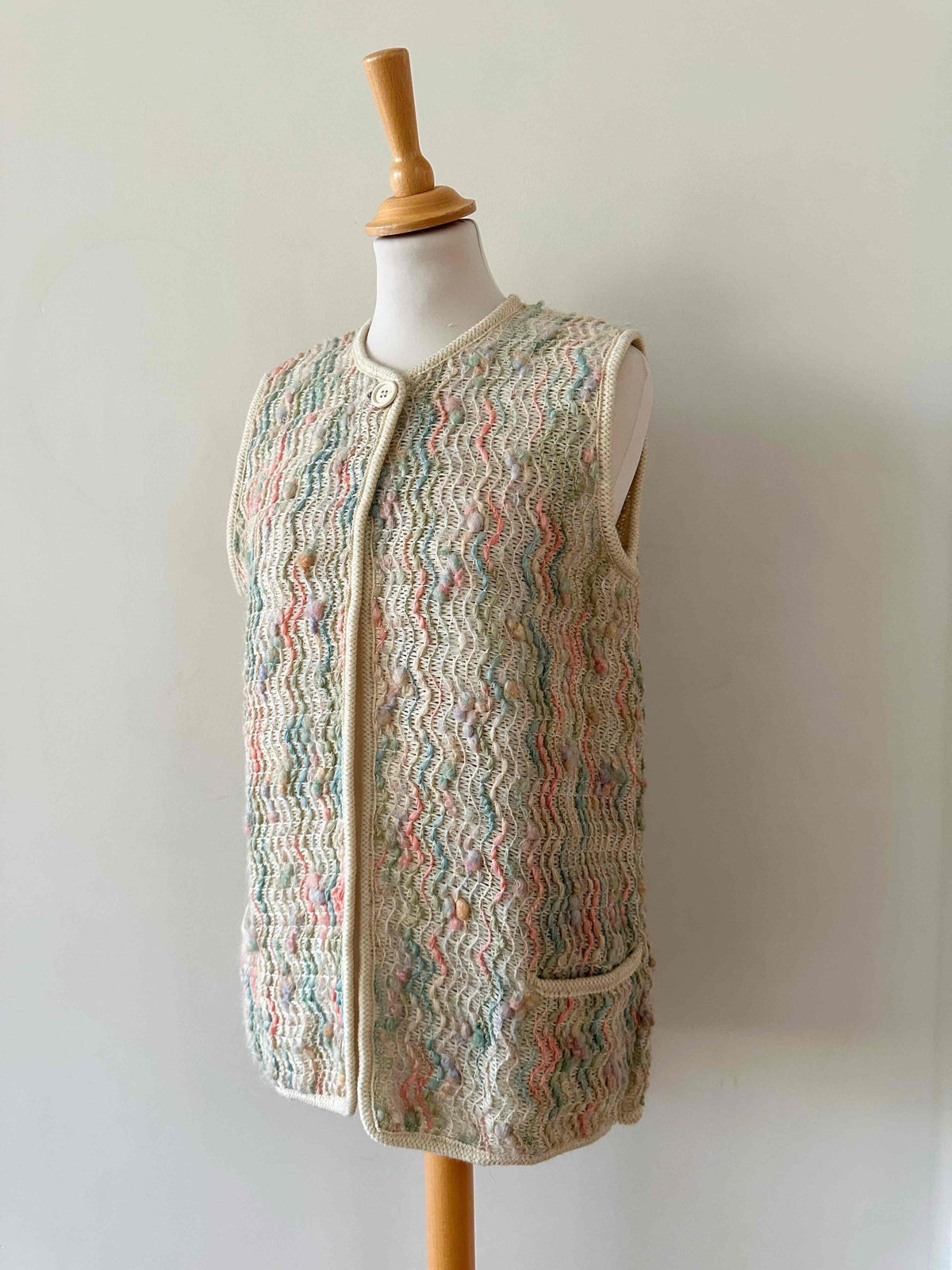 Prix unitaire parGilet en laine de mouton sans manches, laine de mouton brodée et tressée multicolore pastel rose, vert sauge, et ecrue beige, fabriqué en France à Bagnere de Bigorre, dead stock des années 70s avec étiquette d’origine, convient aux tailles 36 et 38 porté ici sur un mannequin T36 et ouvert sur une personne T40.