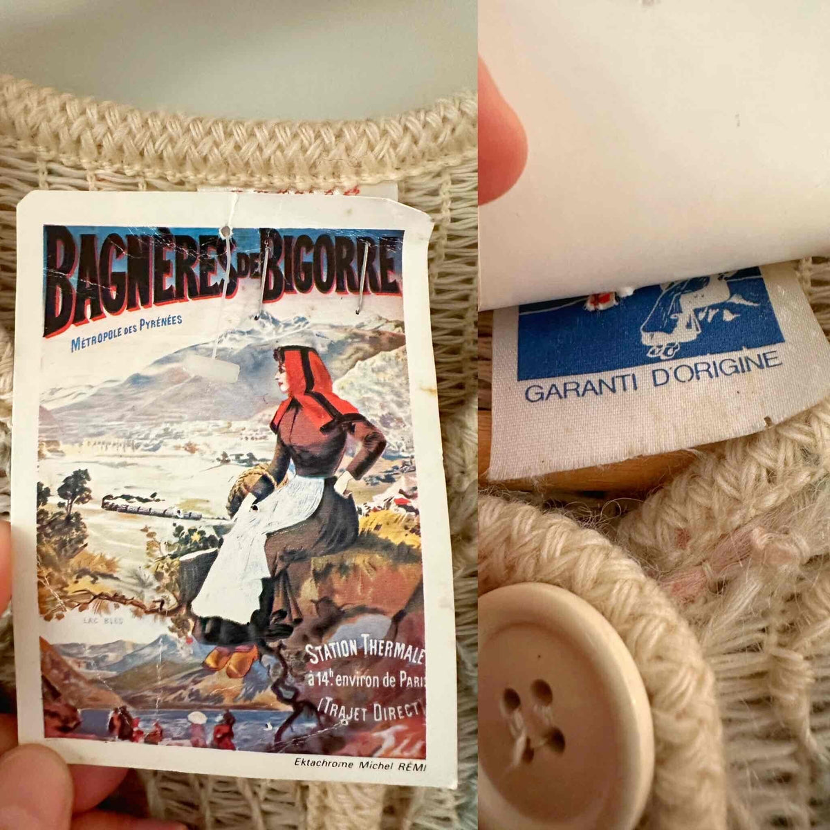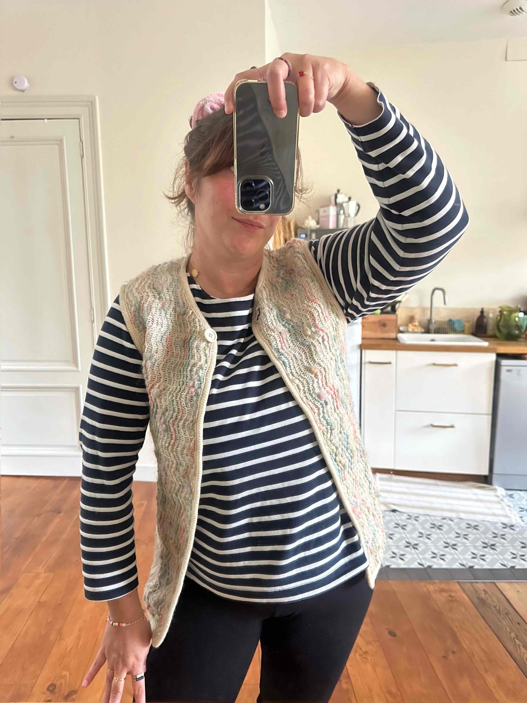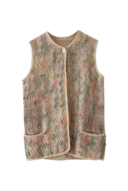Prix unitaire parGilet en laine de mouton sans manches, laine de mouton brodée et tressée multicolore pastel rose, vert sauge, et ecrue beige, fabriqué en France à Bagnere de Bigorre, dead stock des années 70s avec étiquette d’origine, convient aux tailles 36 et 38 porté ici sur un mannequin T36 et ouvert sur une personne T40.