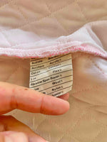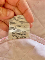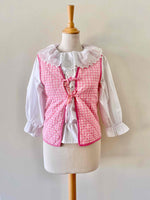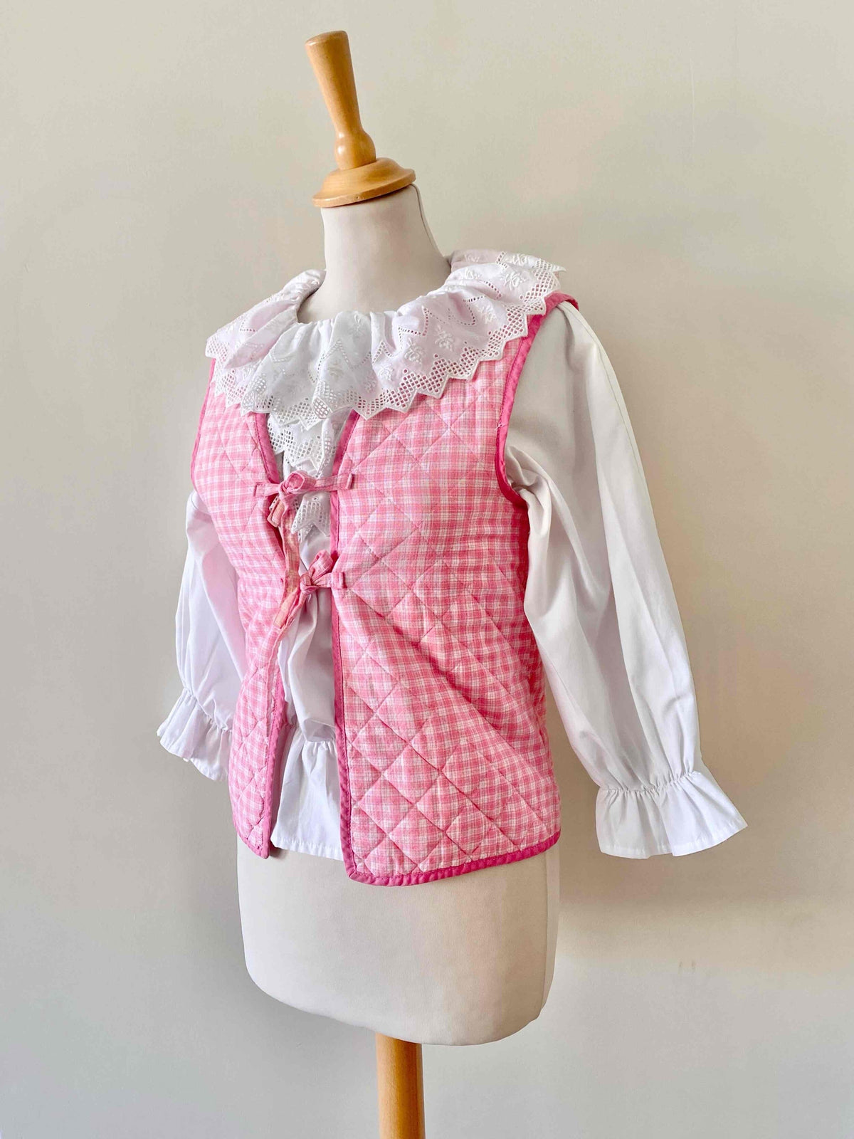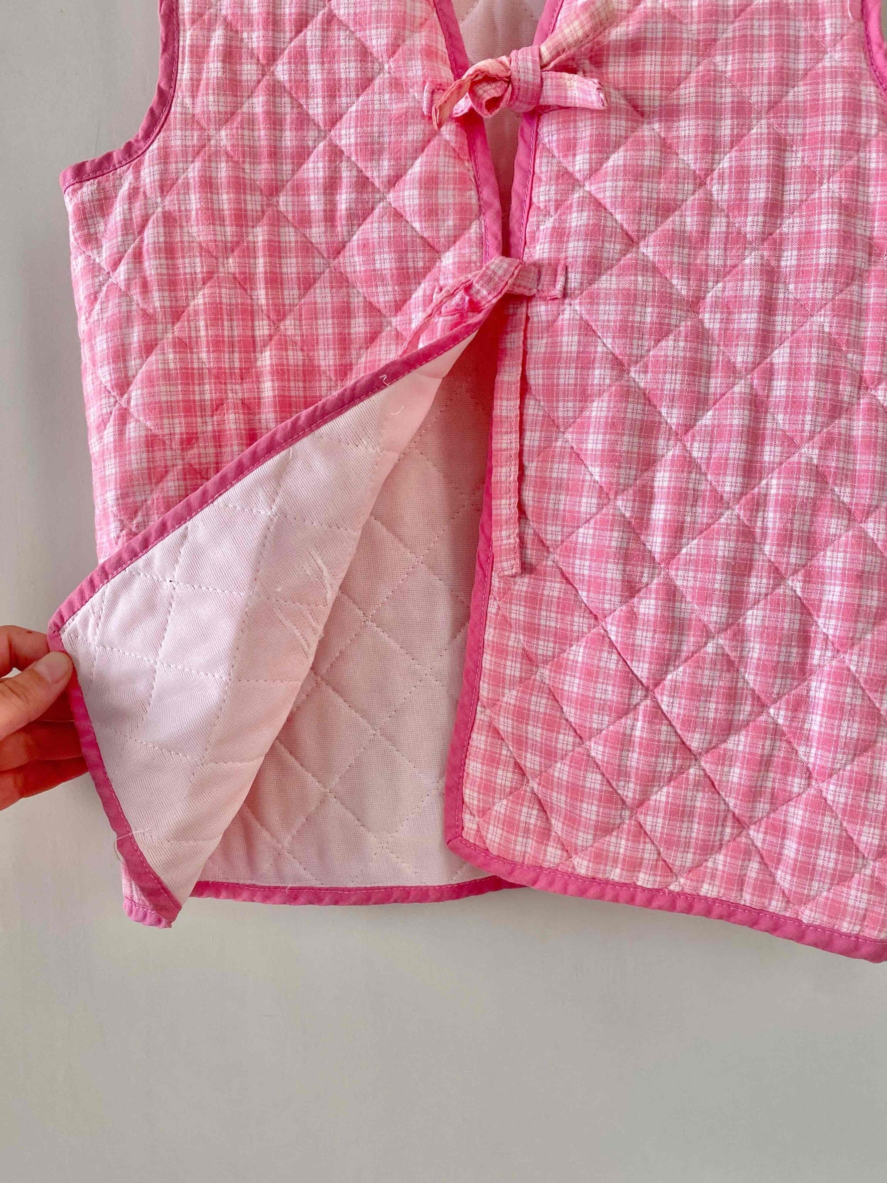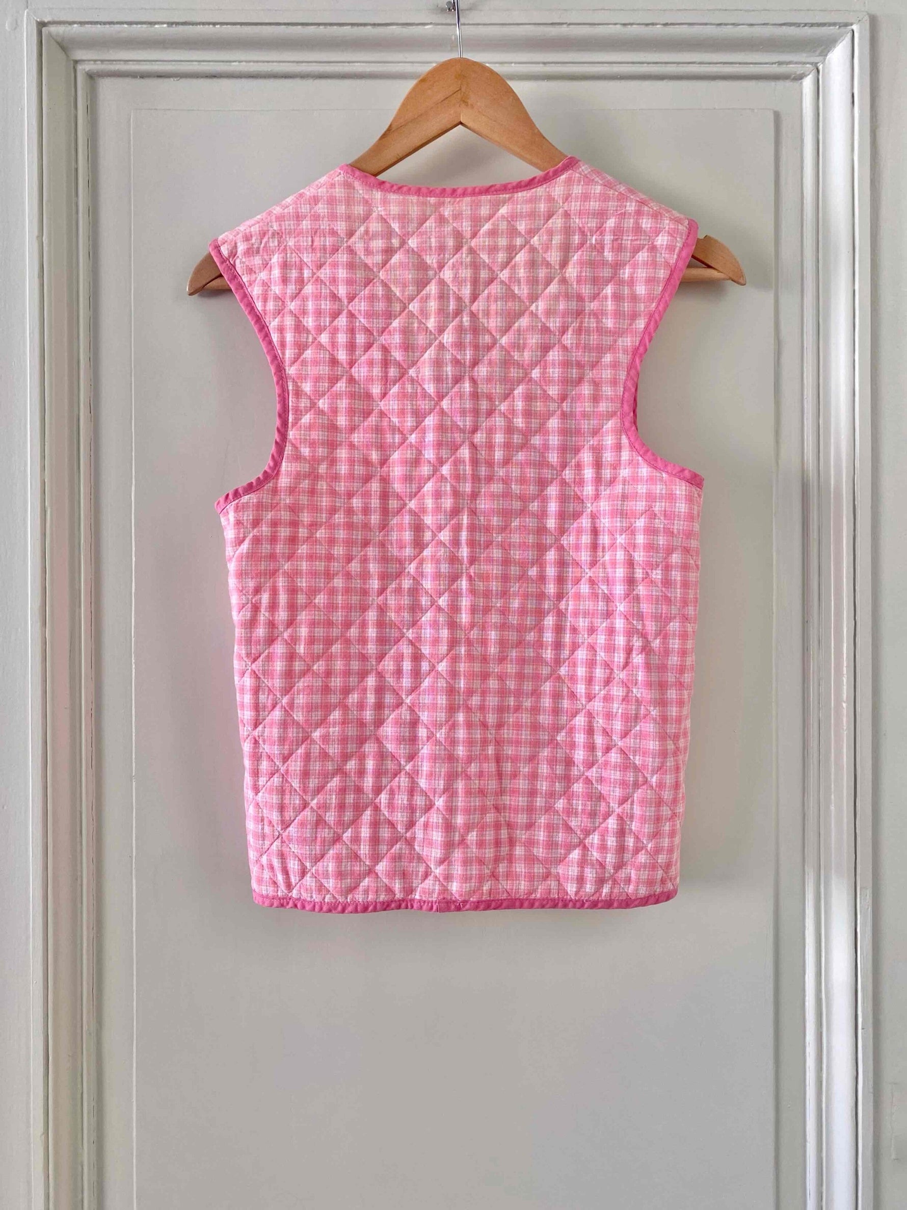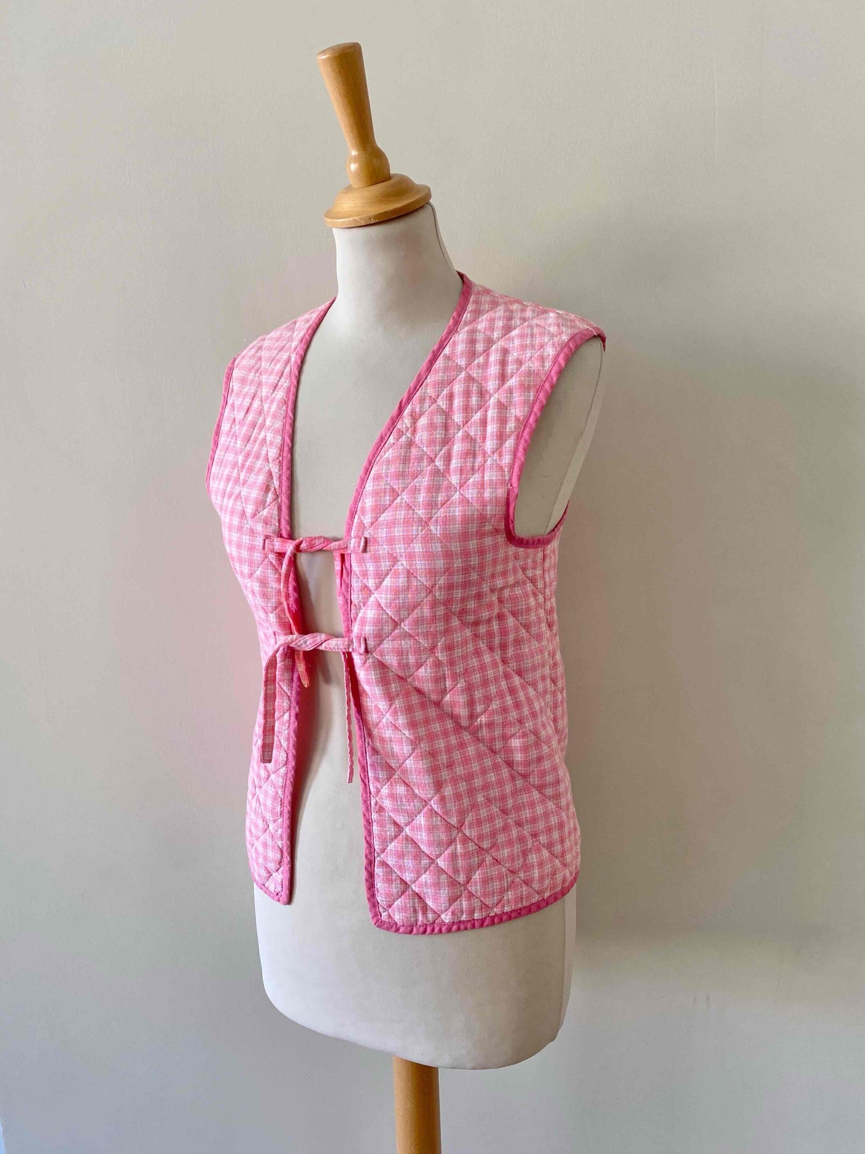 Prix unitaire parGilet matelassé vichy, sans manches, en coton ouatiné blanc à carreaux vichy rose bonbon, devant à nouer, fabriqué en France, années 70’s, taille 34 et 36 porté ici sur un mannequin T36.