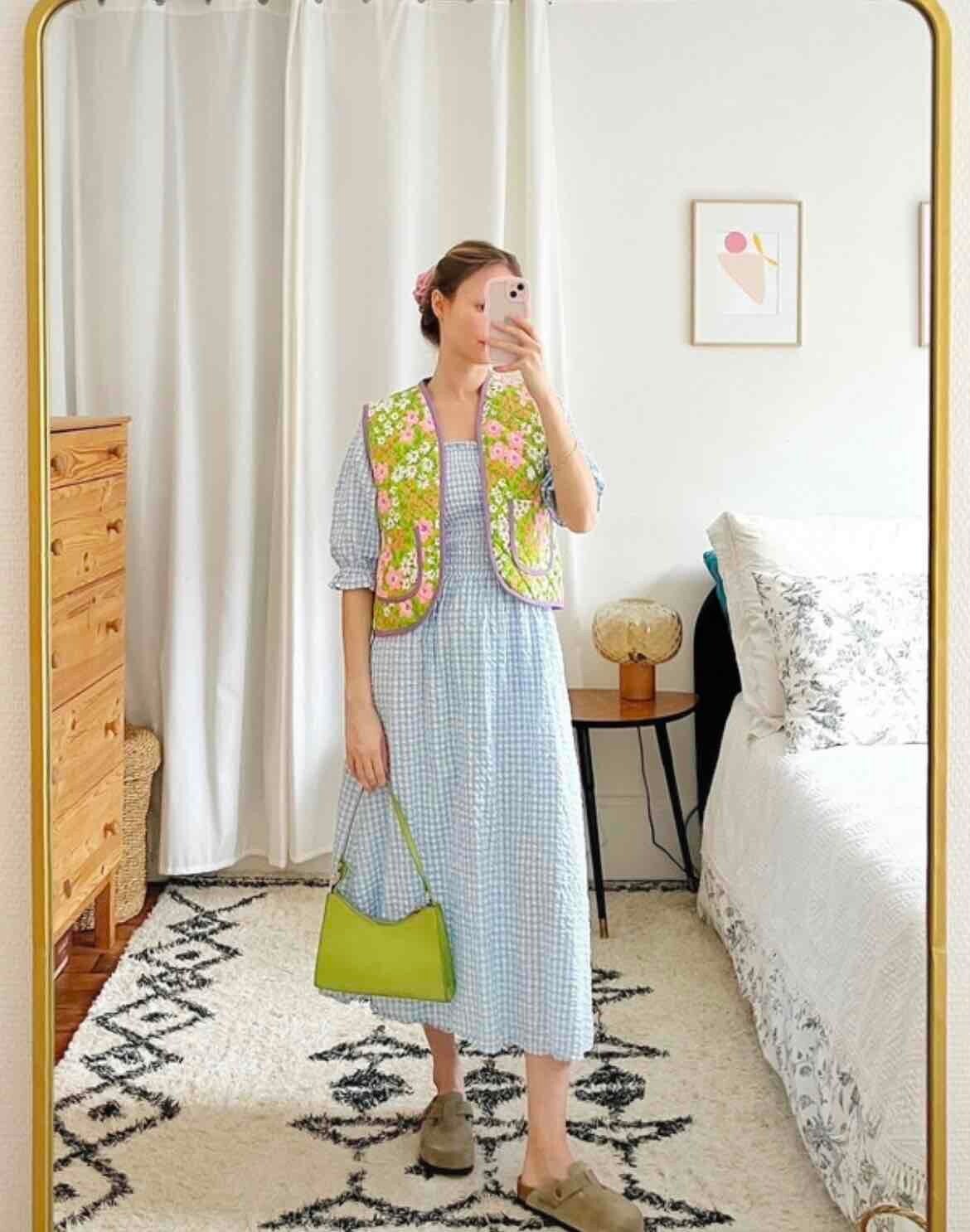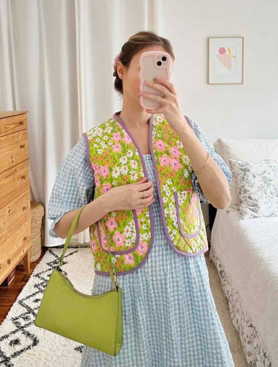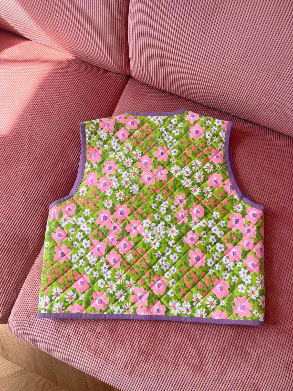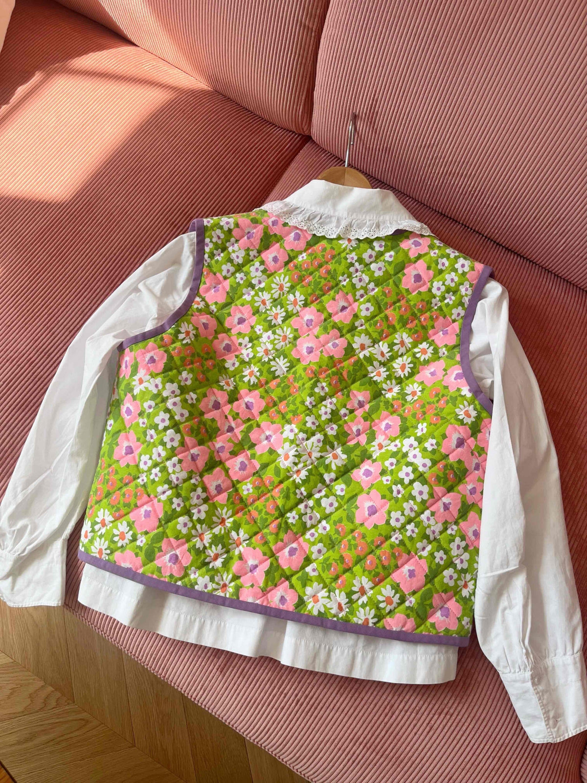 Prix unitaire parGilet sans manches matelassés, tissu vintage imprimé de fleurs, joli liseré violet, deux petites poches sur le devant, porté ici sur une T36 pour 1m64.
