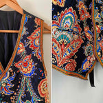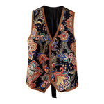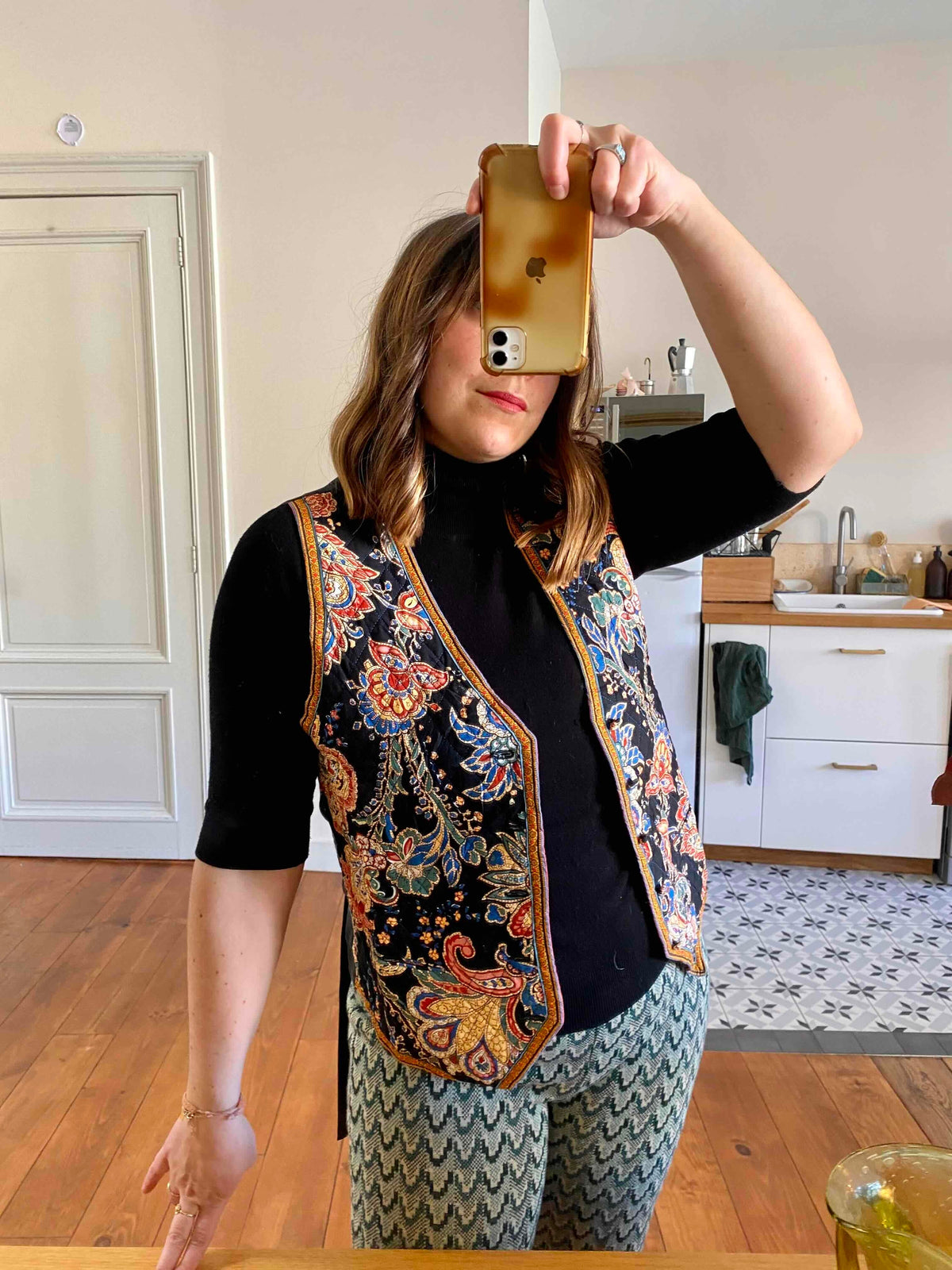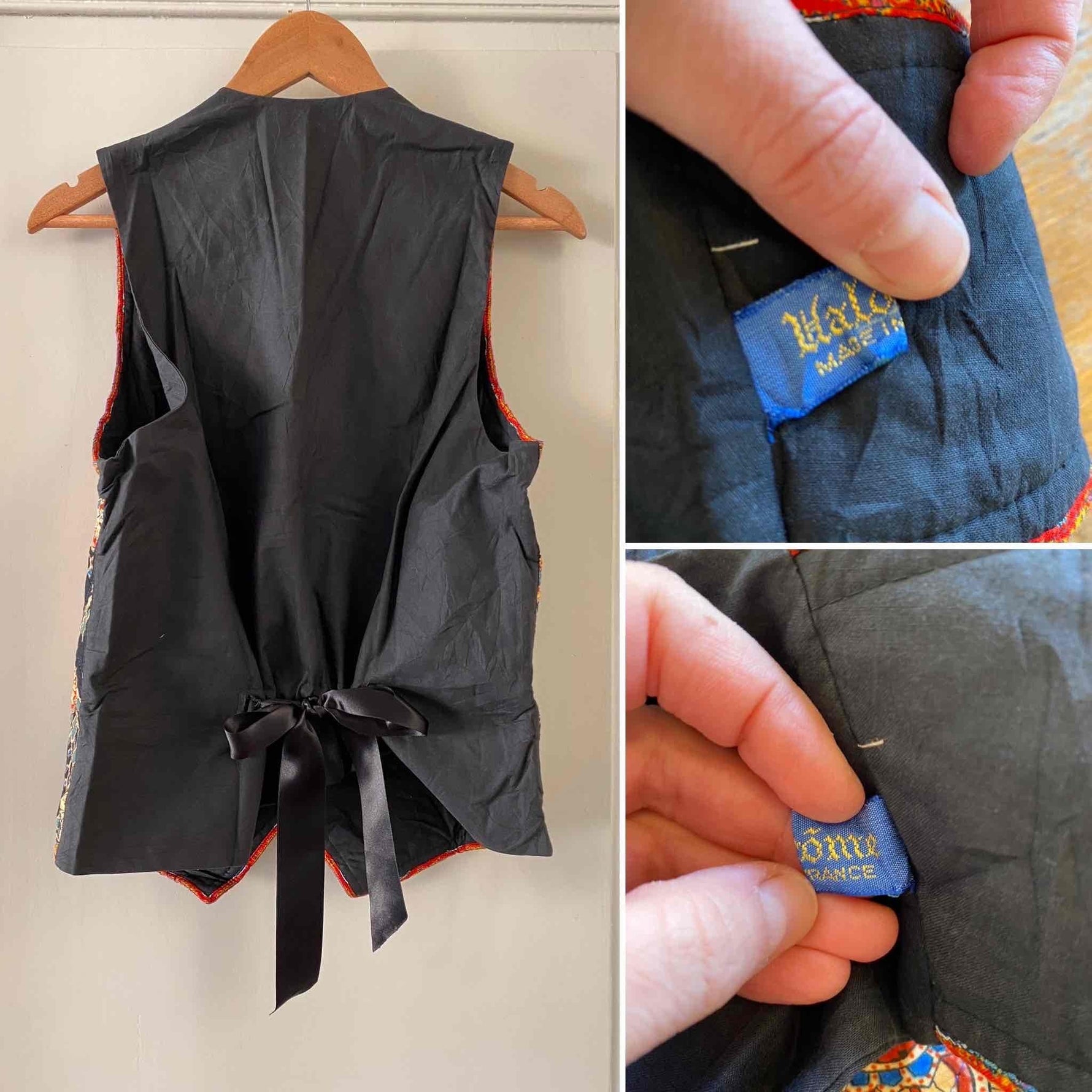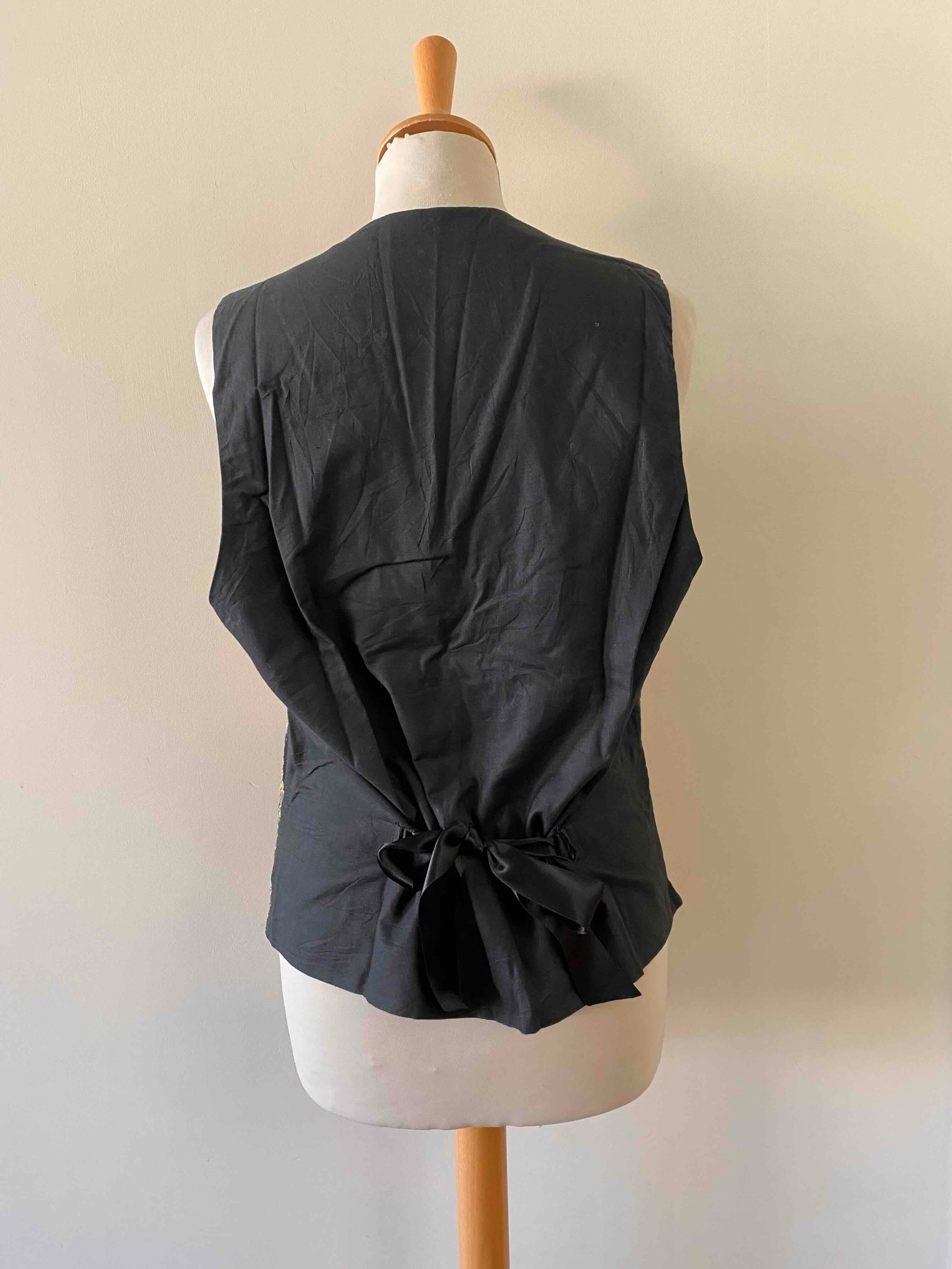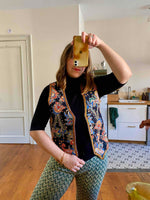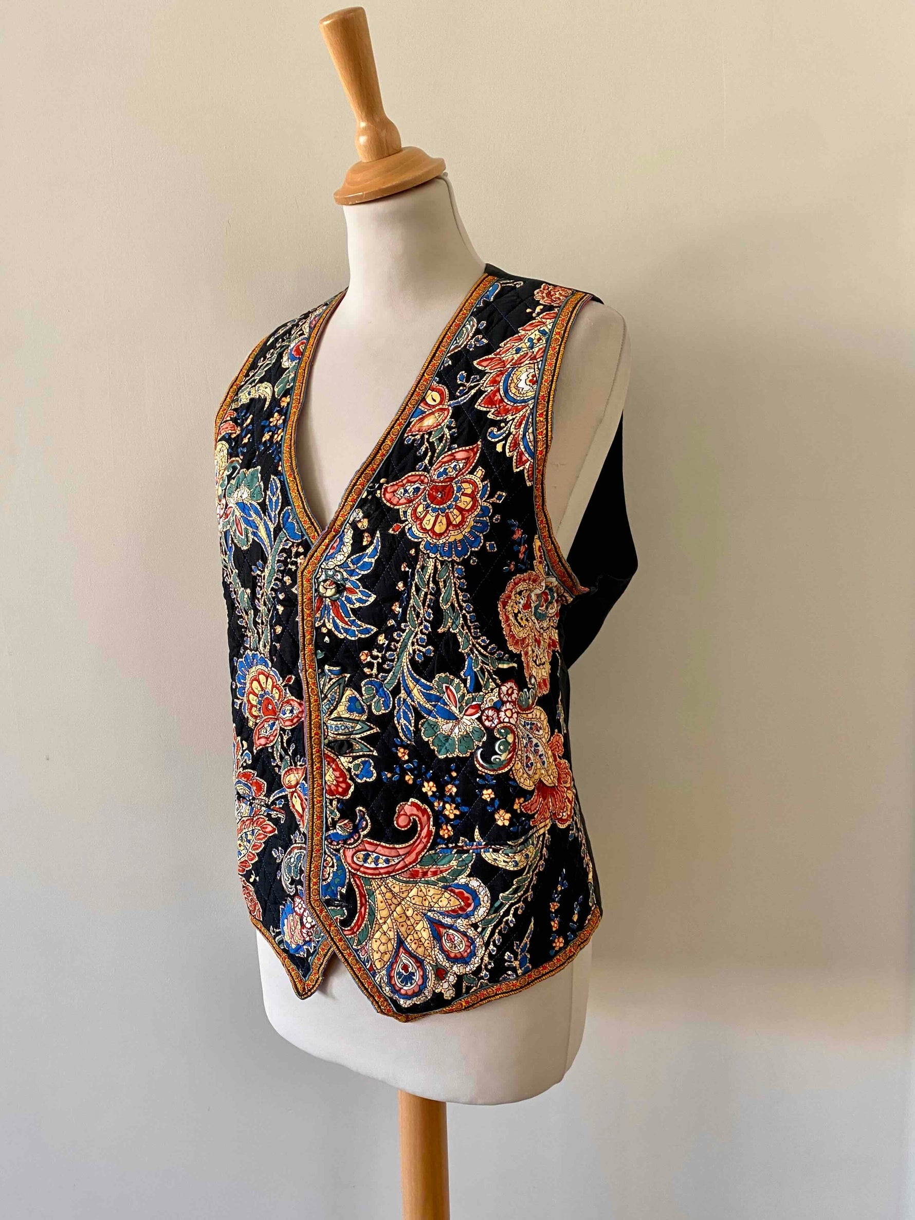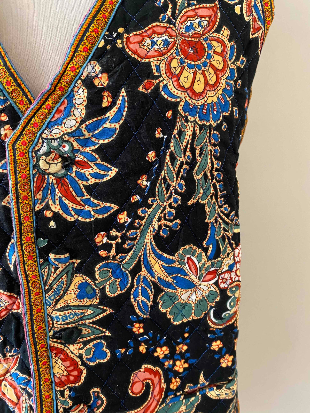 Prix unitaire parGilet matelassé paisley en coton matelassé croisillons noir imprimé fleurs et paisley multicolores chatoyantes, boutonné, dos à nouer par un ruban satin, fabriqué en France, taille 36 et 38 porté ici sur un mannequin T36 et ouvert sur une personne T40.