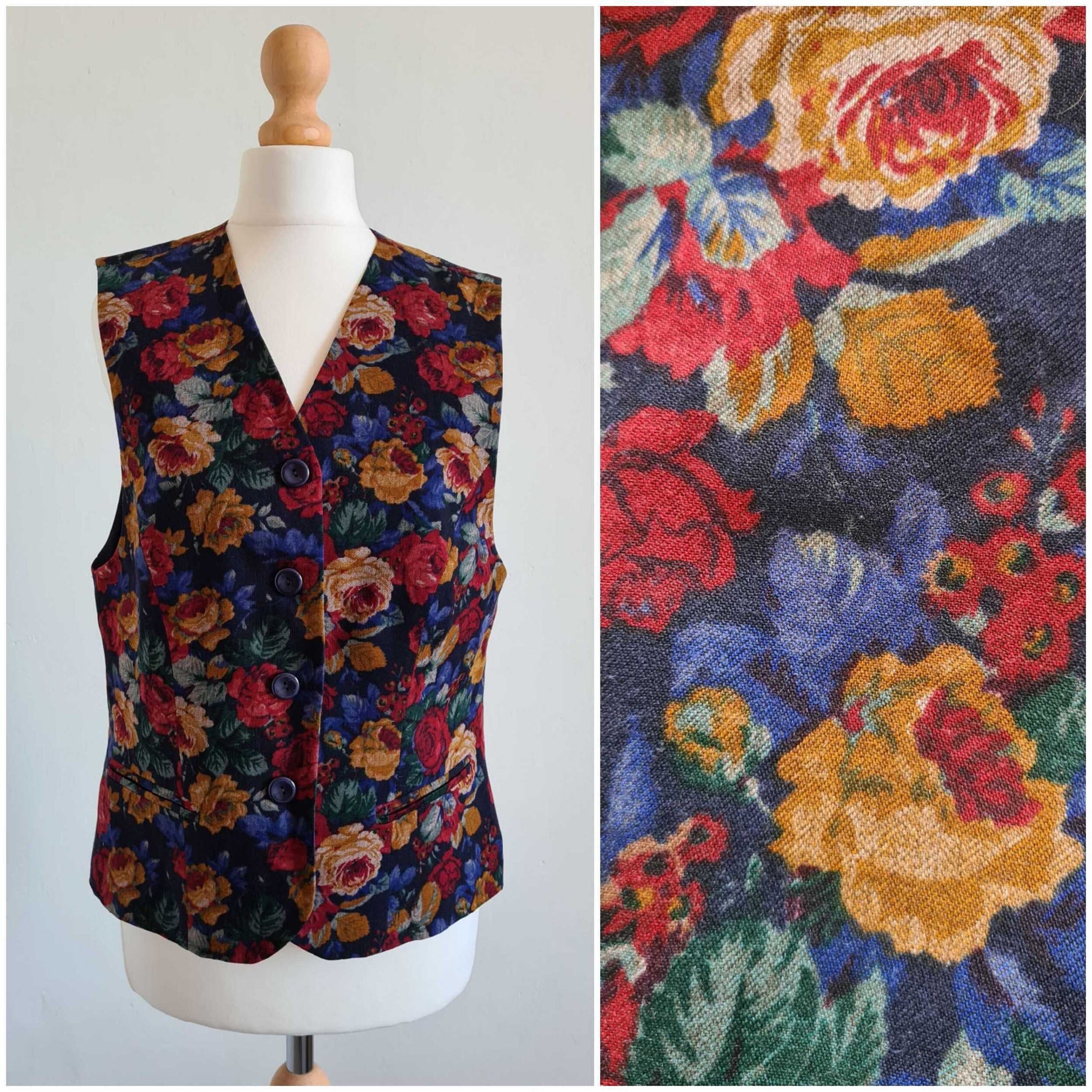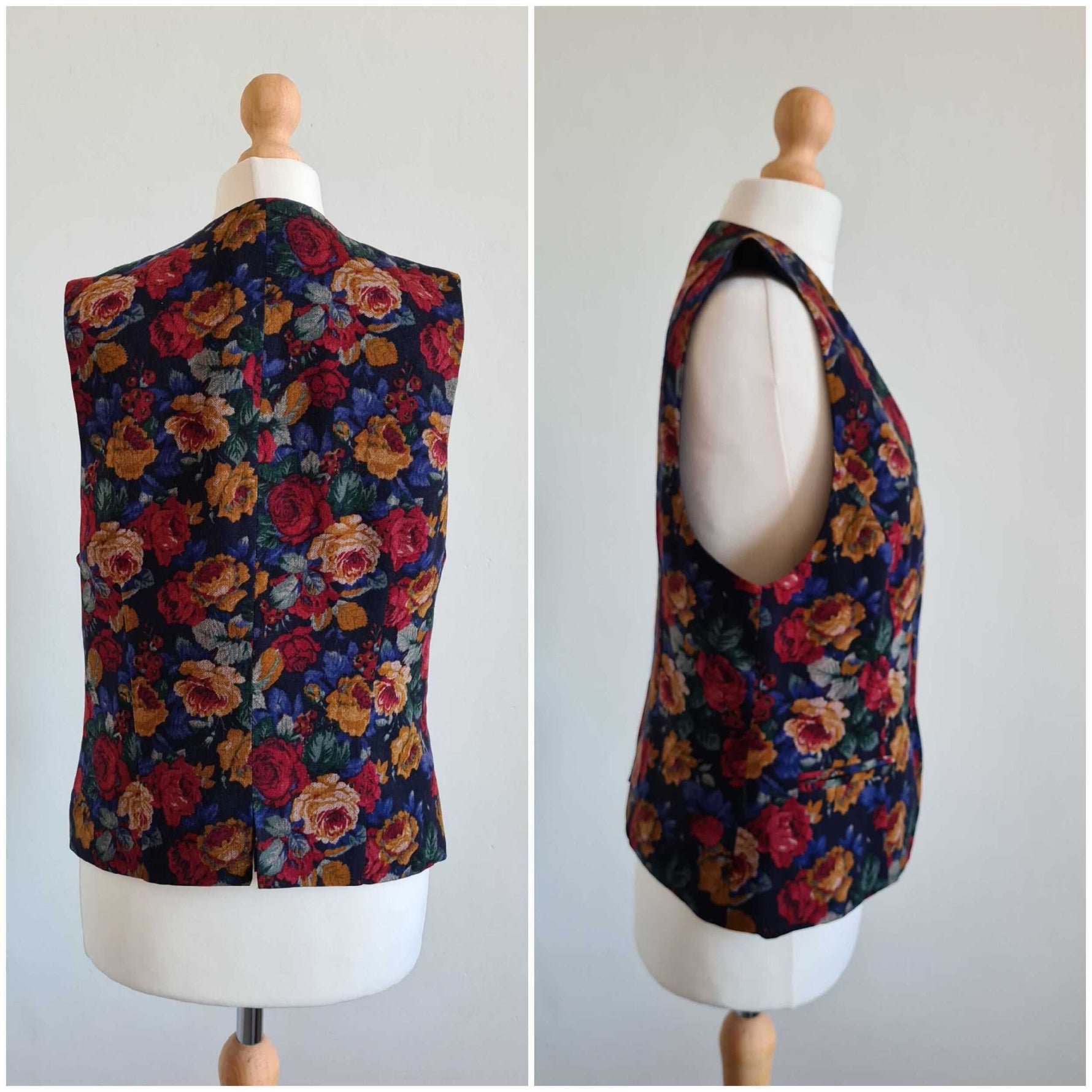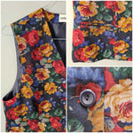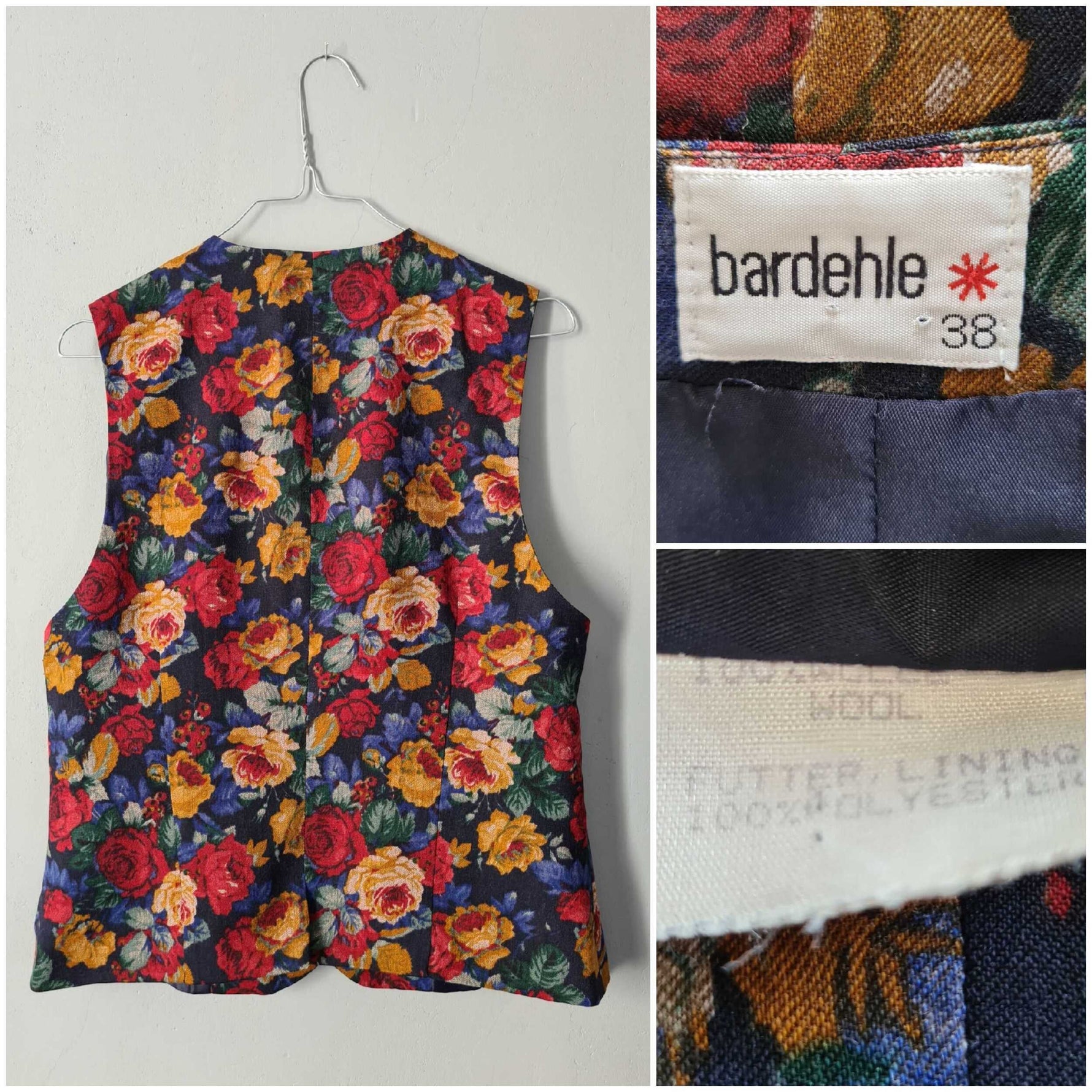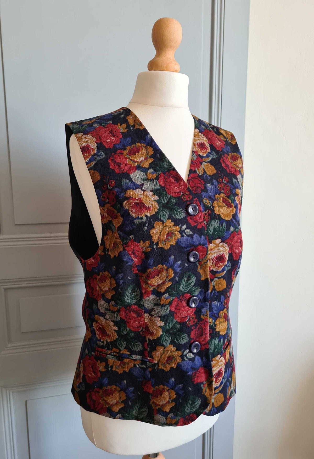 Prix unitaire parGilet sans manches en laine imprimé fleurs multicolores sur fond marine, doublé, deux mini poches cousues, petite fente au dos. Marque allemande Bardehle.