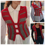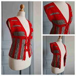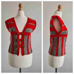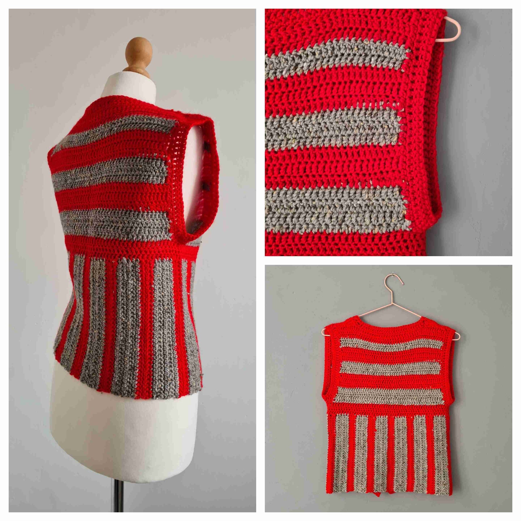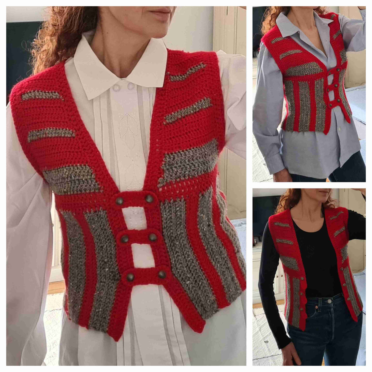 Prix unitaire parGilet sans manches en laine mélangée, à rayures gris chiné et rouge vif, encolure V, fermeture par pattes boutonnées (deux tailles, légèrement différentes fournies). Porté sur les photos par une taille 36. Pièce unique crochetée à la main.