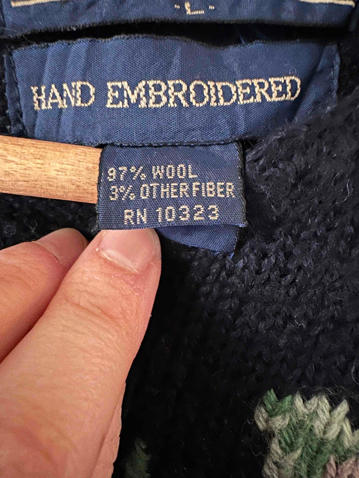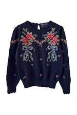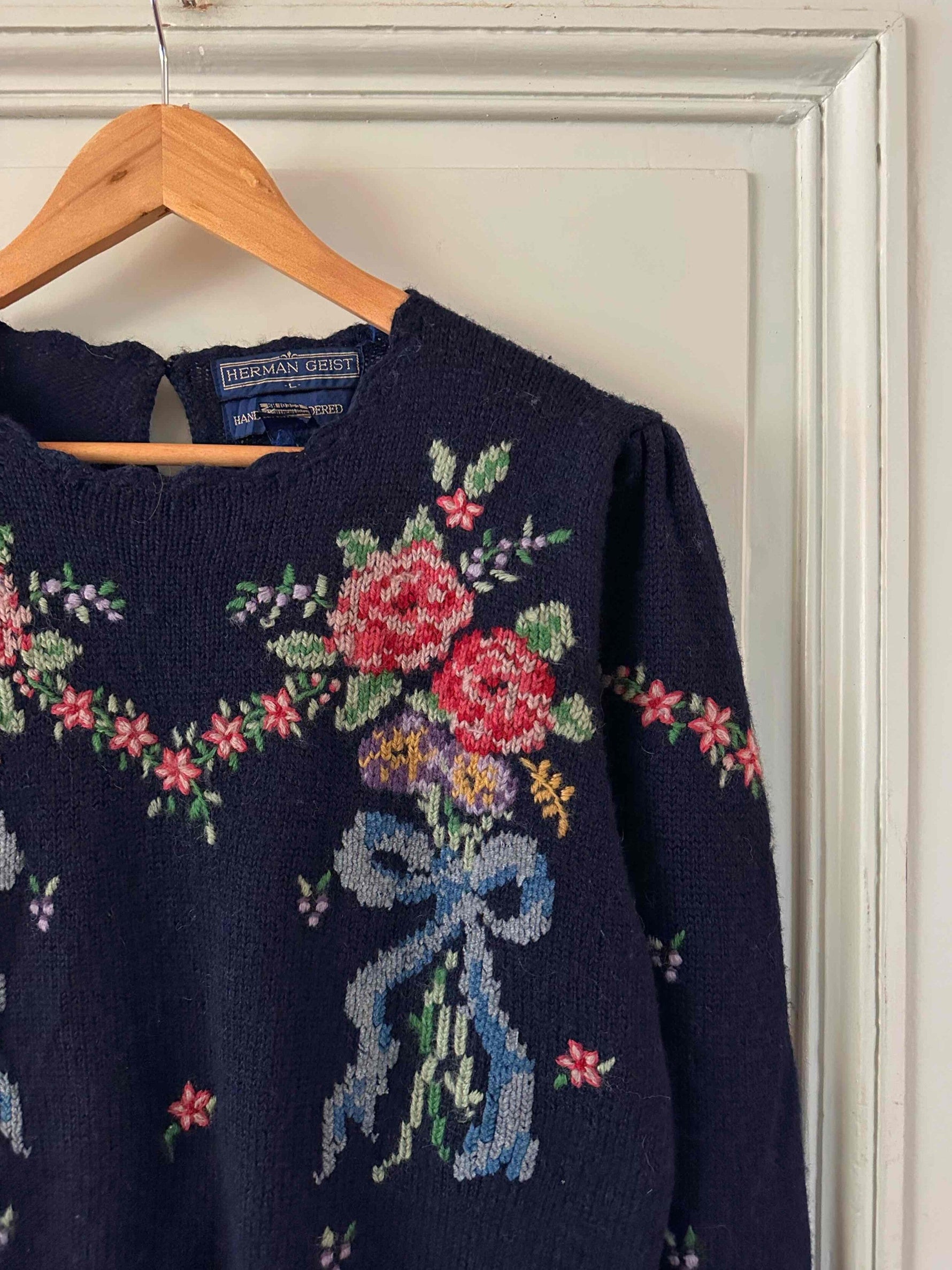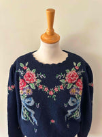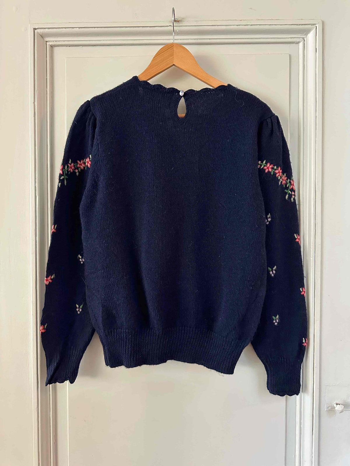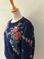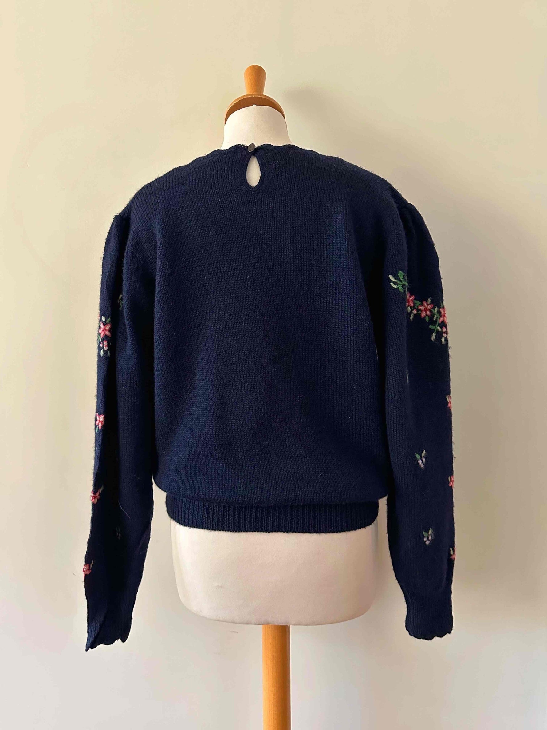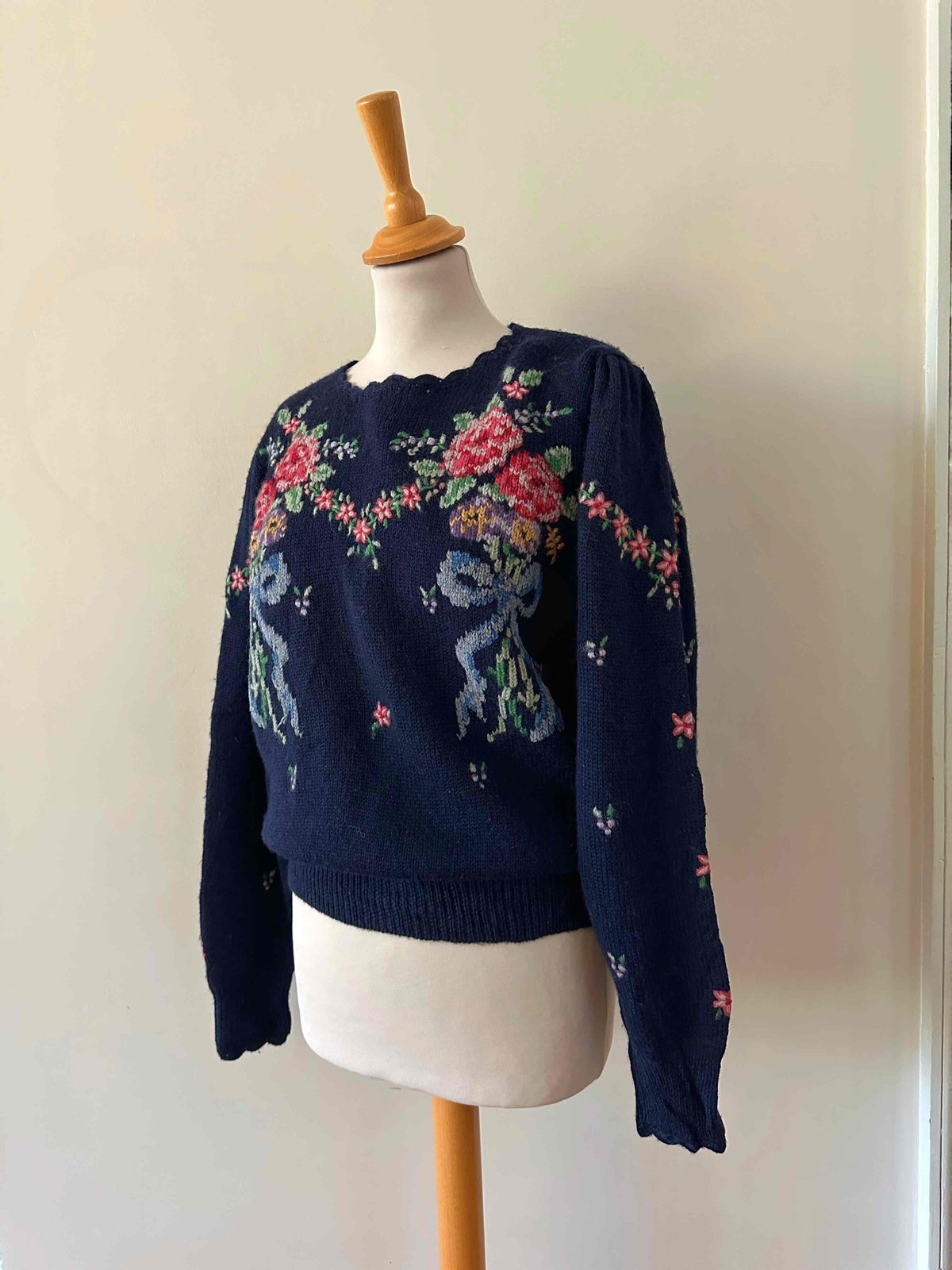 Pull à fleurs, en pure laine bleue foncée brodé à la main de fleurs et bouquets de fleurs à noeuds, manches ballons brodées, fabriqué en Angleterre, taille 36 porté ici sur un mannequin T36.