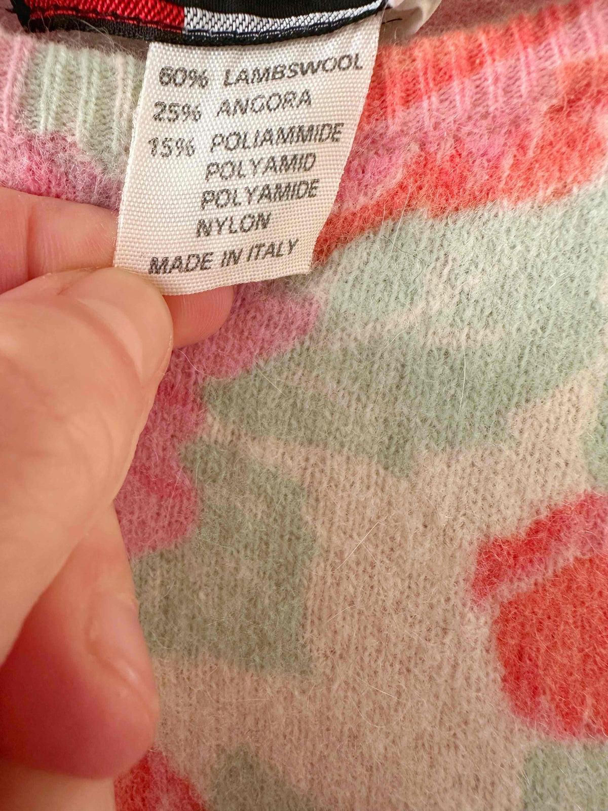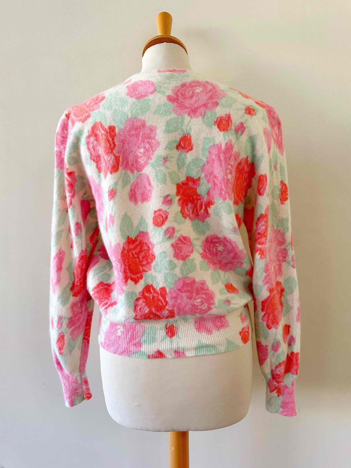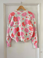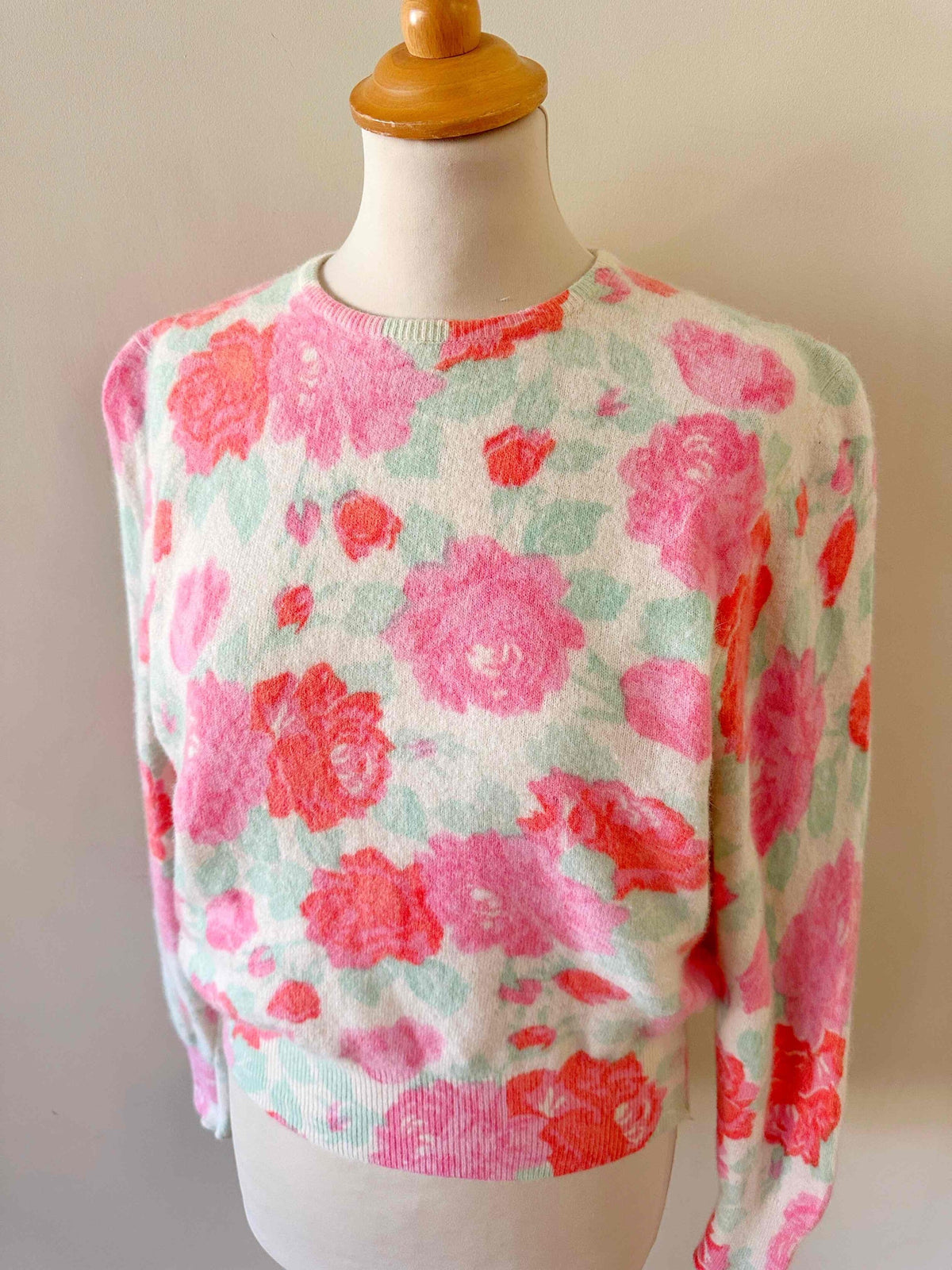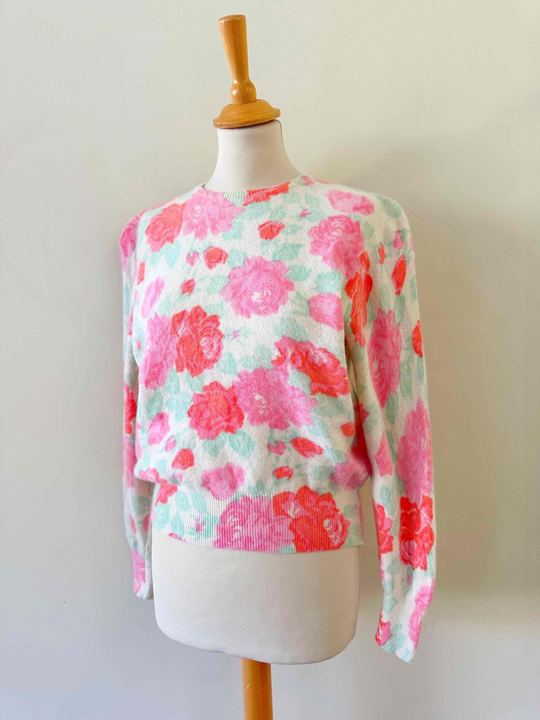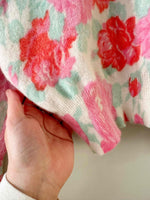 Prix unitaire parPull en laine angora, blanc motif fleuri roses, fuschia et vert d’eau, fabriqué en Italie, taille 1, convient aux tailles 34 et 36 porté ici sur un mannequin T36.