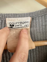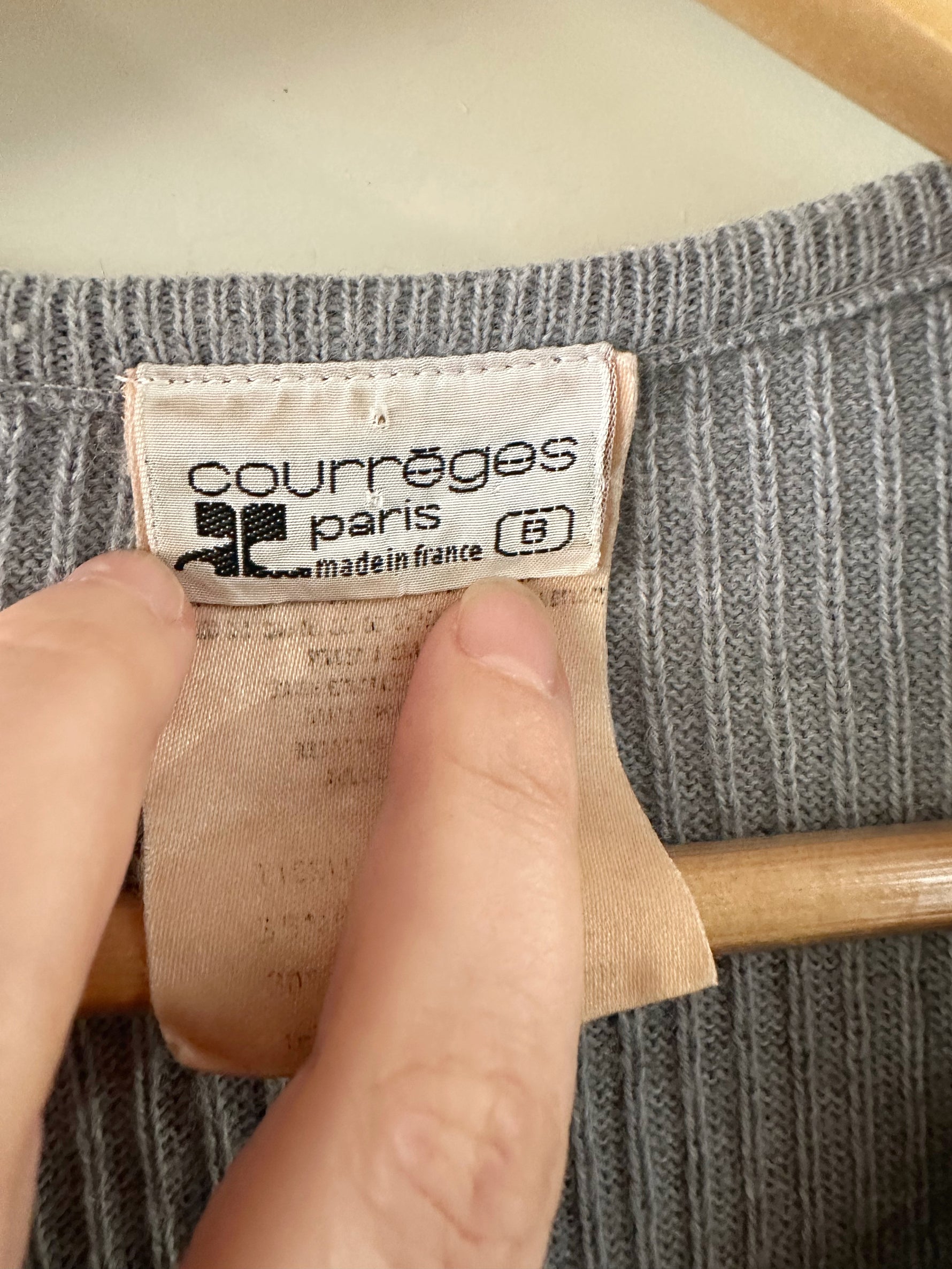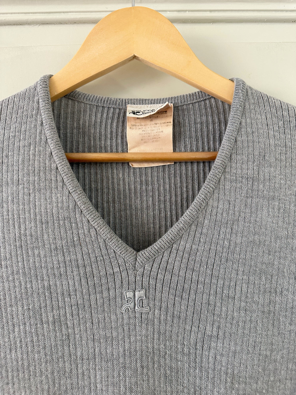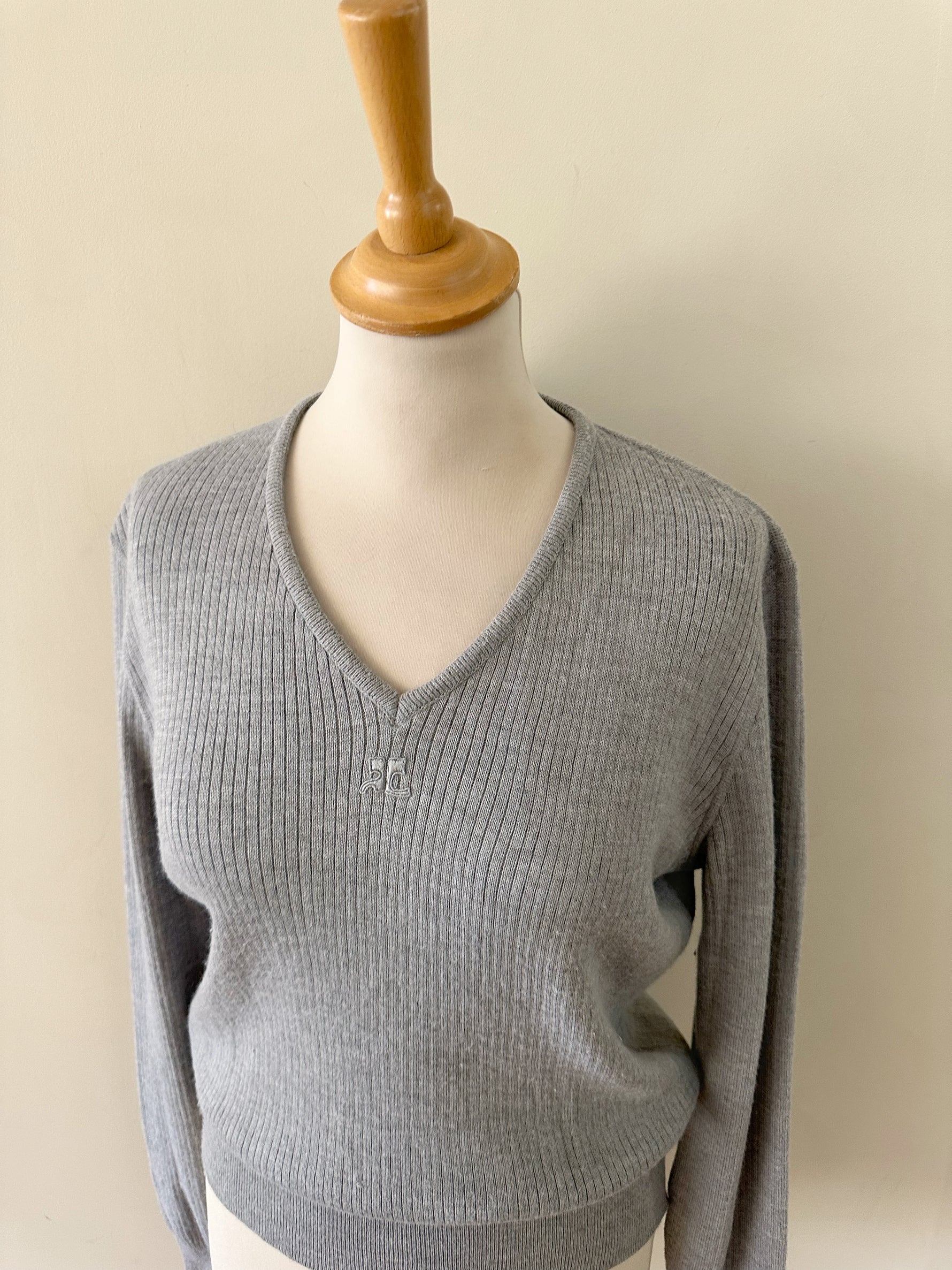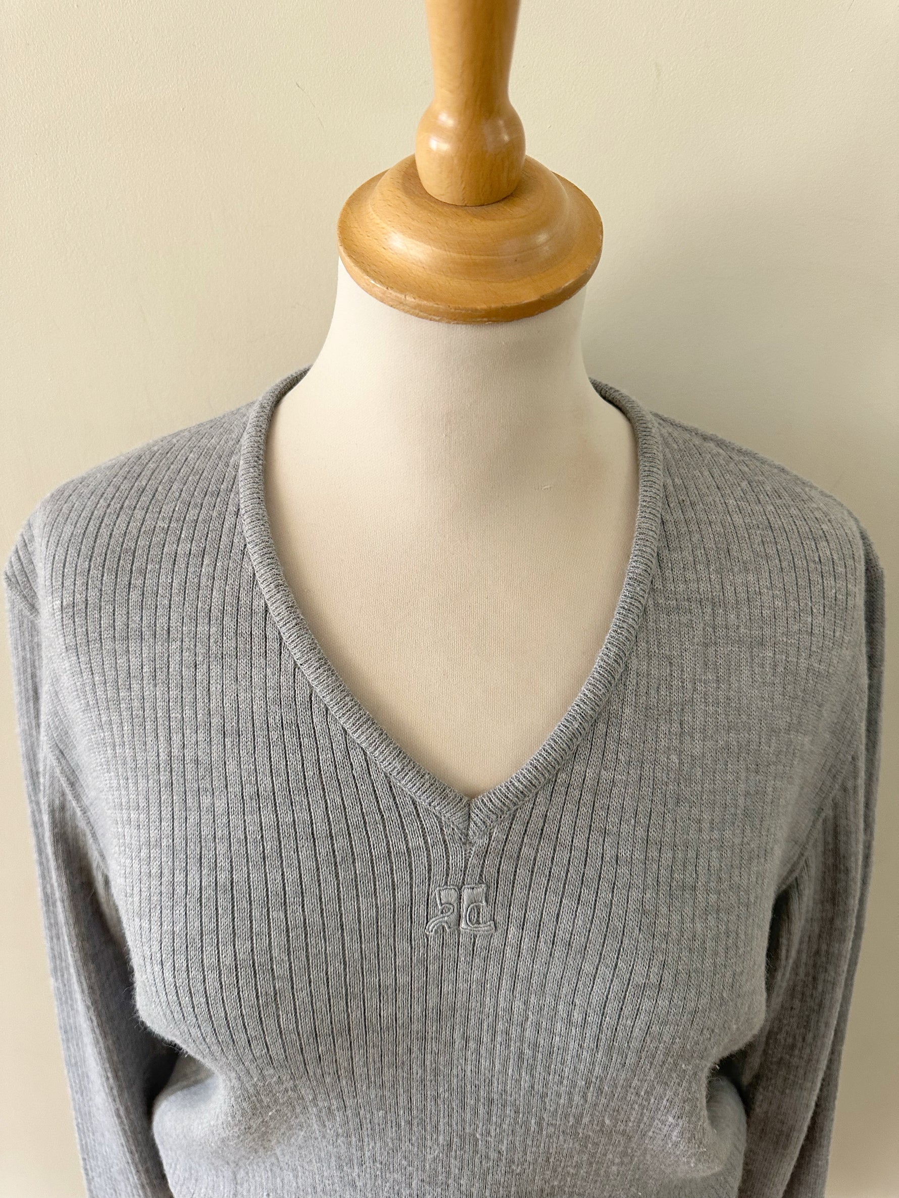 Prix unitaire parPull Courrèges, maille côtelée en laine mélangée gris chiné, logo brodé, col V, manches longues, fabriqué en France, taille 36 porté ici sur un mannequin T36.Aisselles 44cm Longueur 55cm.