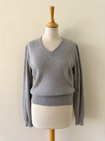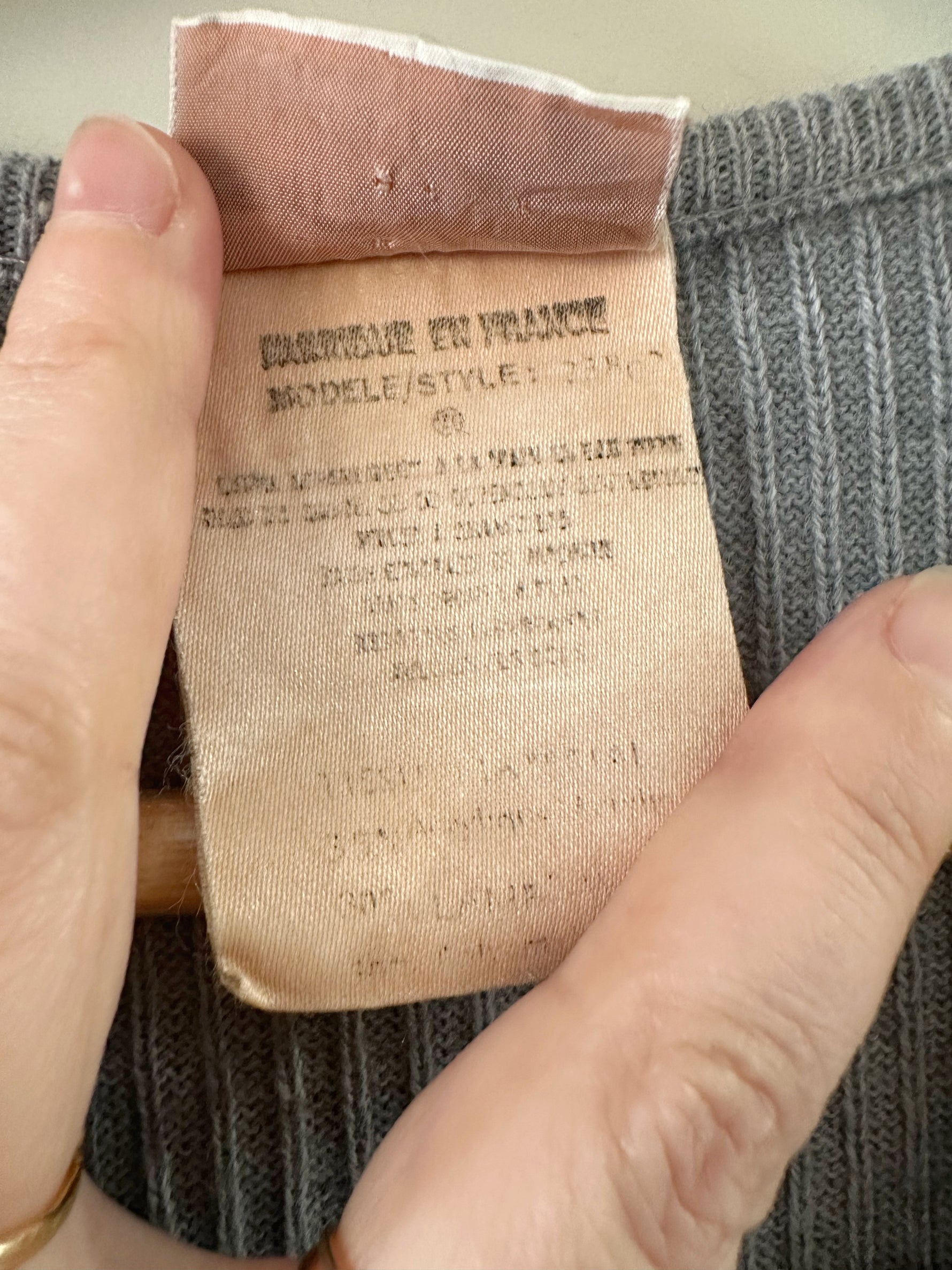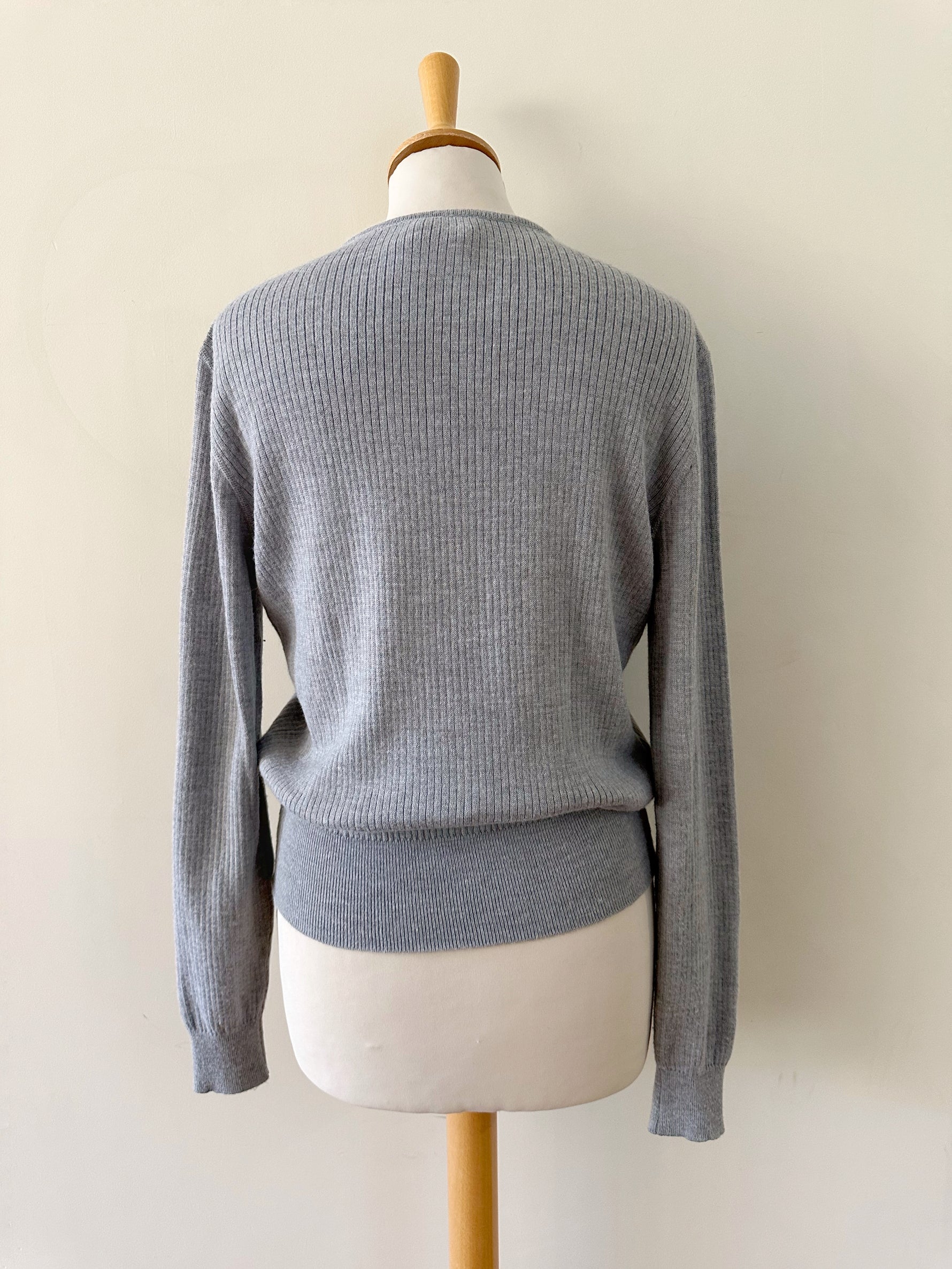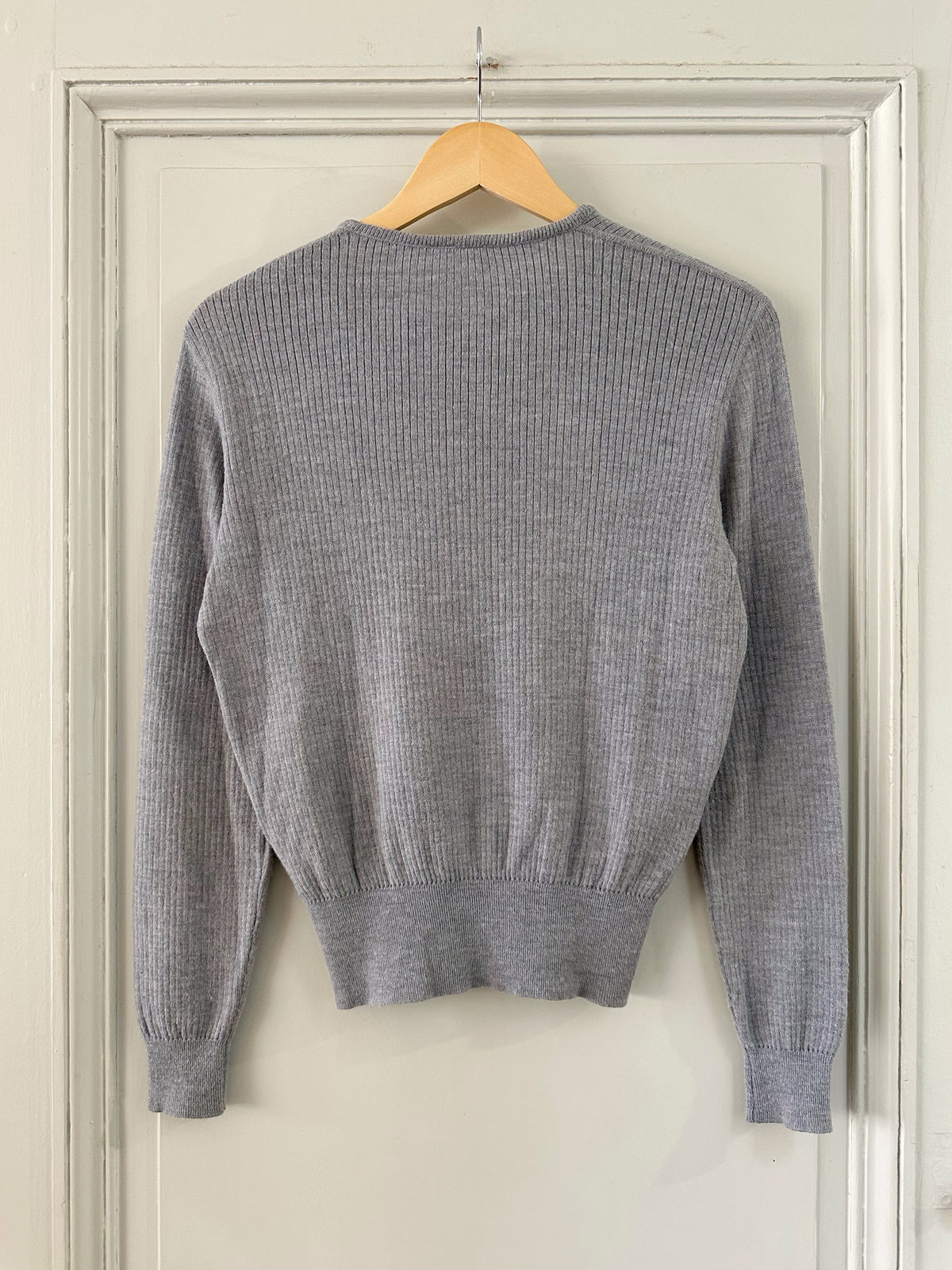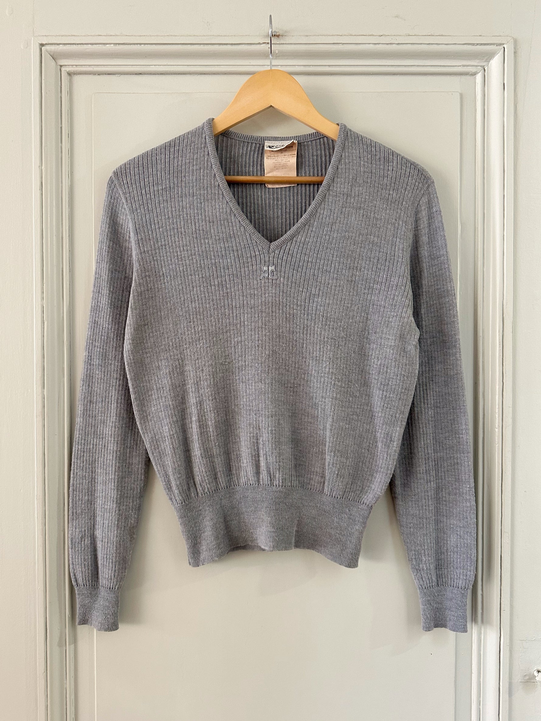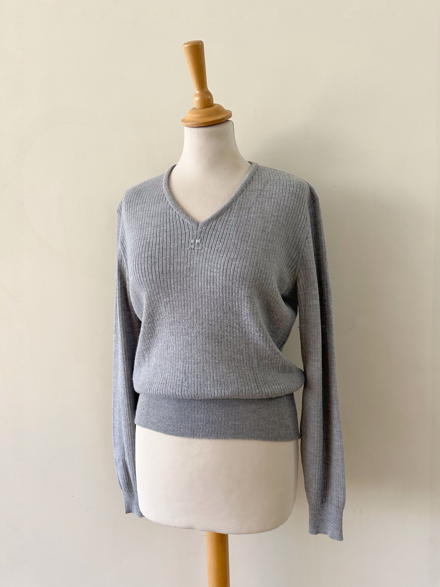 Prix unitaire parPull Courrèges, maille côtelée en laine mélangée gris chiné, logo brodé, col V, manches longues, fabriqué en France, taille 36 porté ici sur un mannequin T36.Aisselles 44cm Longueur 55cm.