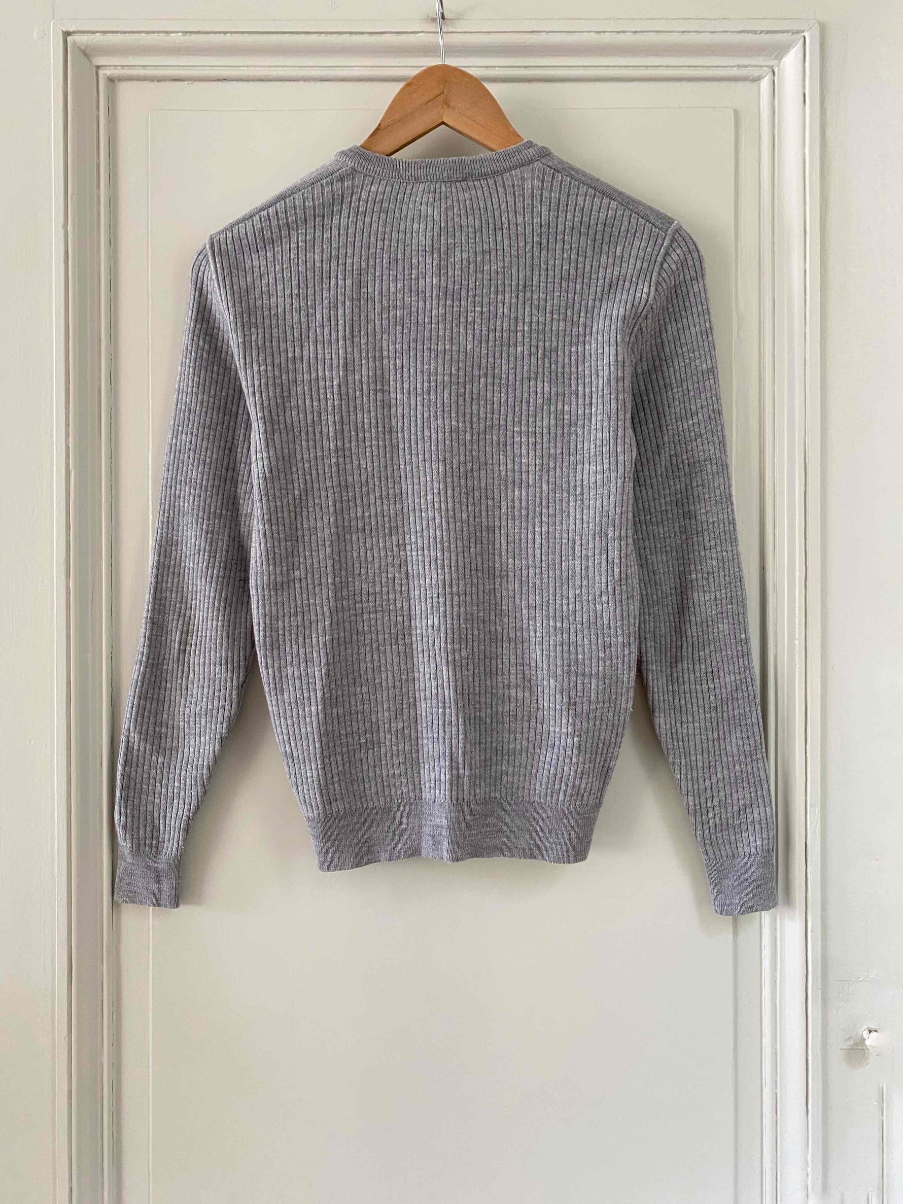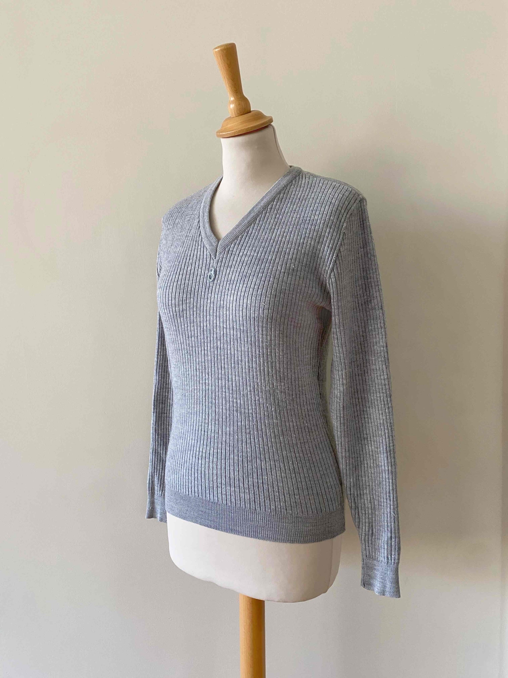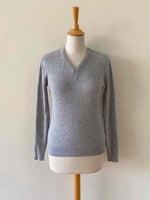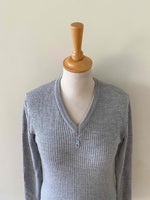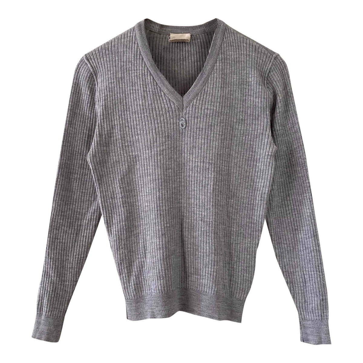 Prix unitaire parPull Courrèges, en maille côtelée laine mélangée gris chiné clair, col V, manches longues, fabriqué en France, taille 36 porté ici sur un mannequin T36.