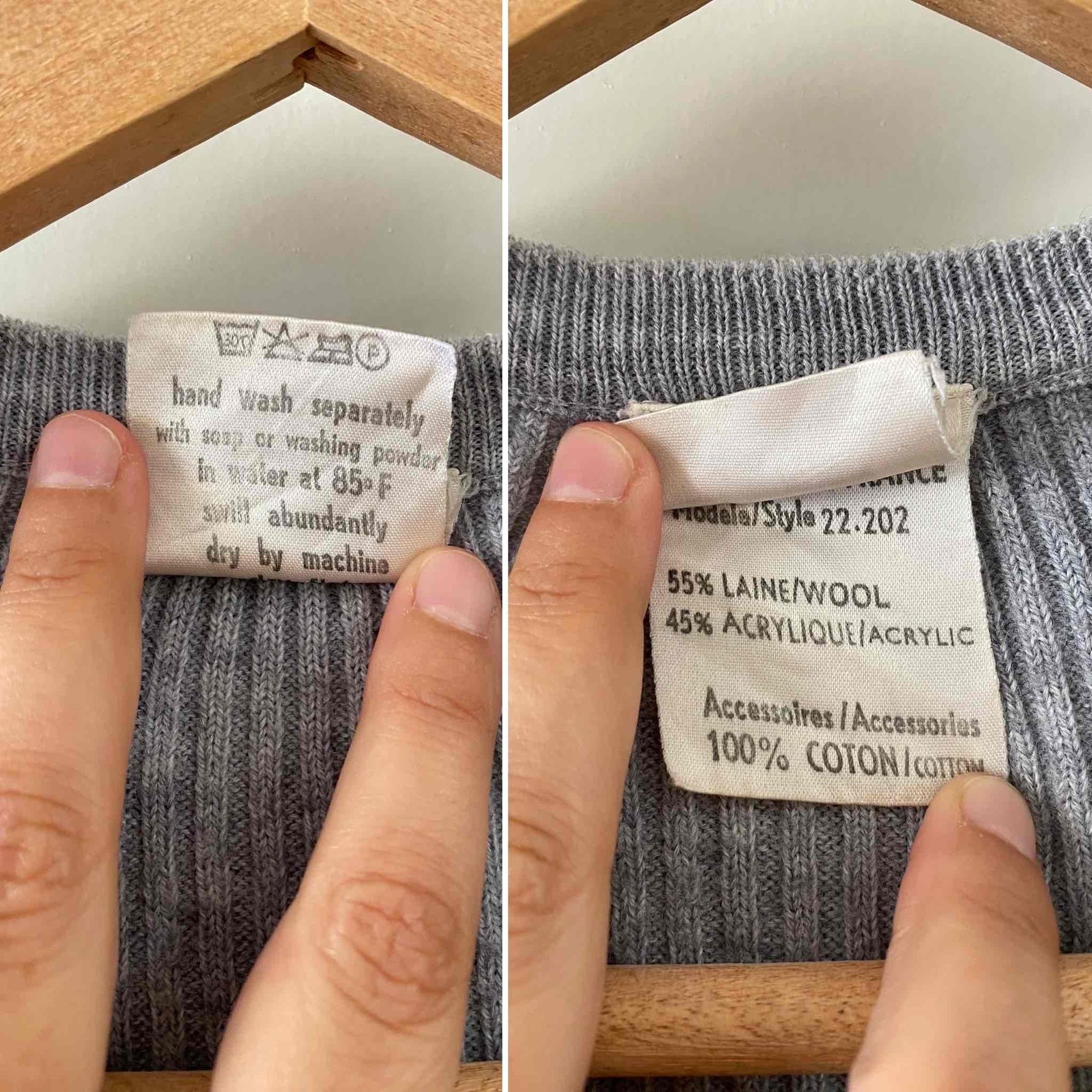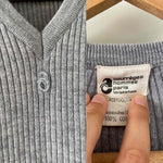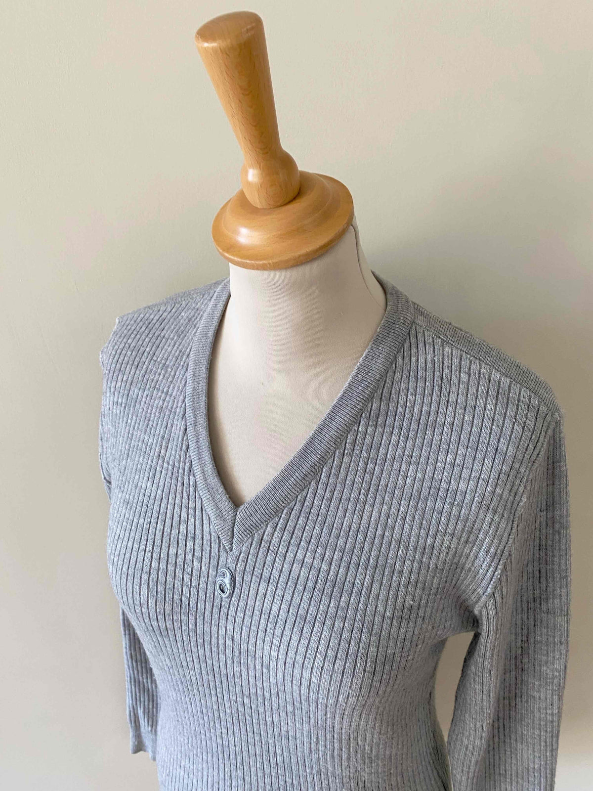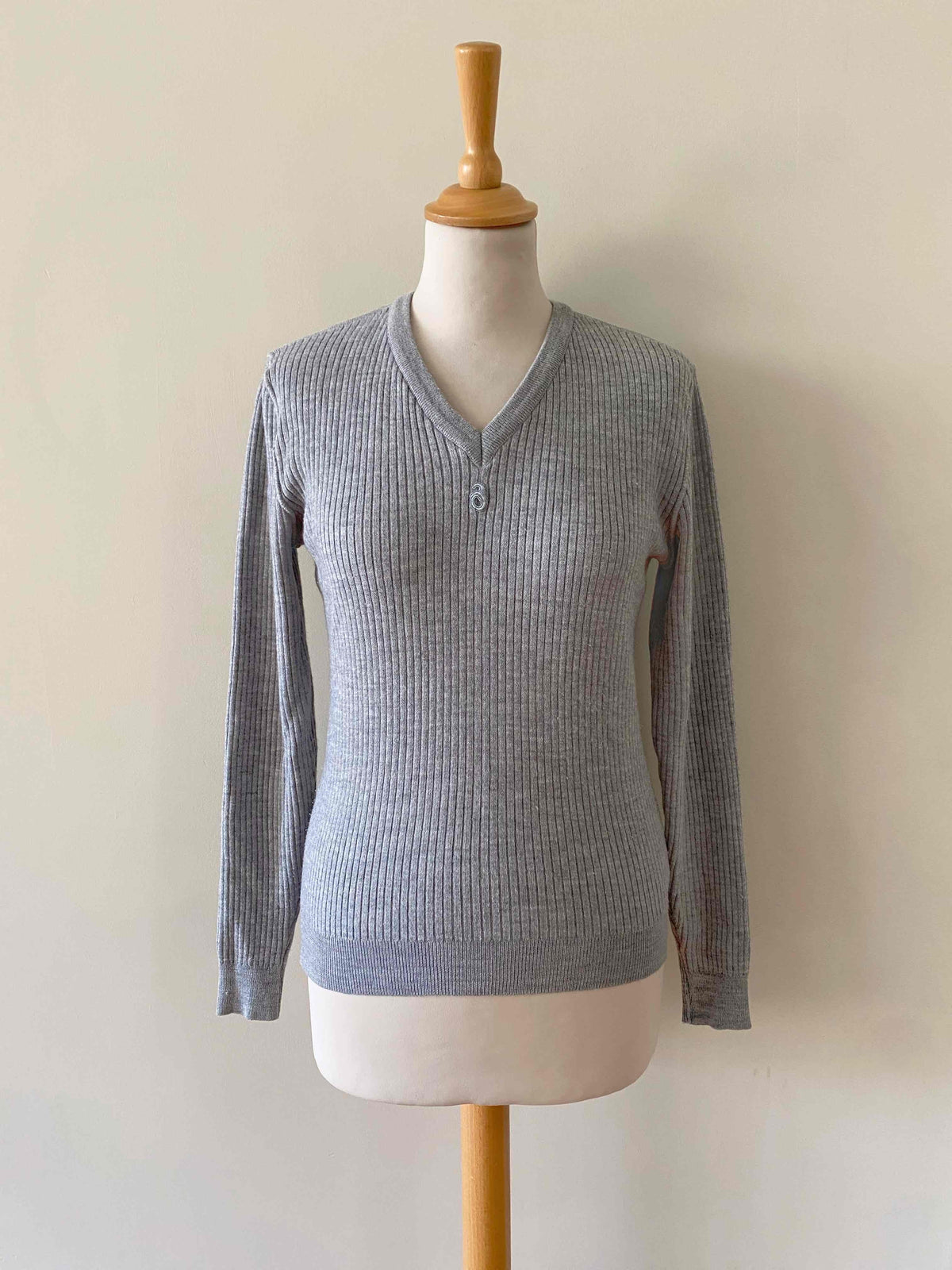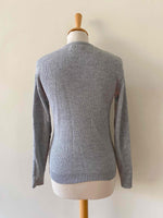 Prix unitaire parPull Courrèges, en maille côtelée laine mélangée gris chiné clair, col V, manches longues, fabriqué en France, taille 36 porté ici sur un mannequin T36.
