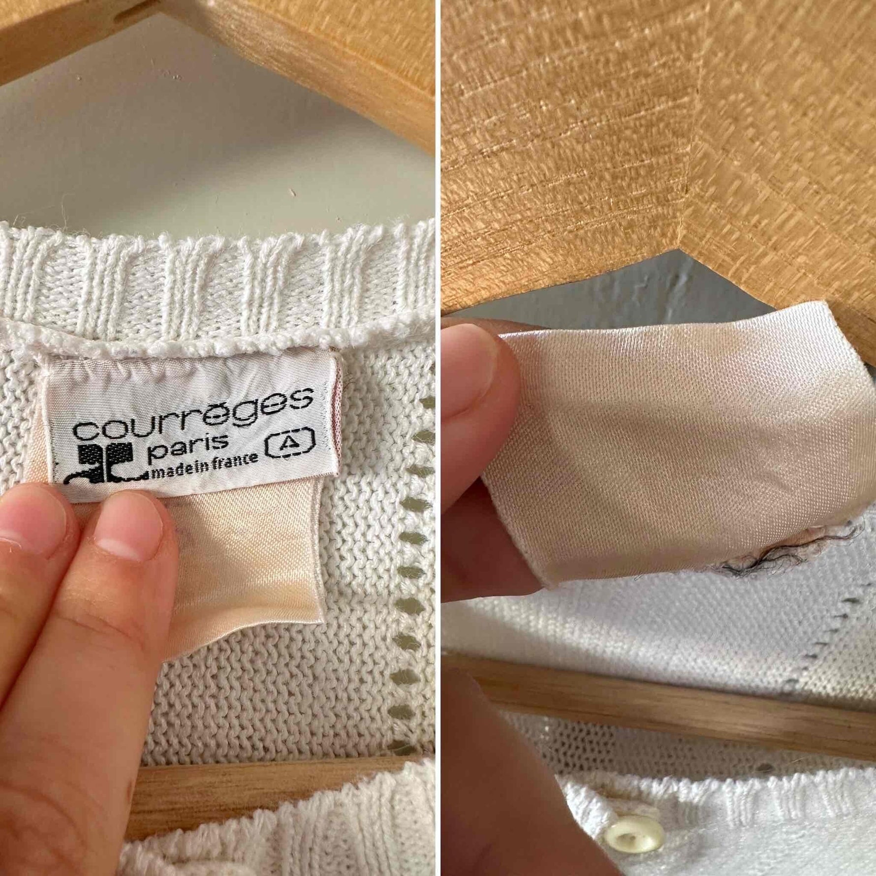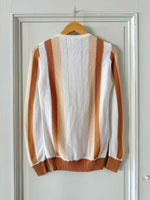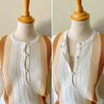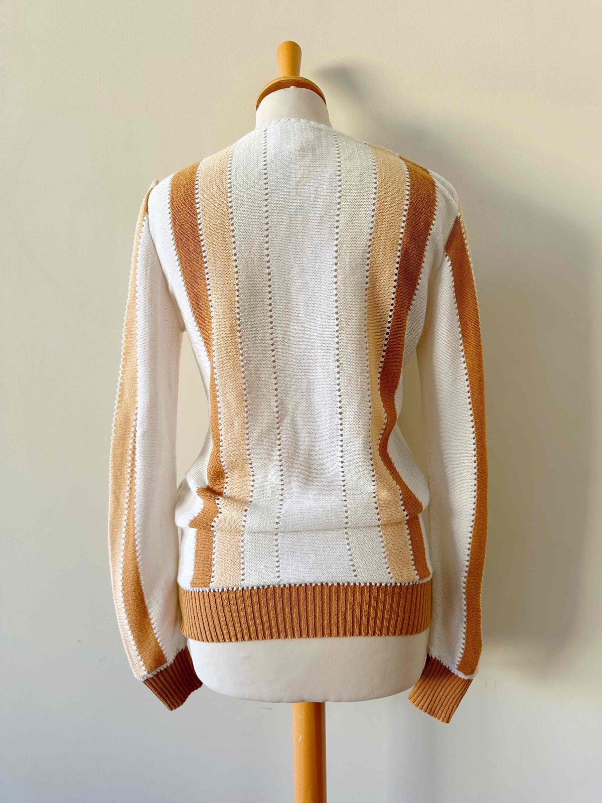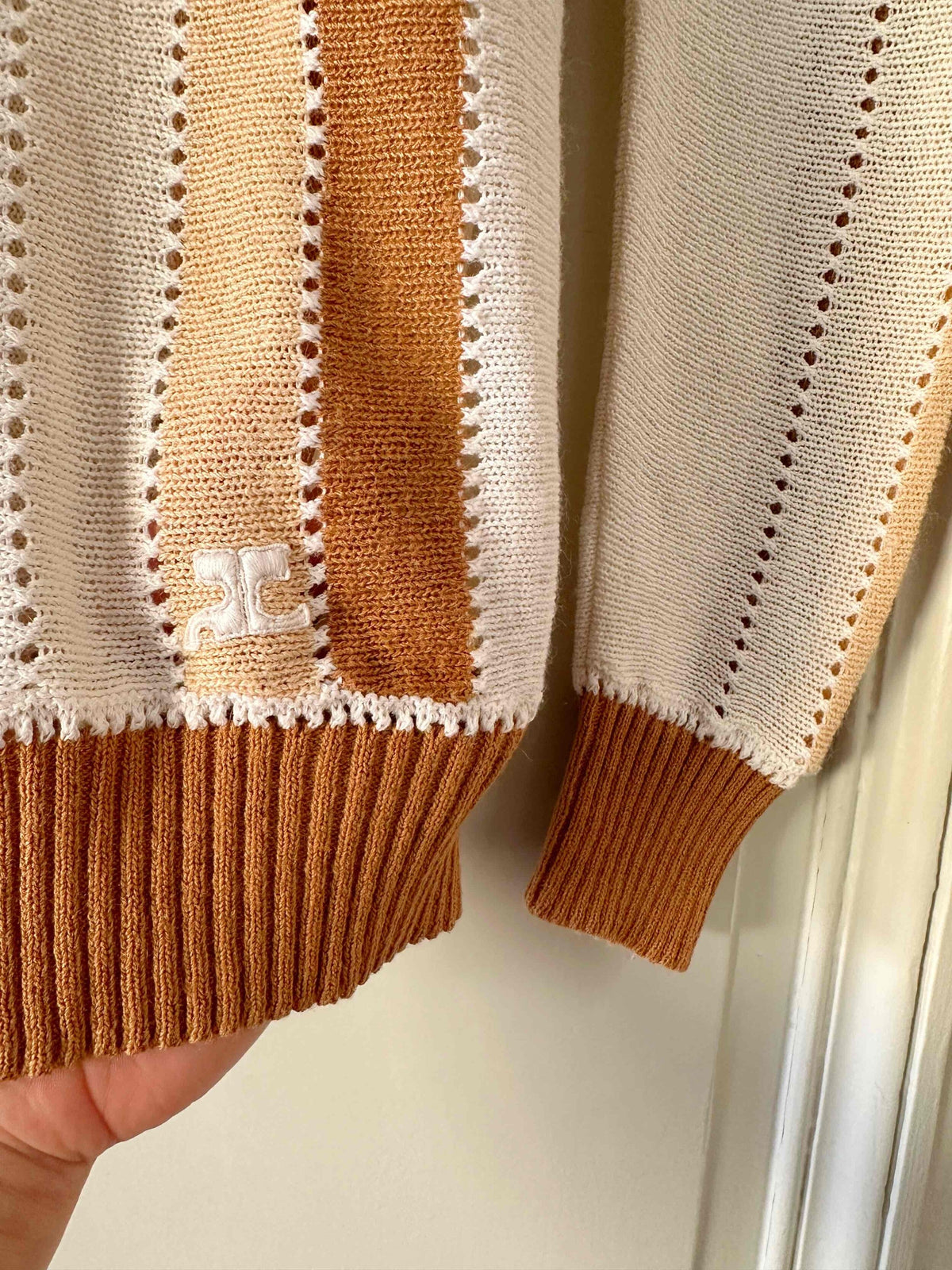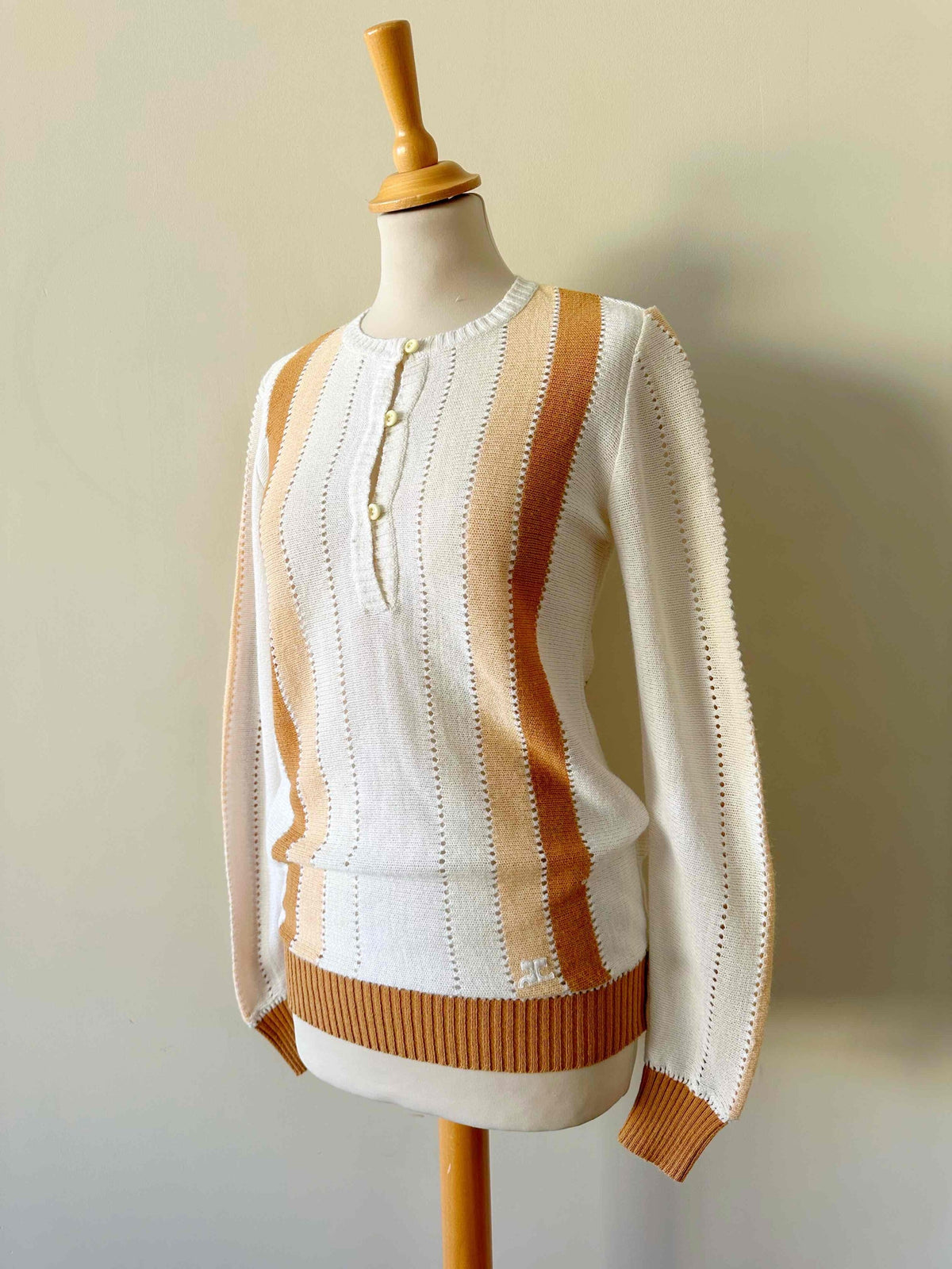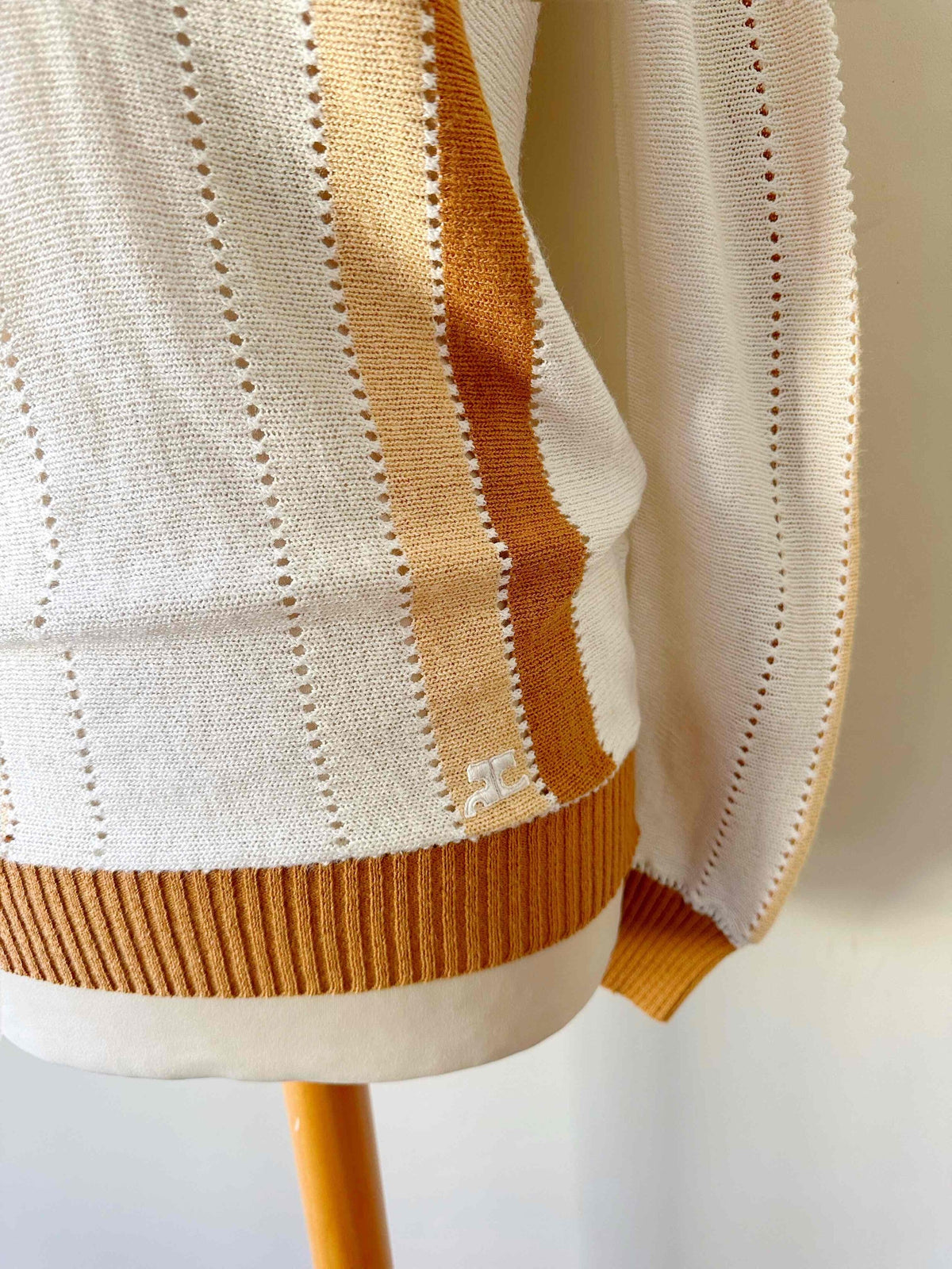 Pull Courreges en coton ajouré façon crochet, blanc à rayures beiges rosés et caramel, col boutonné, logo brodé en bas, fabriqué en France, années 70s, taille 36 porté ici sur un mannequin T36.